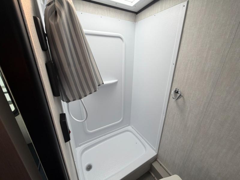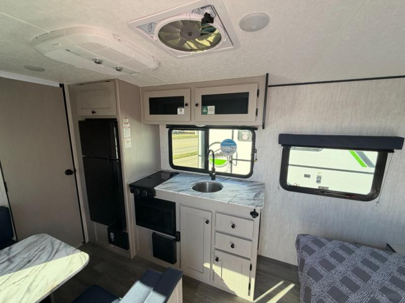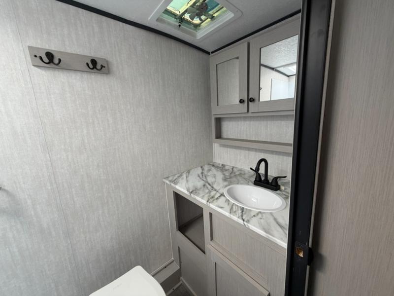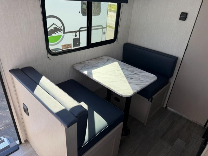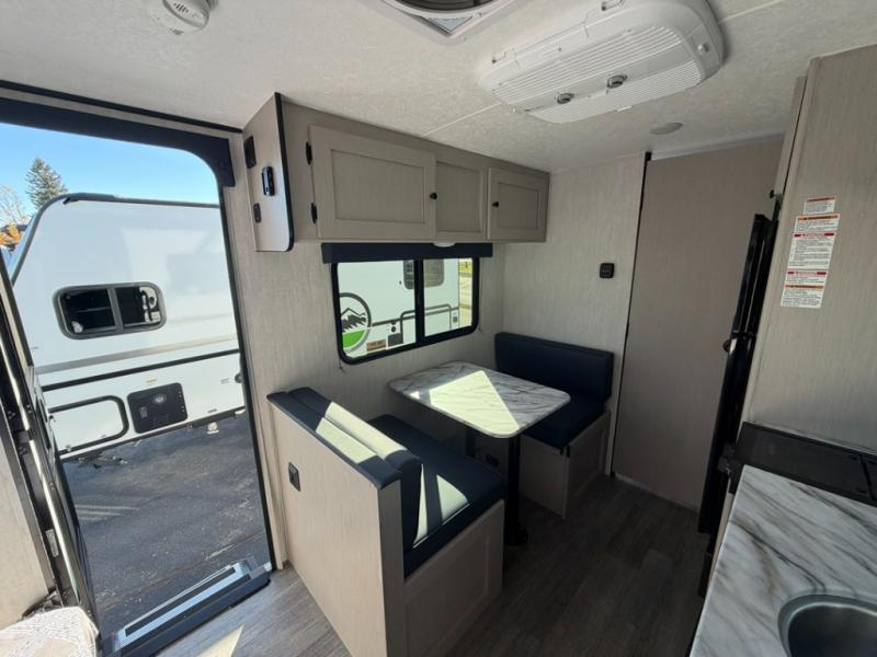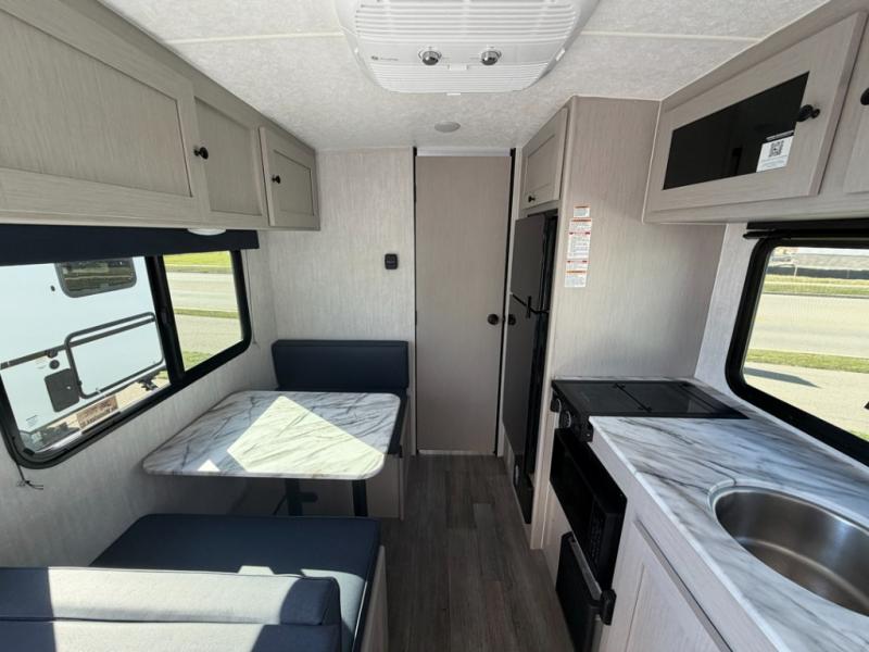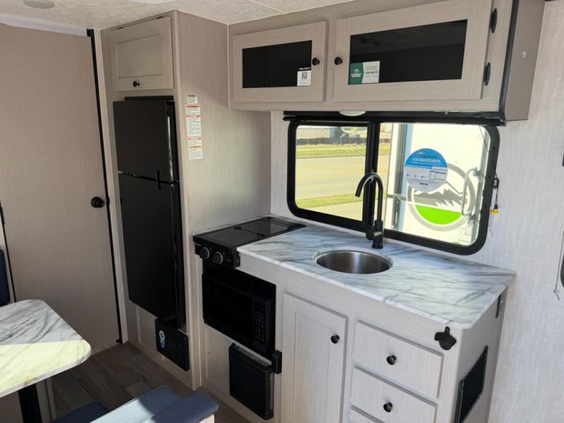 Enjoy camping in this cute Remote trailer features a rear full bath including shower with skylight for more natural lighting, a vanity with sink, and overhead storage. A 54" x 74" bed will be waiting for two of you to provide a comfortable night's rest, and if you have a third camper you can convert the booth dinette for sleeping for one more, or maybe two small children. Dine inside at the booth dinette and play card games at the table, or enjoy spending time outside under the 13' power awning with LED light. You can even cook burgers and dogs while enjoying nice weather with the help of the outdoor cast iron griddle.