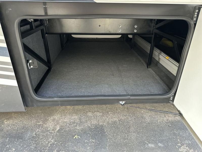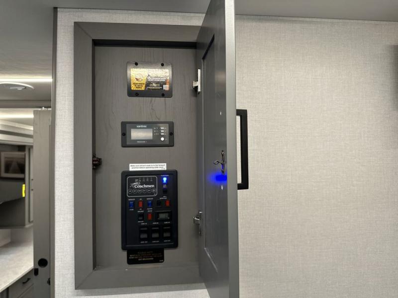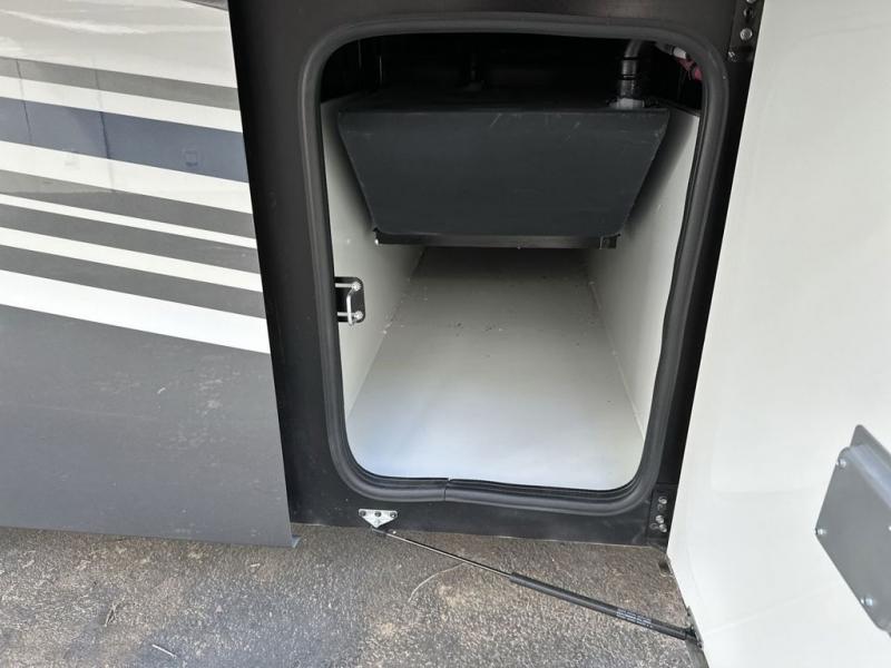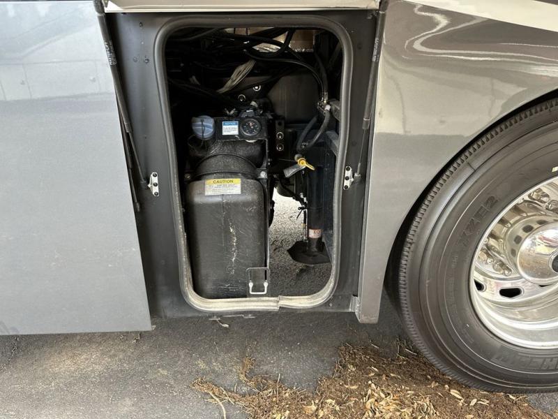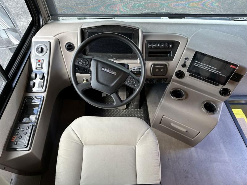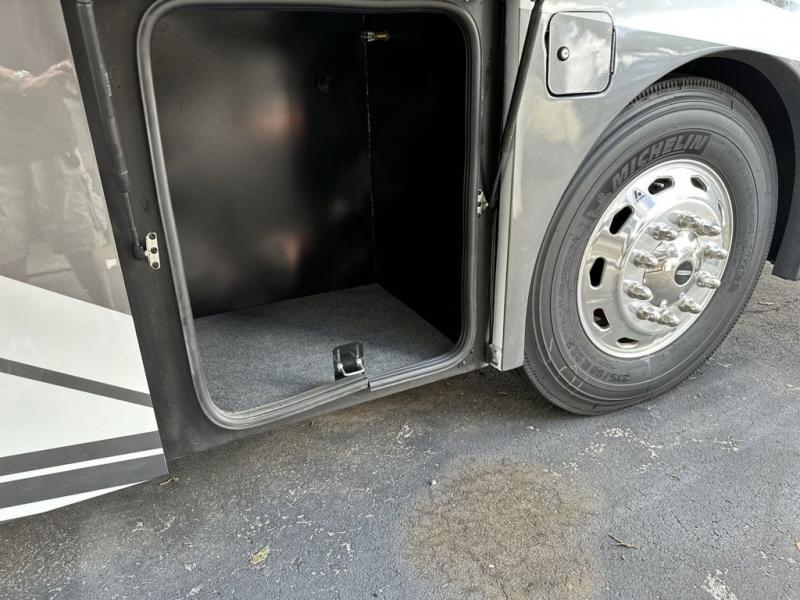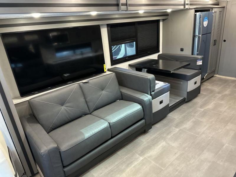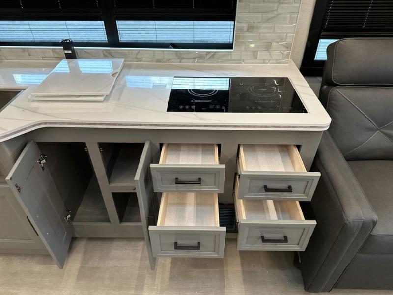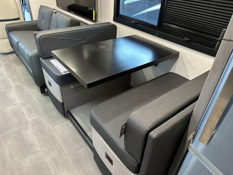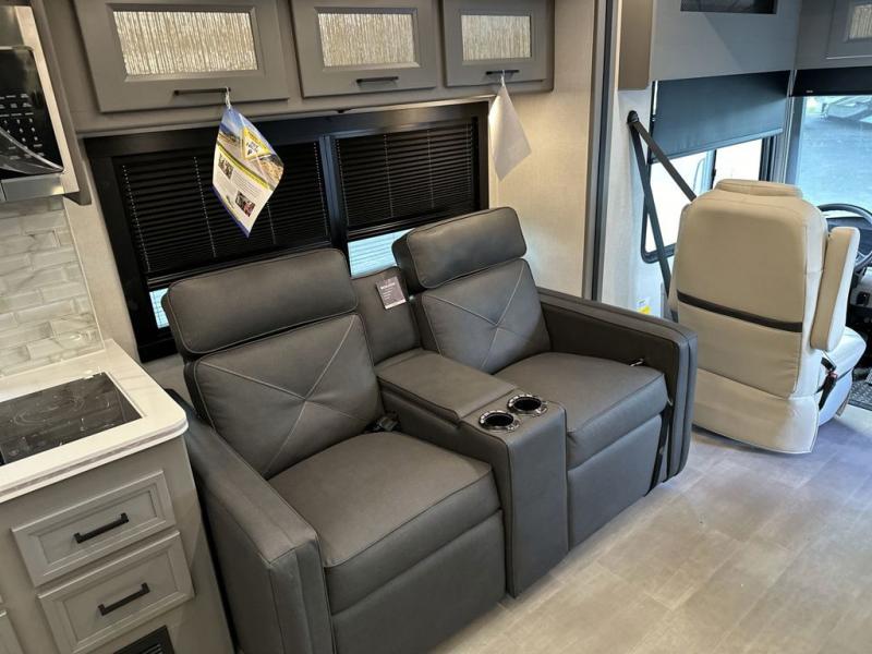 You won't believe all that this motorhome has to offer! Starting with the full rear bathroom which has a 38" x 26" shower to clean up in, a linen closet, and a pantry with washer/dryer option, plus it leads directly into the master suite. Here you will find a king bed slide with a CPAP station above it and across from a dresser with wardrobes on either side and a 32" LED TV to watch your movies in true relaxation. The convenient half bathroom is centrally located so guests can easily use it when needed. At night, you can either relax on the 68" sofa or the theater seating across from the LED TV, and if you need more sleeping space, the drop-down overhead bunk is sure to be a big hit