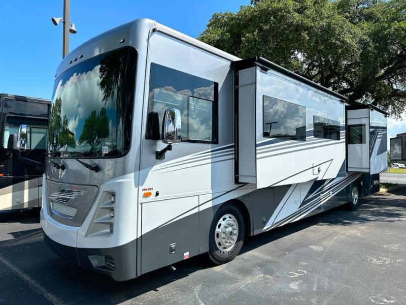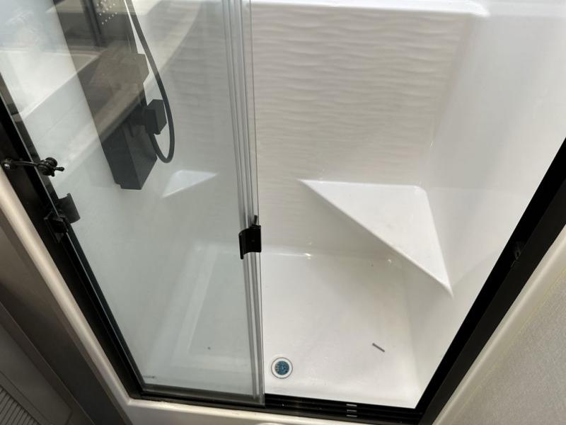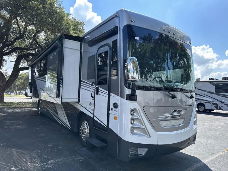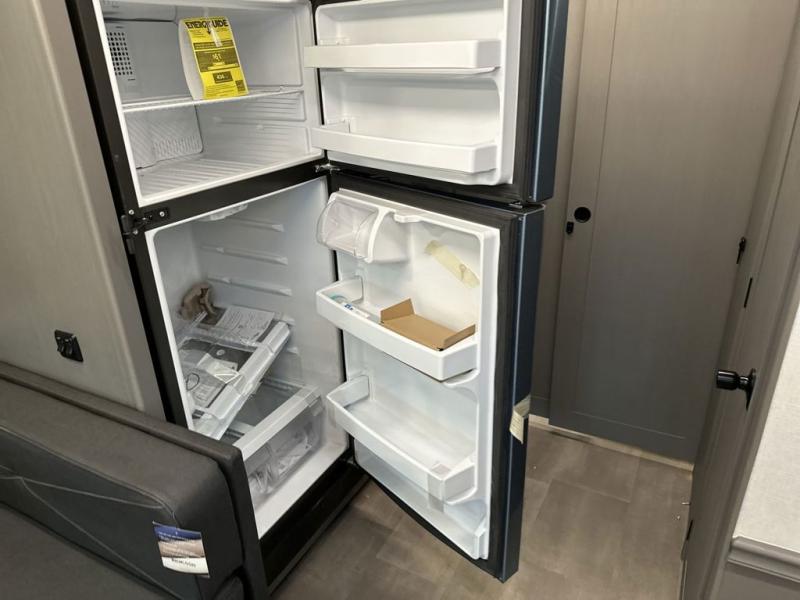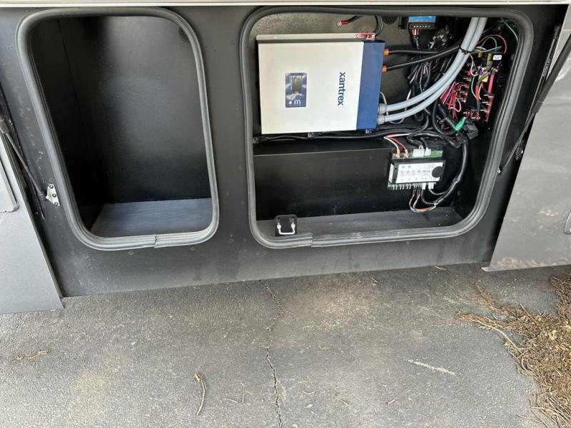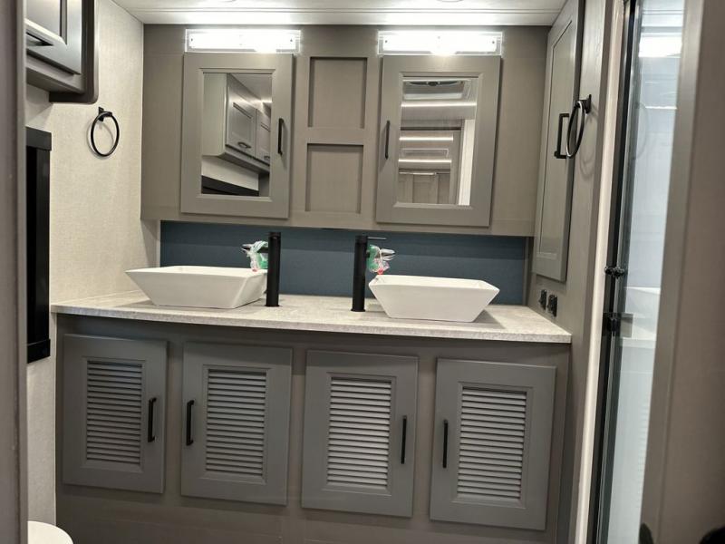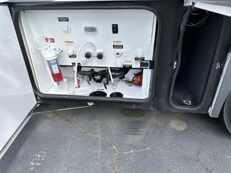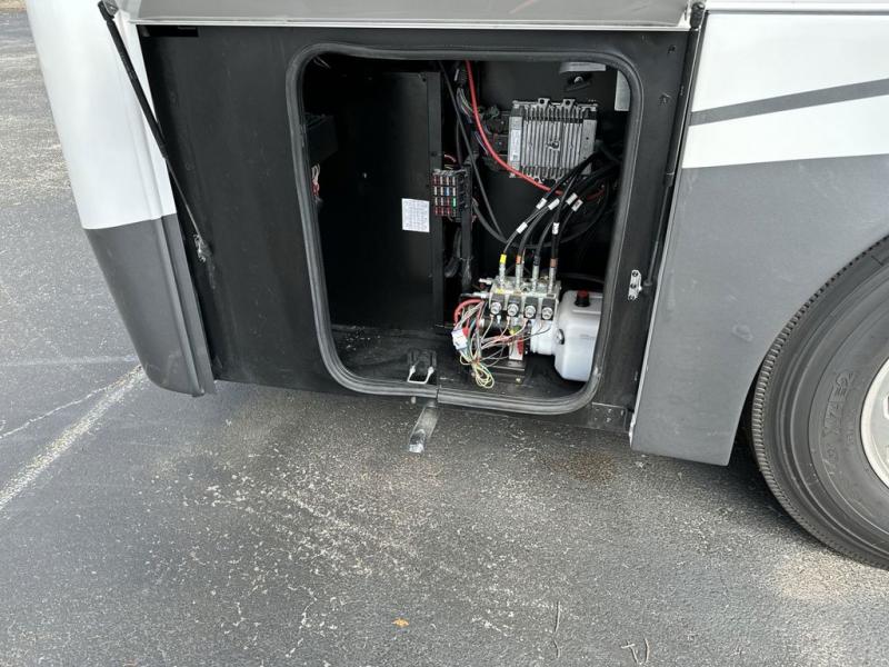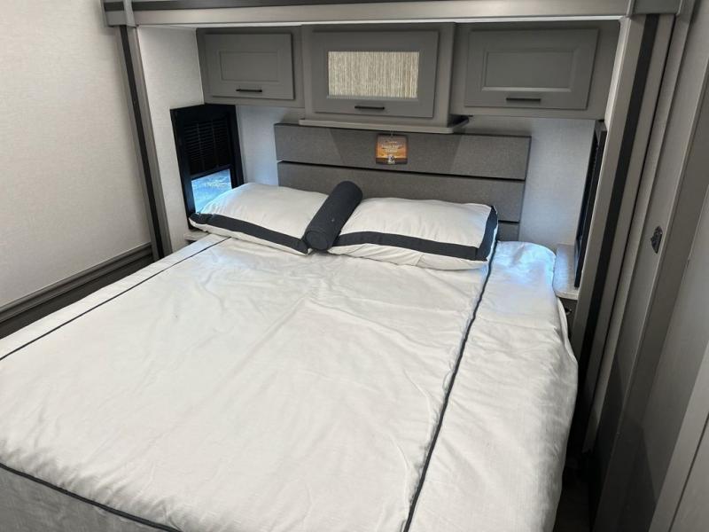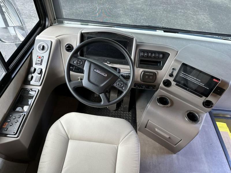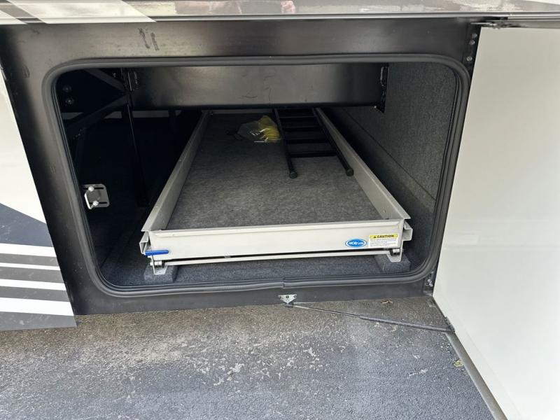 You won't believe all that this motorhome has to offer! Starting with the full rear bathroom which has a 38" x 26" shower to clean up in, a linen closet, and a pantry with washer/dryer option, plus it leads directly into the master suite. Here you will find a king bed slide with a CPAP station above it and across from a dresser with wardrobes on either side and a 32" LED TV to watch your movies in true relaxation. The convenient half bathroom is centrally located so guests can easily use it when needed. At night, you can either relax on the 68" sofa or the theater seating across from the LED TV, and if you need more sleeping space, the drop-down overhead bunk is sure to be a big hit