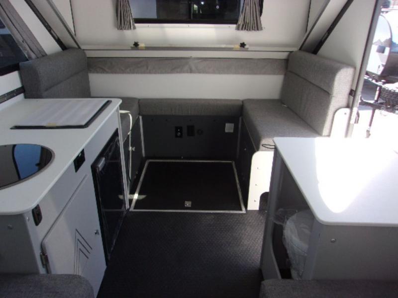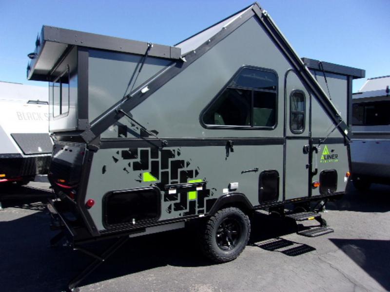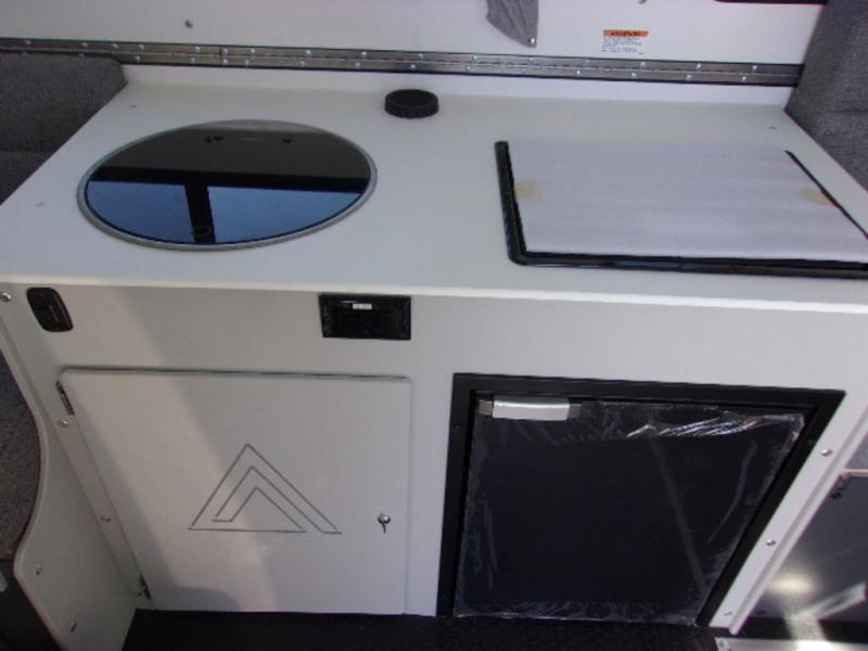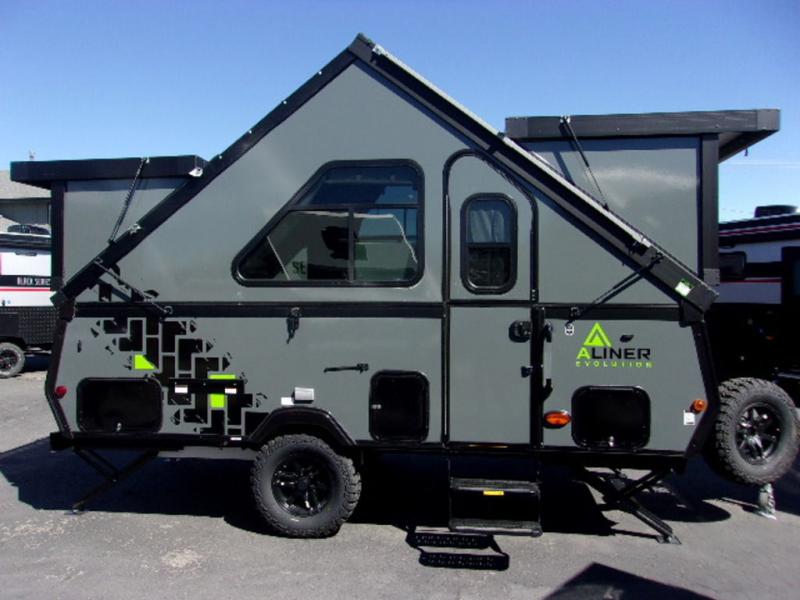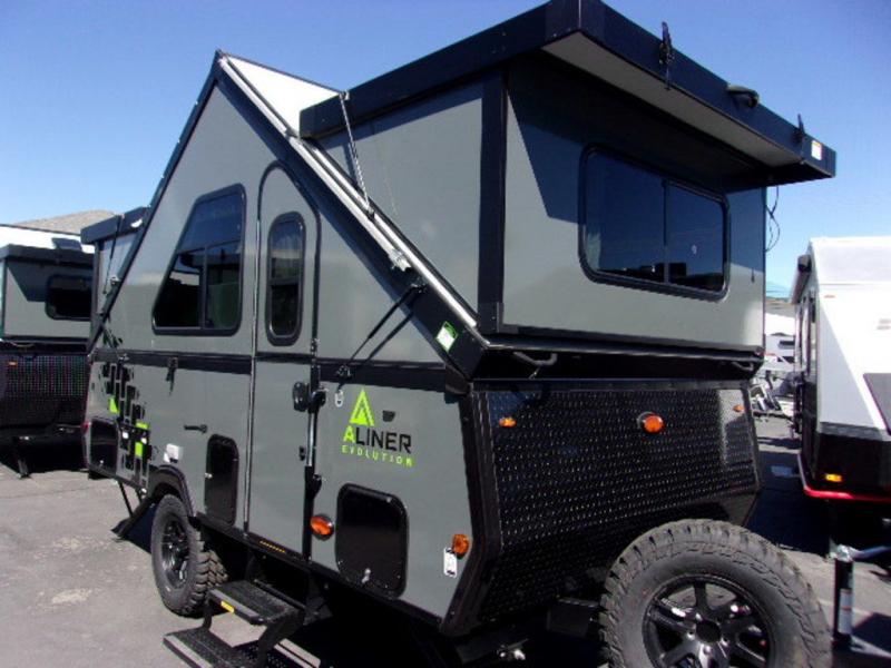 The Evolution A-frame camper by ALiner is coming to you with residential features and solid construction materials. You'll love the slate gray exterior, and the Azdel composite panels included help prolong the life of your camper. There are 15" off-road tires with graphics package, LED running lights, exterior baggage doors, plus many more exterior conveniences. The Evolution A-Frame camper comes with commercial grade, raised coin polyvinyl flooring, SIMONA BOATBOARD interior cabinets and furniture, and three indoor electrical outlets to name a few interior comforts.