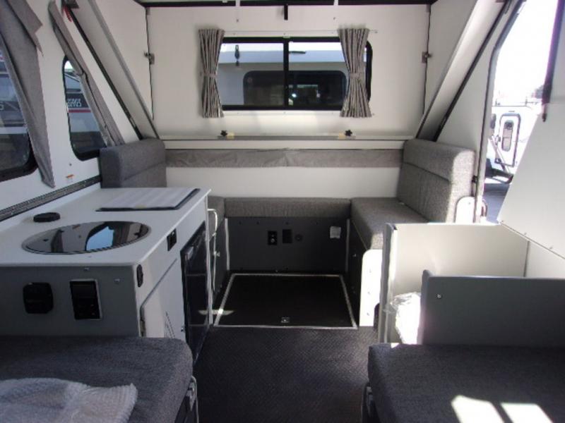 Two to four, depending on size can easily camp in this twin bed model featuring two 30" x 80" twin beds in the rear of the unit. There is a two burner cooktop to make lunch on and a 3.0 cu. ft. 3-way refrigerator with a freezer for your cold items, and you can add the optional outside grill if you like to cook outdoors! The dinette converts to a 40" x 80" bed for one or two more tired campers. You'll find storage space under the dinette for your things and the cassette toilet is quite handy especially at night. This model also has a dry weight of 2,400 lbs. for easy towing!