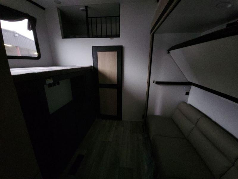 If you enjoy camping with a larger group of family or friends, this fifth wheel is perfect for you! Since there are two full baths, a front private bedroom, and a private bunkhouse suite, everyone can have their own space! The king bed slide in the front bedroom is sure to bring comfort, and you'll find a dresser and large front closet for your things. Washer and dryer prep is also found here if you want to add those appliances. The bunkhouse features a 38" x 74" bunk across from a jack knife sofa and second bunk bed plus a bunk mat under the sofa. There is also bunk mat above the full rear bath, allowing you to sleep five here! Everyone will love to meet in the combined kitchen and living room on the quad theater seat as the chef prepares dinner. A kitchen island with a flip-up island extension and two seats provides even more counter space, plus there are two pantries and a residential refrigerator for ample food storage. If the weather is nice, you may just find yourselves outdoors since there is an outside kitchen and 14' power awning with LED lights!