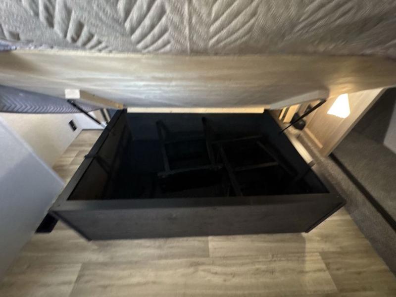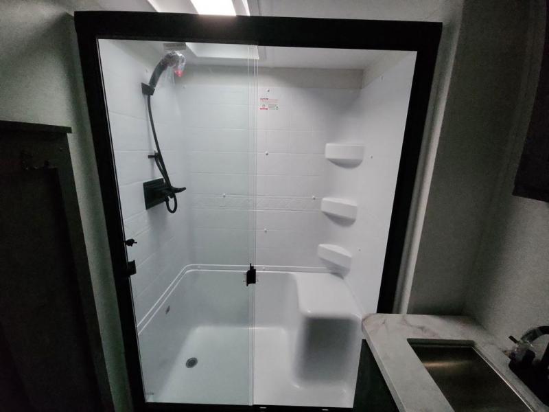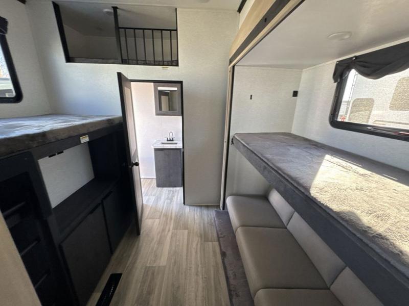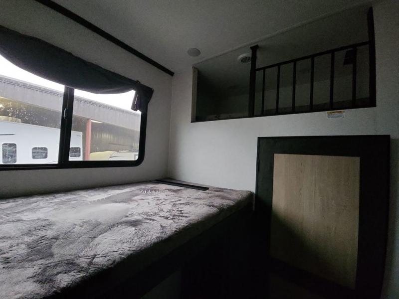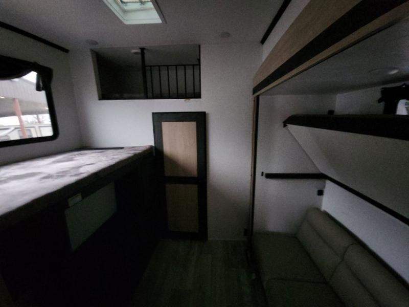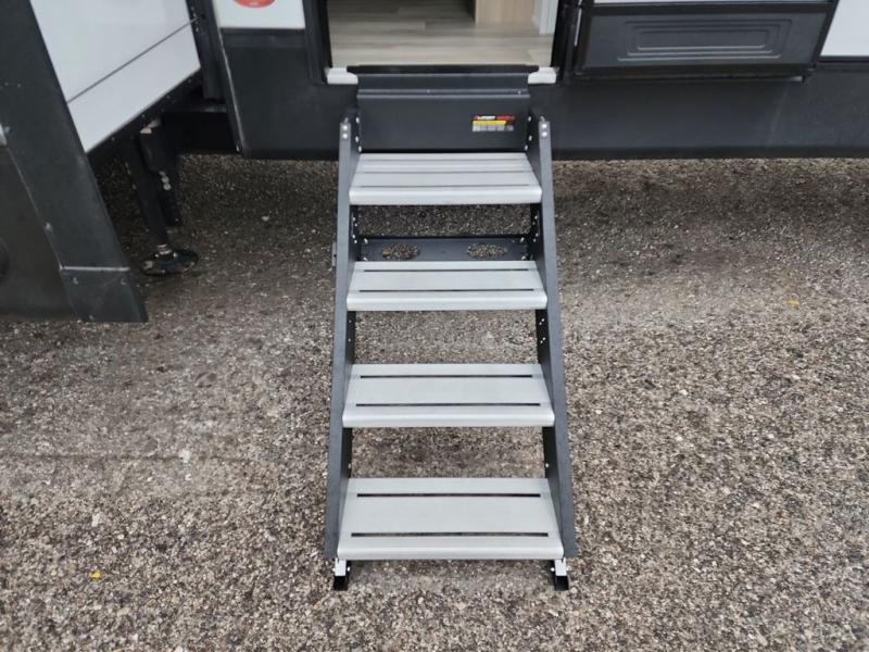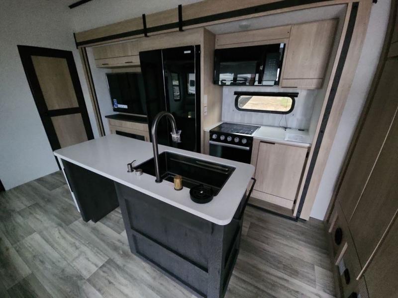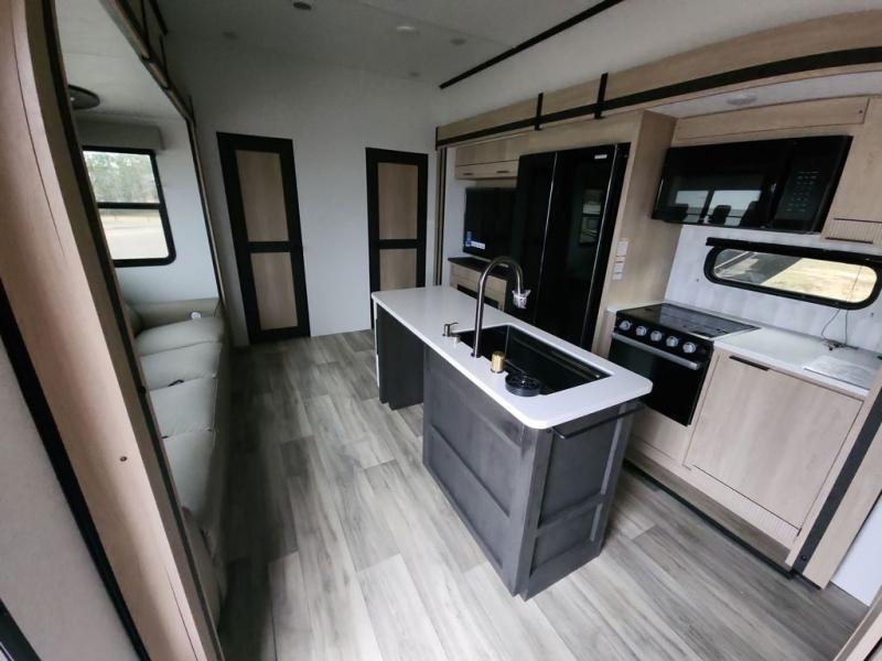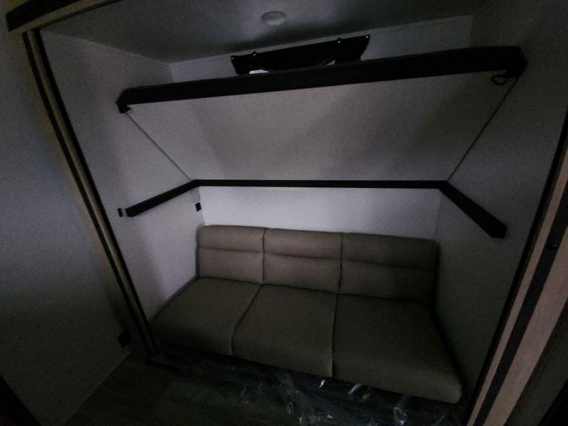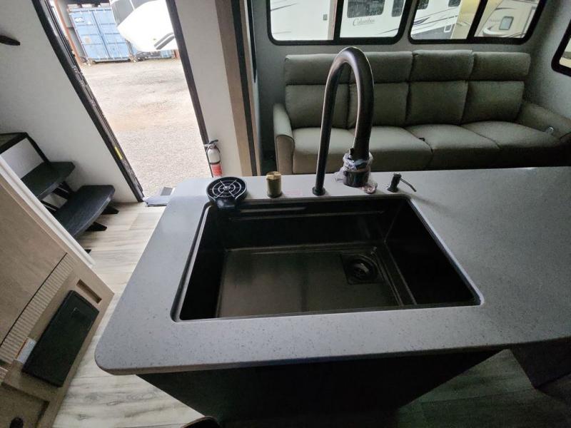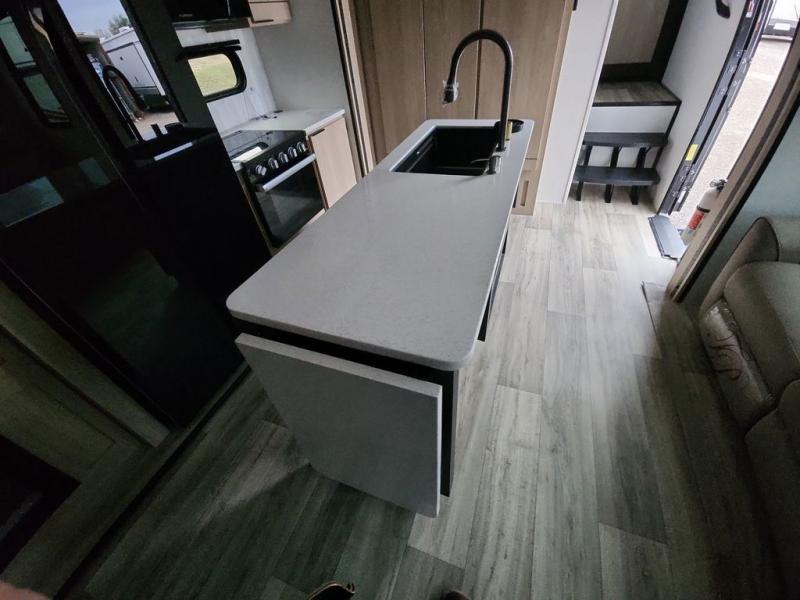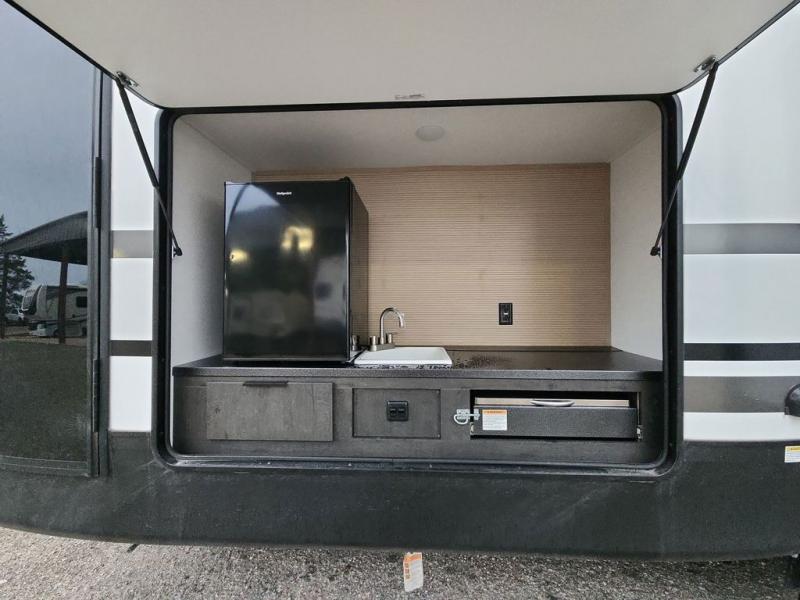 If you enjoy camping with a larger group of family or friends, this fifth wheel is perfect for you! Since there are two full baths, a front private bedroom, and a private bunkhouse suite, everyone can have their own space! The king bed slide in the front bedroom is sure to bring comfort, and you'll find a dresser and large front closet for your things. Washer and dryer prep is also found here if you want to add those appliances. The bunkhouse features a 38" x 74" bunk across from a jack knife sofa and second bunk bed plus a bunk mat under the sofa. There is also bunk mat above the full rear bath, allowing you to sleep five here! Everyone will love to meet in the combined kitchen and living room on the quad theater seat as the chef prepares dinner. A kitchen island with a flip-up island extension and two seats provides even more counter space, plus there are two pantries and a residential refrigerator for ample food storage. If the weather is nice, you may just find yourselves outdoors since there is an outside kitchen and 14' power awning with LED lights!