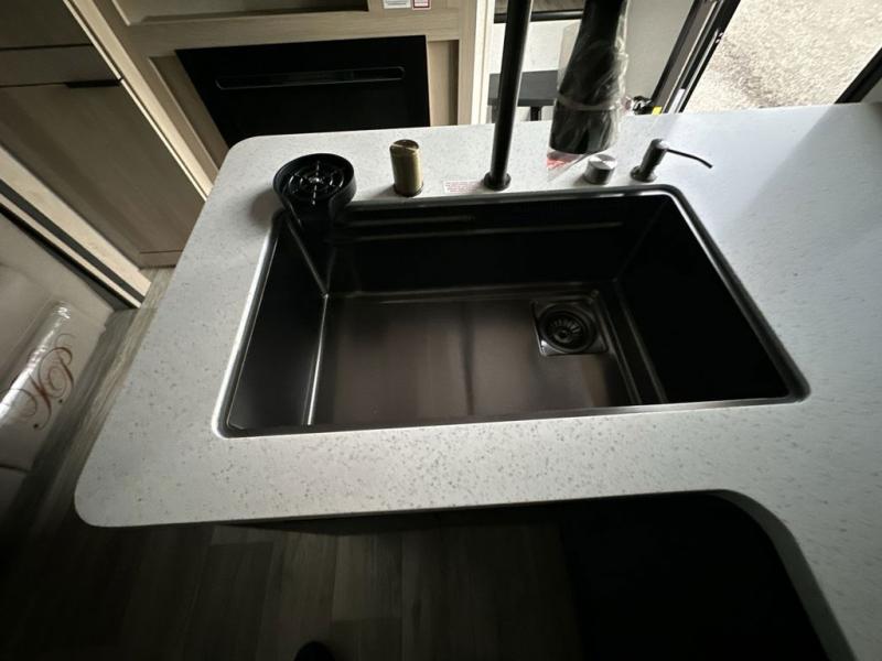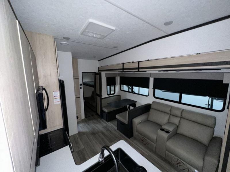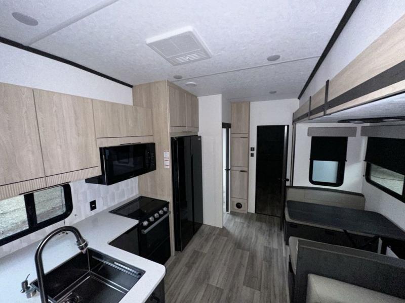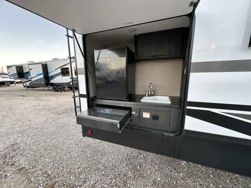 If you've been dreaming of camping with friends and family, take a look at this fifth wheel that can sleep nine people each night. The little ones will spend their time in the private bunkhouse when they're not outside riding their bikes. The half bath includes its own exterior entry door so your guests won't drag dirt through the whole trailer just to use the restroom, and the second entry door conveniently leads into the main living area. Here, you can relax on the booth dinette and tri-fold sofa within the large slide out, and if you're wanting even more comfort, just choose the optional power theatre seats in place of the tri-fold sofa. You will find all the appliances indoors to prepare meals each day, plus there is an exterior kitchen that will be perfect when frying fish or bacon!