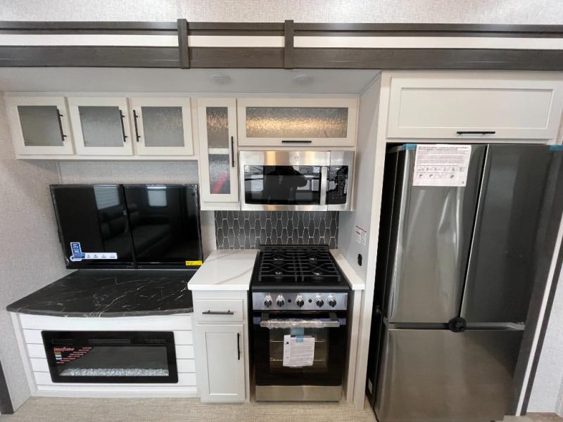 You can comfortably sleep seven people in this destination trailer, so invite more friends along! The little ones are sure to love the loft areas above the bedroom and bathroom. You will have the front private bedroom all to yourselves with a king bed slide out and plenty of space to relax and store your things. If you have any other guests, they can sleep on the hide-a-bed sofa at the back of the trailer. You will find everything you need in this residential kitchen with an island, an Insignia four burner cooktop, plus a double door pantry with shelves. And when your day is over you can relax in the rear living area on the theater seating across from the 50" lift TV and fireplace!