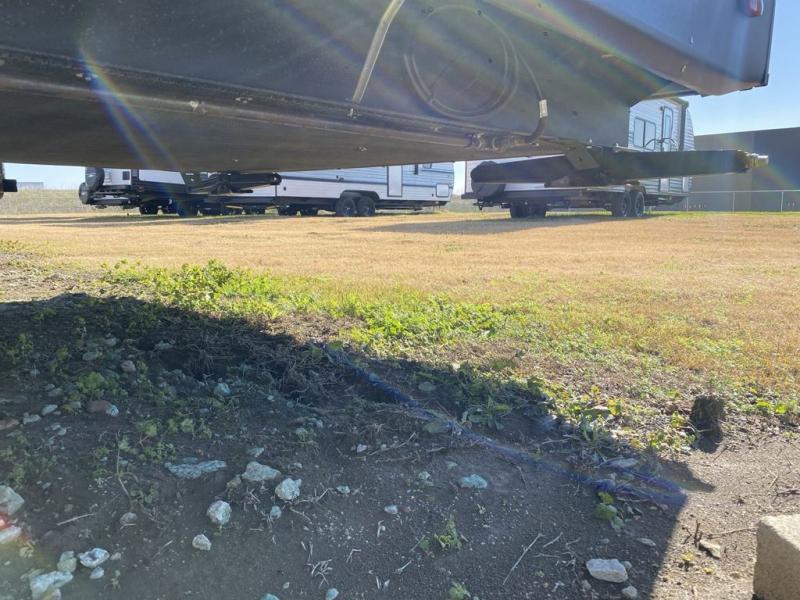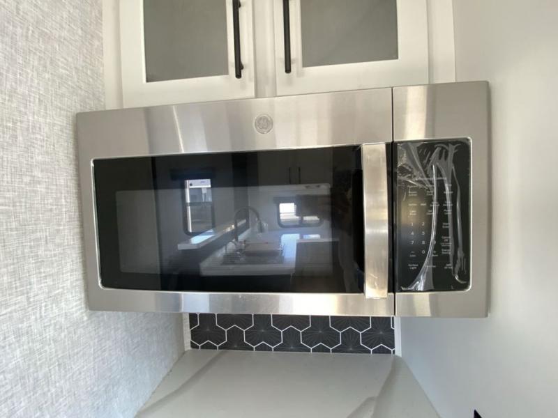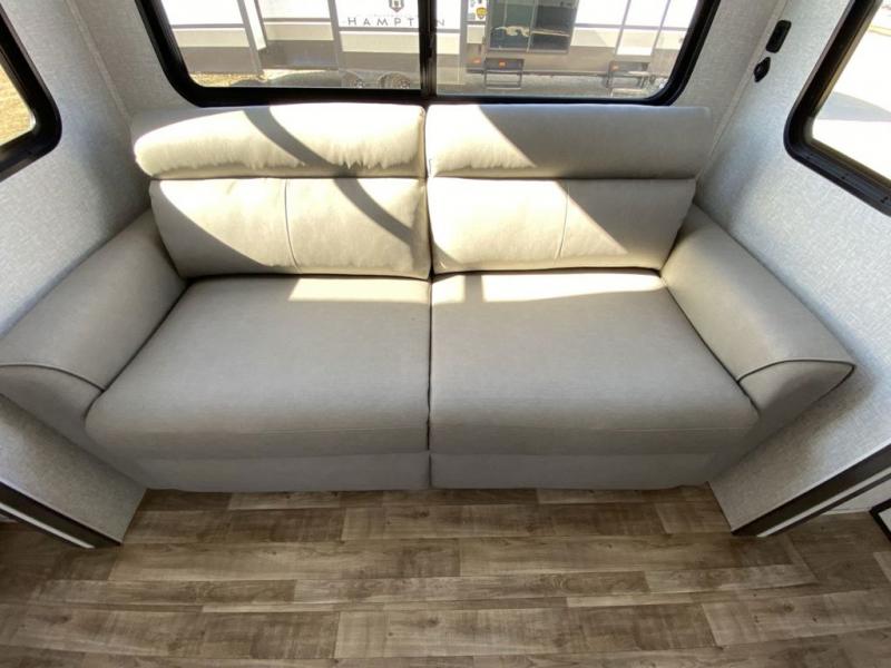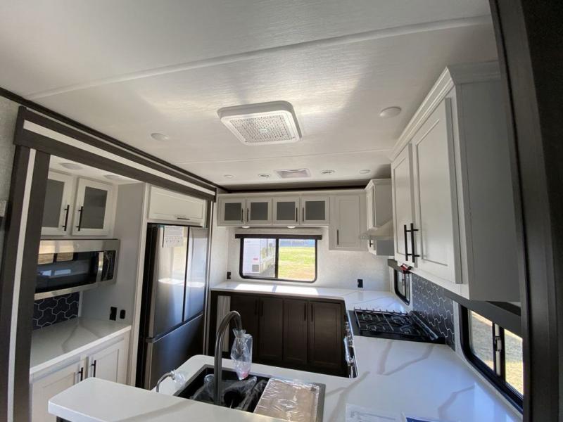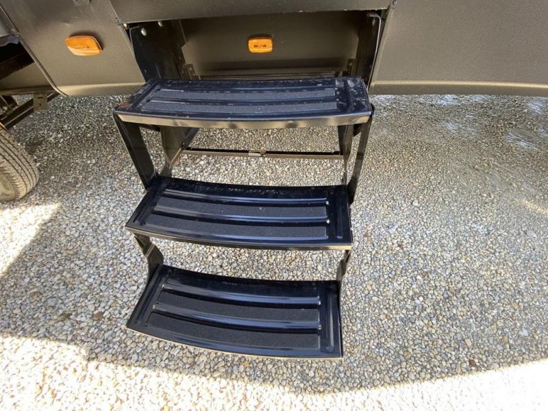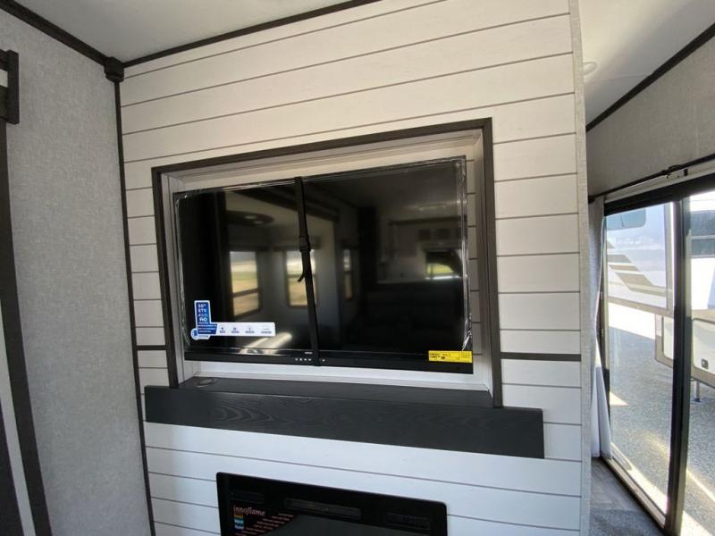 Extended stays in this destination trailer are made complete with family and friends. The chef of your group will love the spacious rear kitchen with plenty of overhead cabinets, a pantry/cabinet, plus a four burner cooktop. Everyone can be visiting in the middle living room while dinner is being made. Here, you'll find a hide-a-bed sofa, theater seating, plus fireplace with a 50" TV. The full bath lets you clean up each day, and the front private bedroom will feel just like home with a king bed slide out and tons of storage space for your necessities.