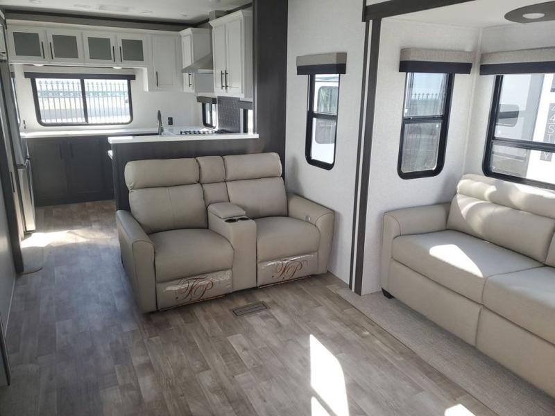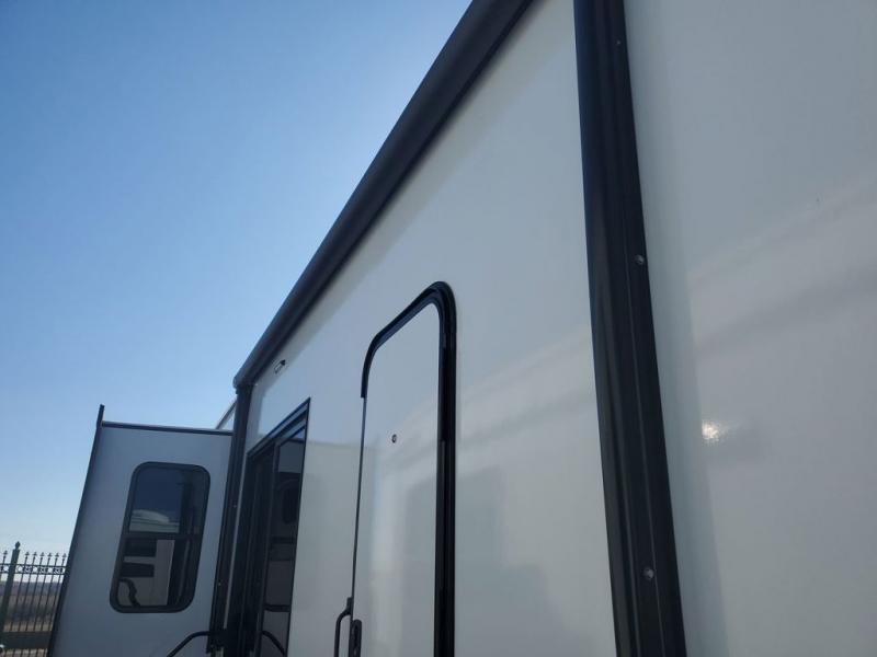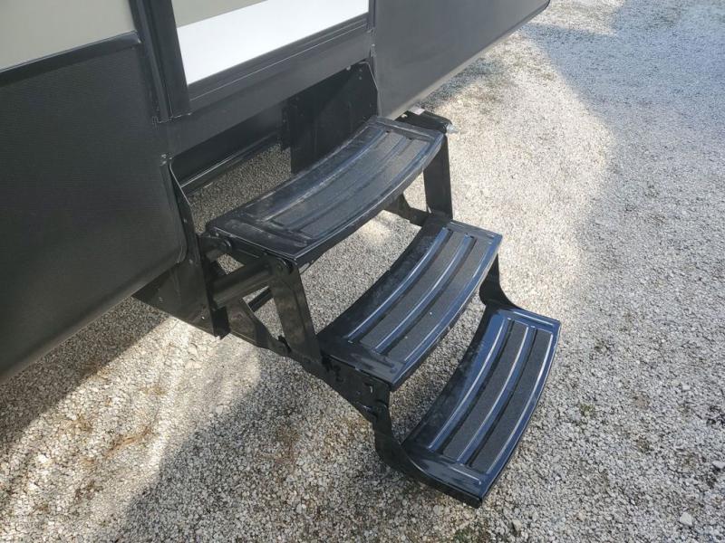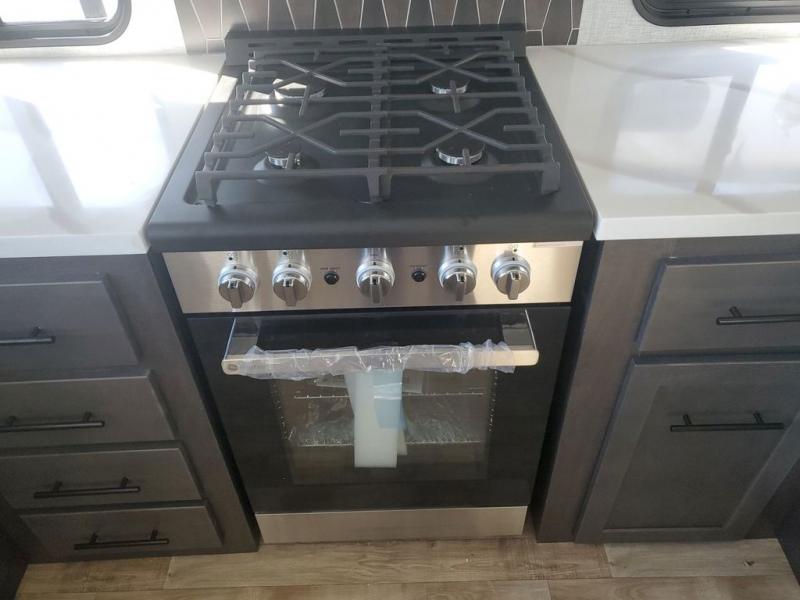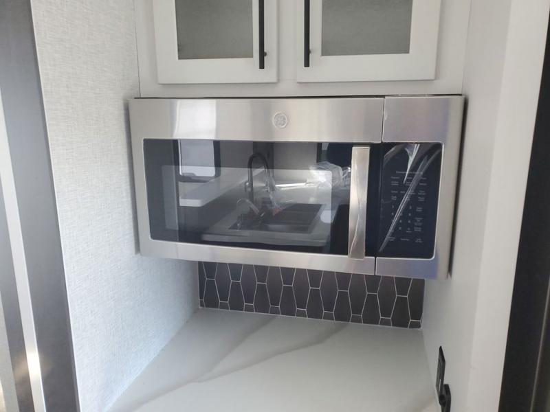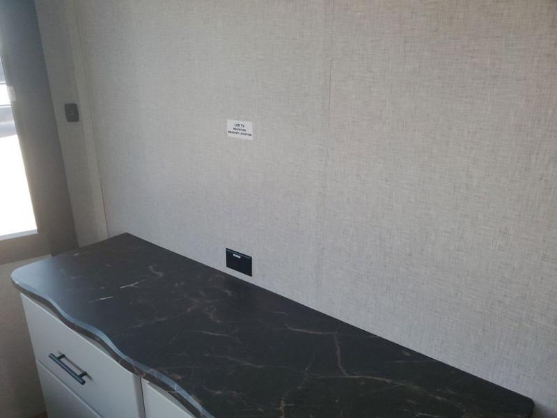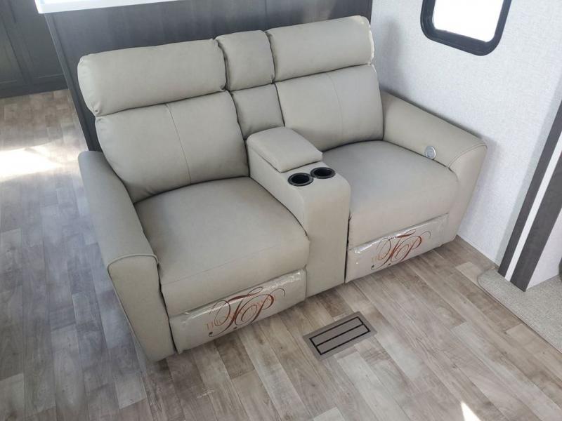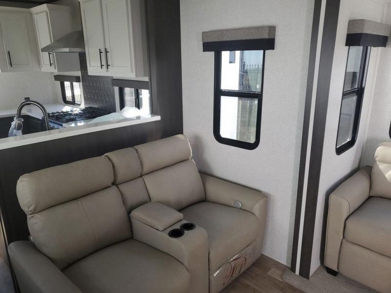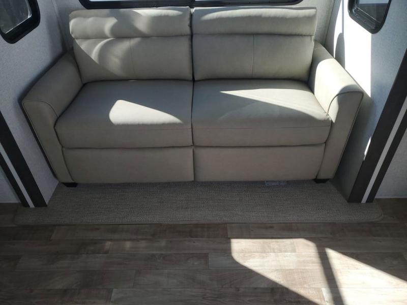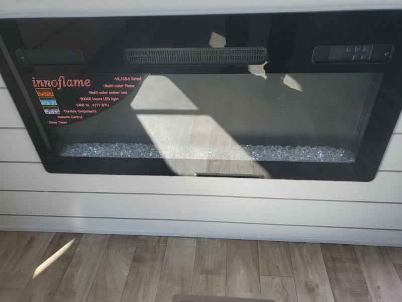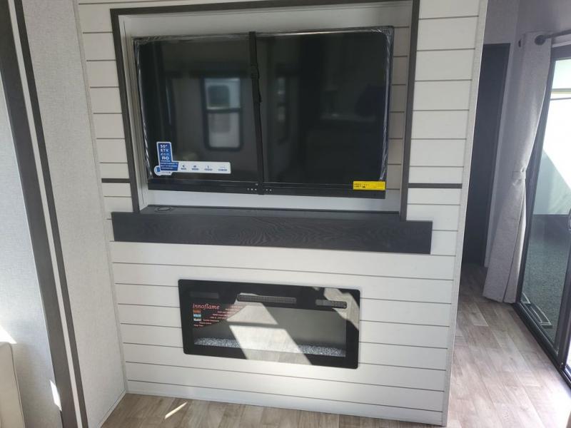 Extended stays in this destination trailer are made complete with family and friends. The chef of your group will love the spacious rear kitchen with plenty of overhead cabinets, a pantry/cabinet, plus a four burner cooktop. Everyone can be visiting in the middle living room while dinner is being made. Here, you'll find a hide-a-bed sofa, theater seating, plus fireplace with a 50" TV. The full bath lets you clean up each day, and the front private bedroom will feel just like home with a king bed slide out and tons of storage space for your necessities.