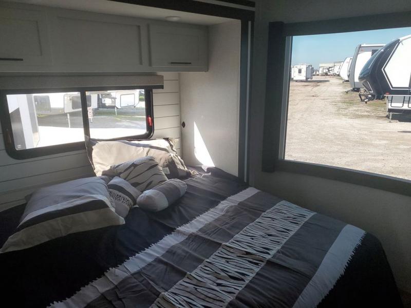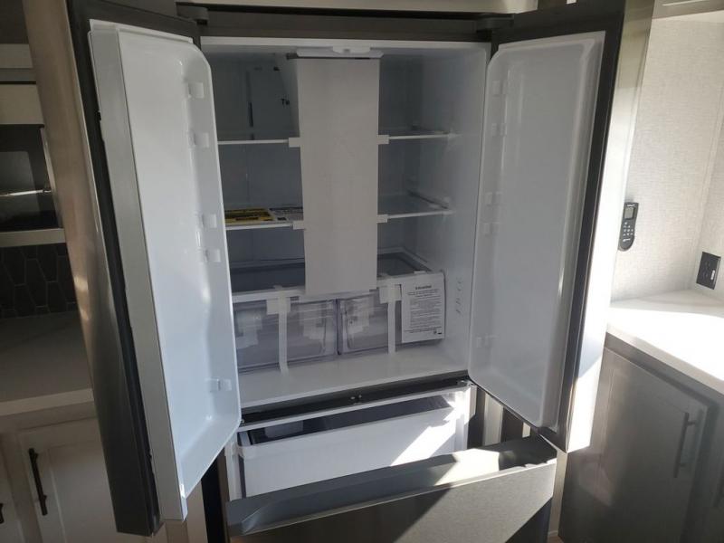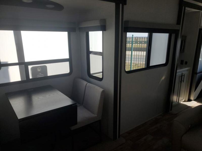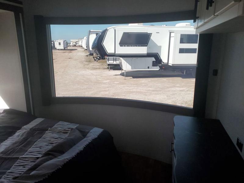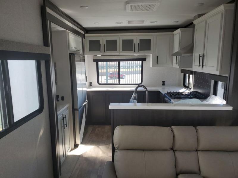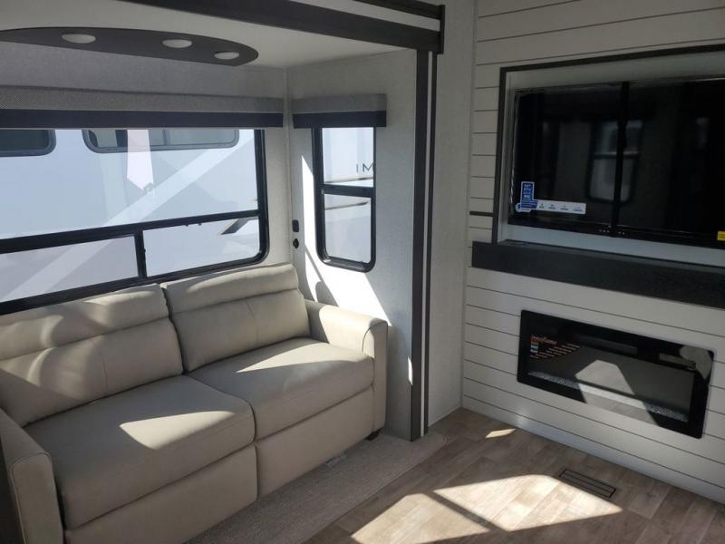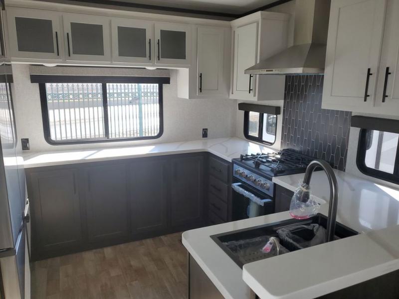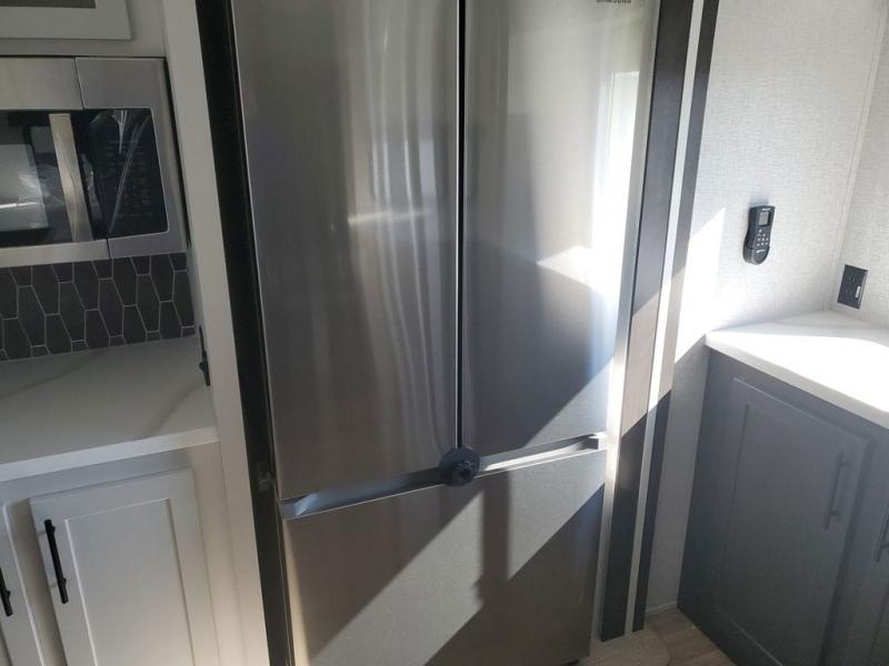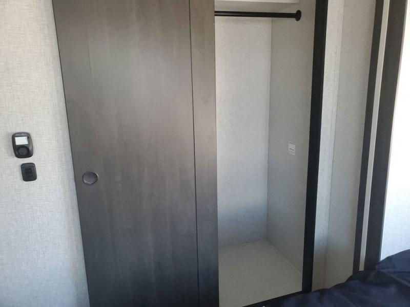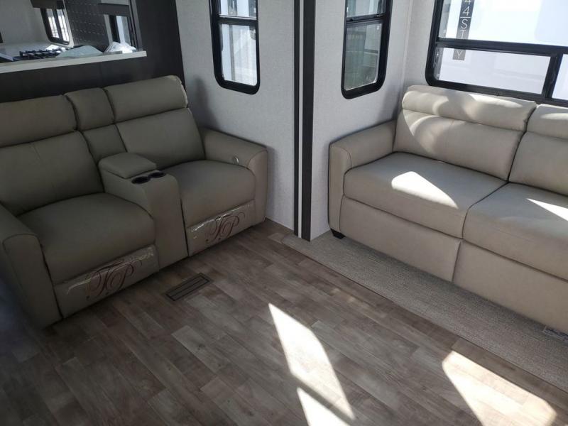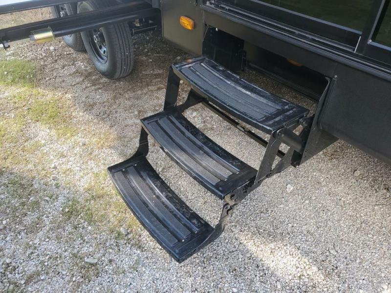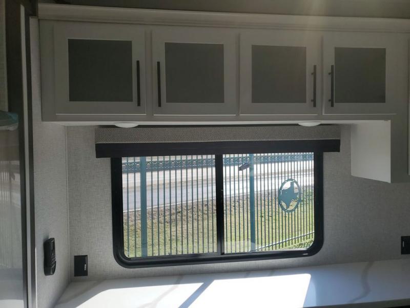 Extended stays in this destination trailer are made complete with family and friends. The chef of your group will love the spacious rear kitchen with plenty of overhead cabinets, a pantry/cabinet, plus a four burner cooktop. Everyone can be visiting in the middle living room while dinner is being made. Here, you'll find a hide-a-bed sofa, theater seating, plus fireplace with a 50" TV. The full bath lets you clean up each day, and the front private bedroom will feel just like home with a king bed slide out and tons of storage space for your necessities.