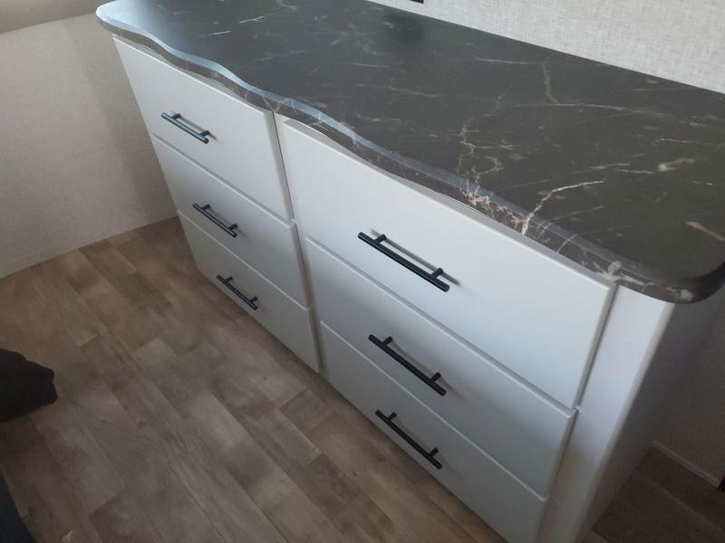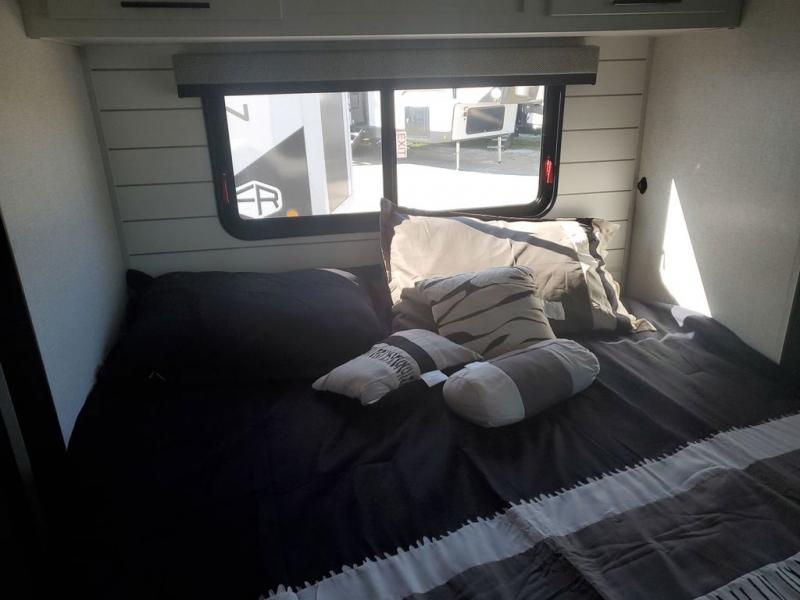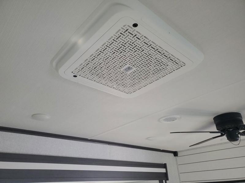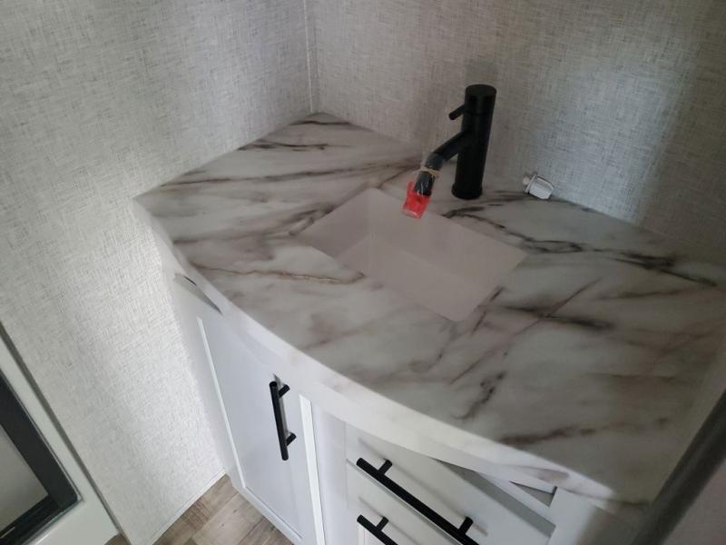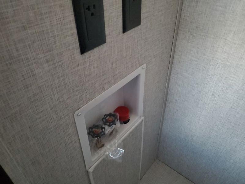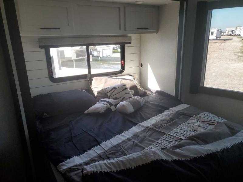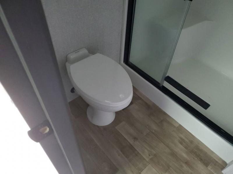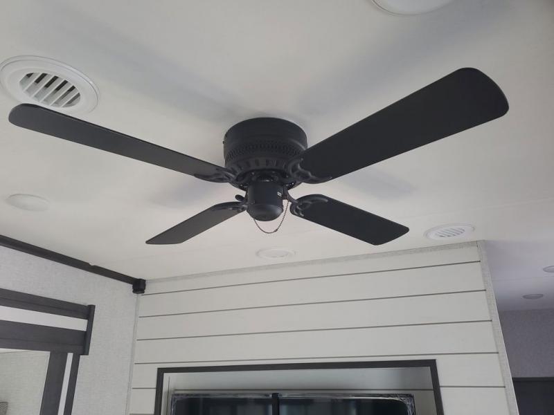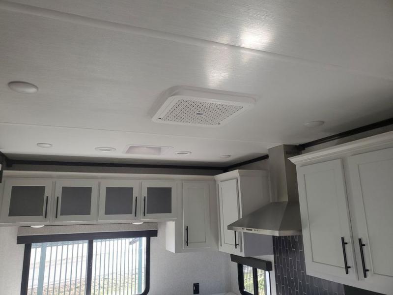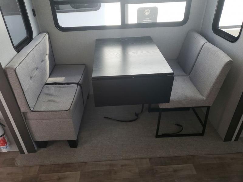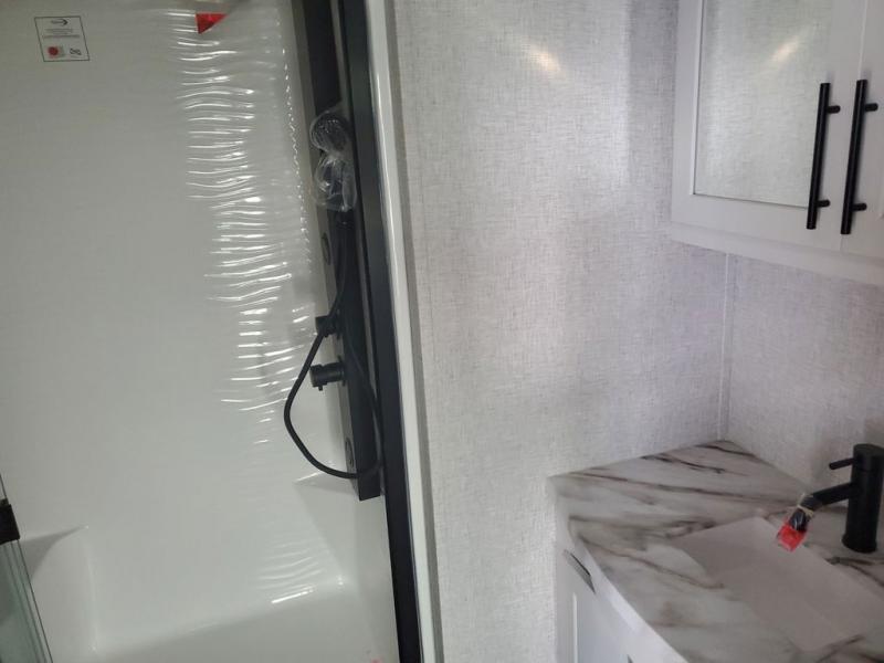 Extended stays in this destination trailer are made complete with family and friends. The chef of your group will love the spacious rear kitchen with plenty of overhead cabinets, a pantry/cabinet, plus a four burner cooktop. Everyone can be visiting in the middle living room while dinner is being made. Here, you'll find a hide-a-bed sofa, theater seating, plus fireplace with a 50" TV. The full bath lets you clean up each day, and the front private bedroom will feel just like home with a king bed slide out and tons of storage space for your necessities.