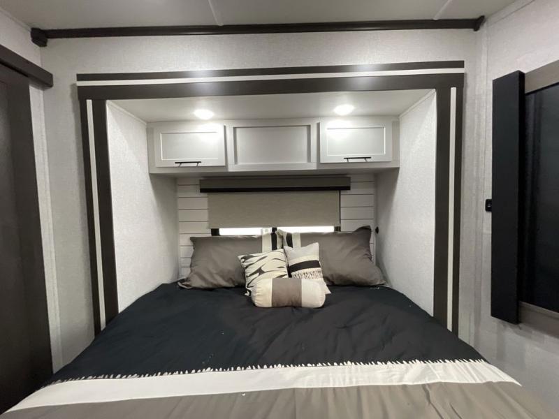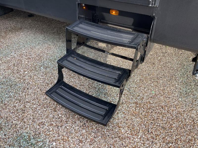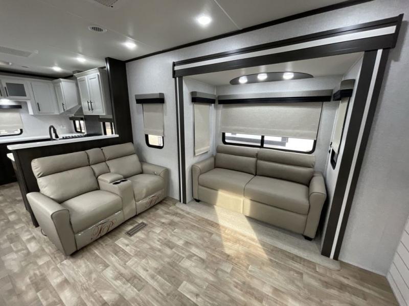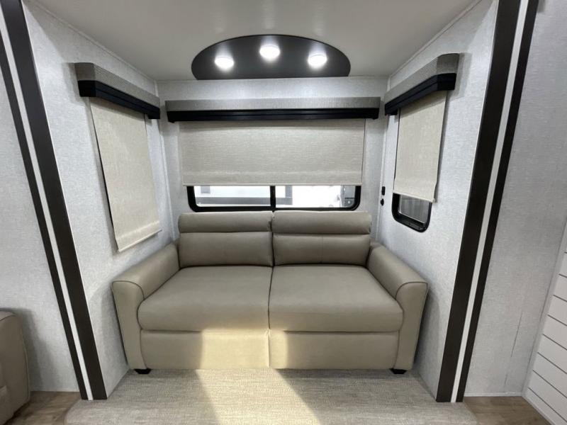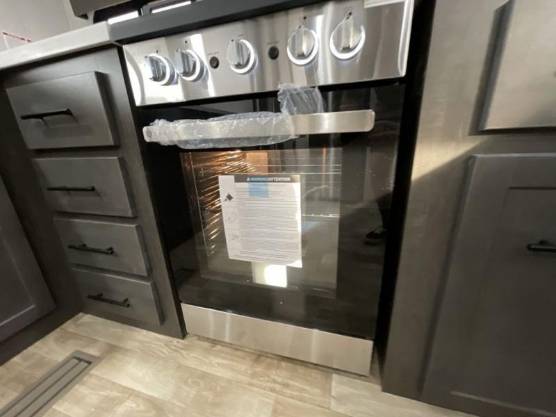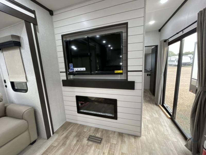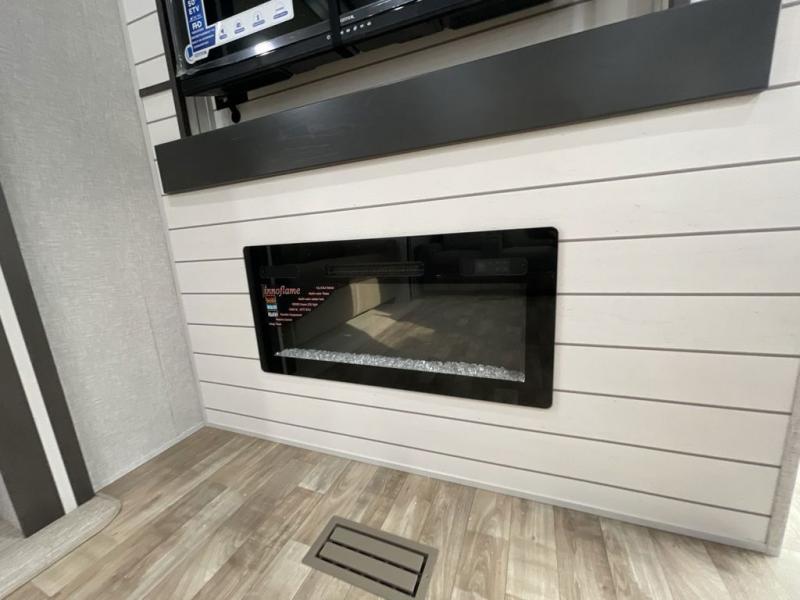 Extended stays in this destination trailer are made complete with family and friends. The chef of your group will love the spacious rear kitchen with plenty of overhead cabinets, a pantry/cabinet, plus a four burner cooktop. Everyone can be visiting in the middle living room while dinner is being made. Here, you'll find a hide-a-bed sofa, theater seating, plus fireplace with a 50" TV. The full bath lets you clean up each day, and the front private bedroom will feel just like home with a king bed slide out and tons of storage space for your necessities.