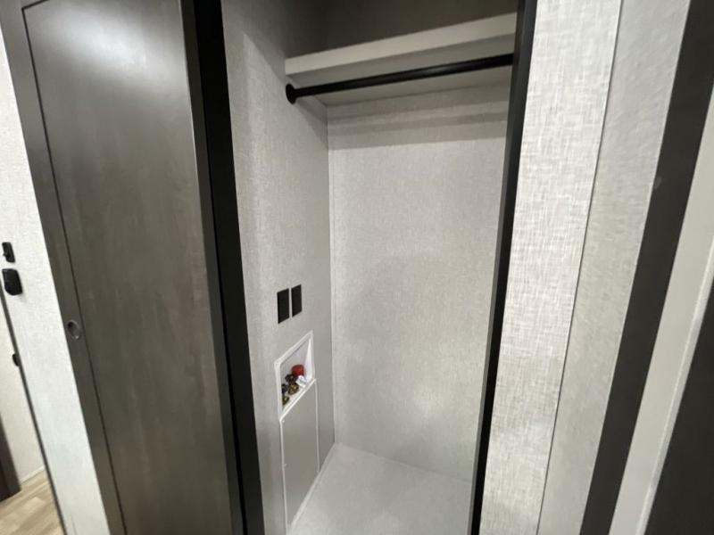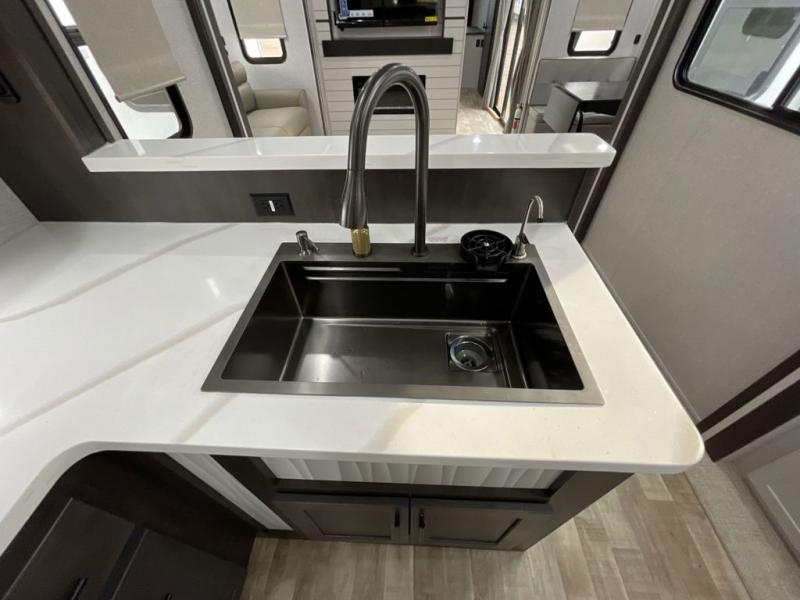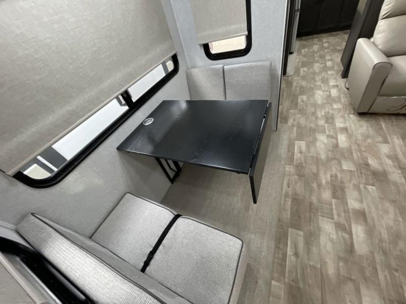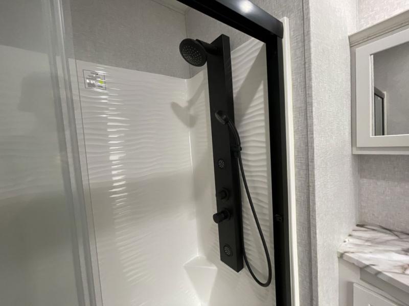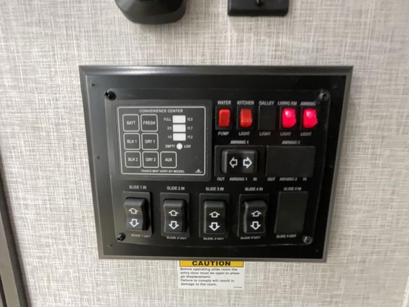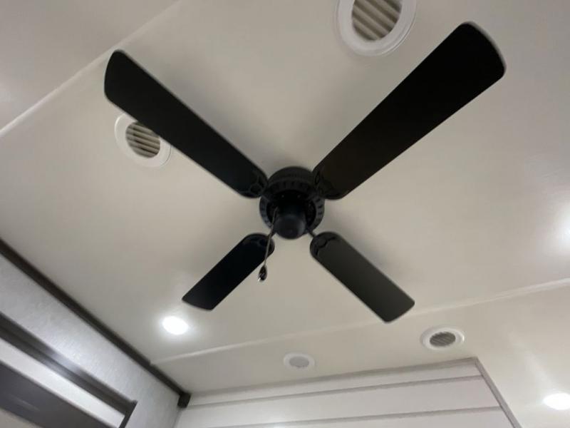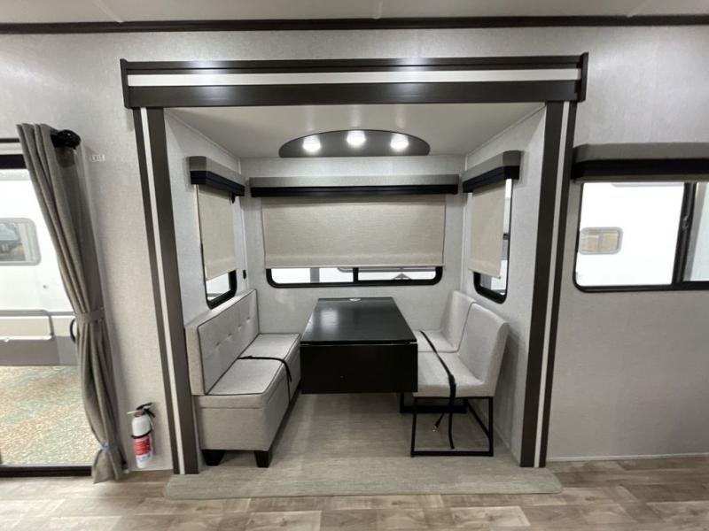 Extended stays in this destination trailer are made complete with family and friends. The chef of your group will love the spacious rear kitchen with plenty of overhead cabinets, a pantry/cabinet, plus a four burner cooktop. Everyone can be visiting in the middle living room while dinner is being made. Here, you'll find a hide-a-bed sofa, theater seating, plus fireplace with a 50" TV. The full bath lets you clean up each day, and the front private bedroom will feel just like home with a king bed slide out and tons of storage space for your necessities.