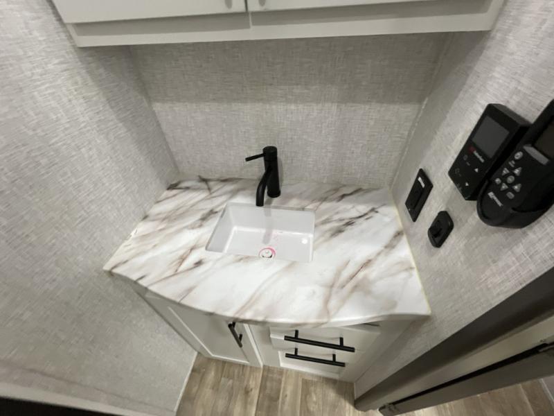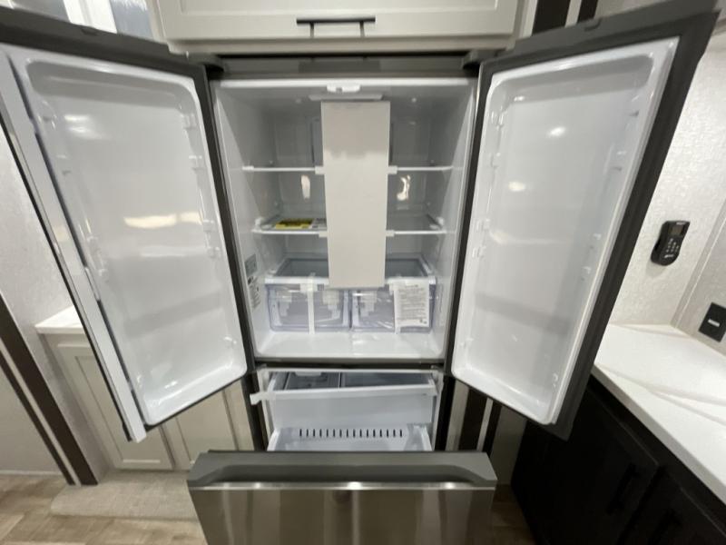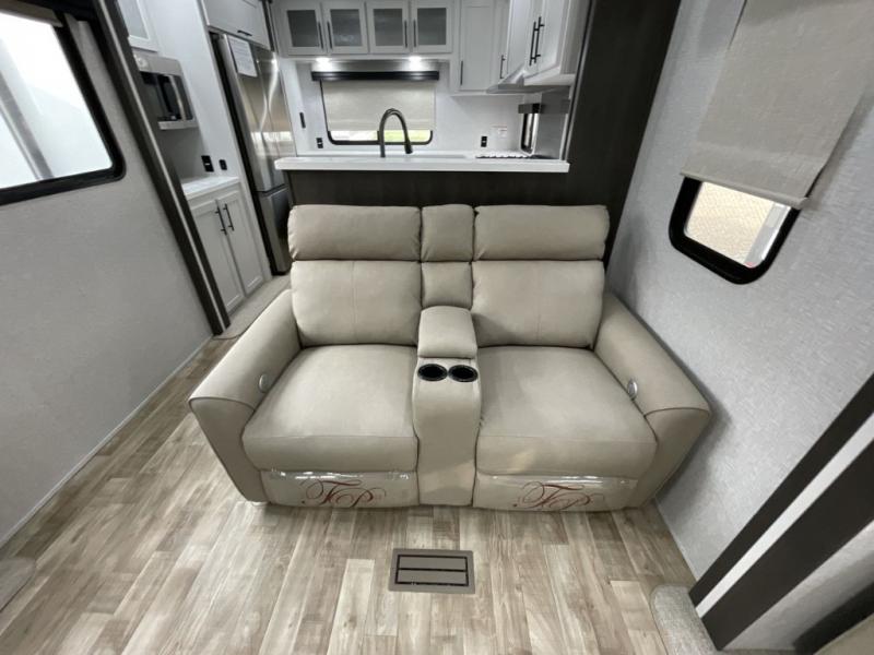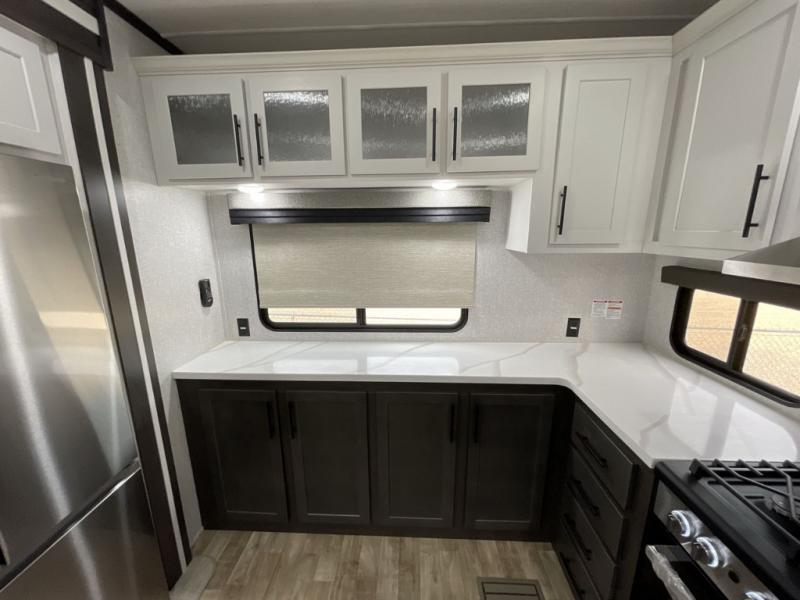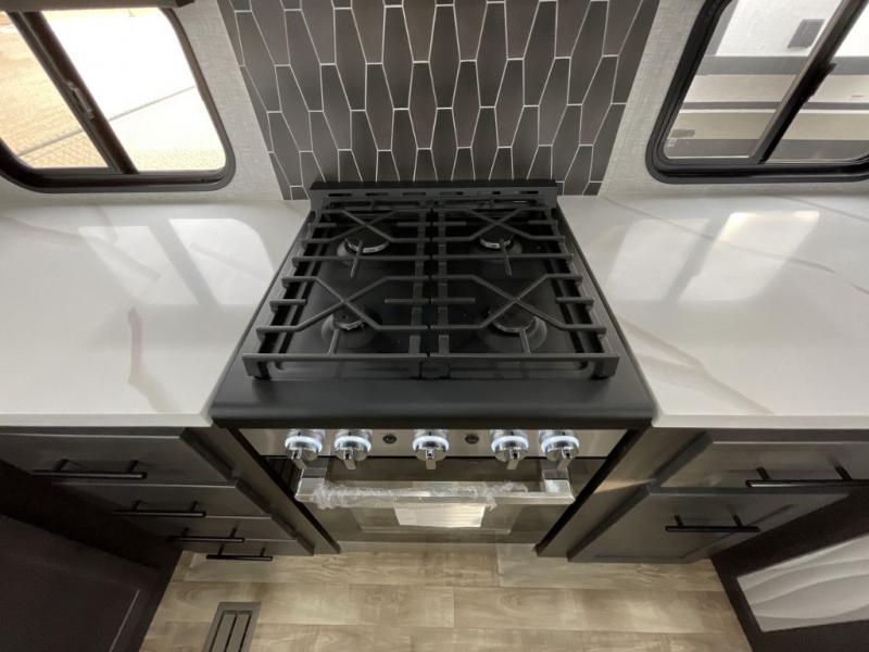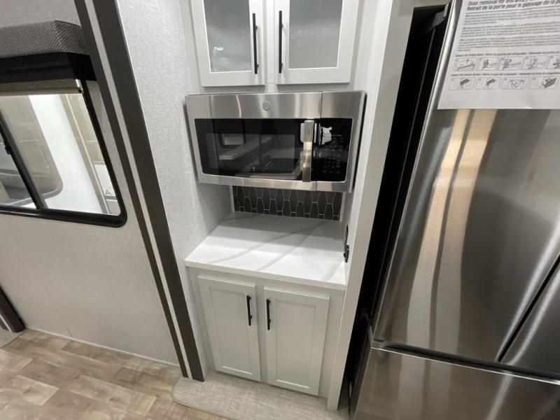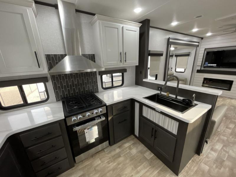 Extended stays in this destination trailer are made complete with family and friends. The chef of your group will love the spacious rear kitchen with plenty of overhead cabinets, a pantry/cabinet, plus a four burner cooktop. Everyone can be visiting in the middle living room while dinner is being made. Here, you'll find a hide-a-bed sofa, theater seating, plus fireplace with a 50" TV. The full bath lets you clean up each day, and the front private bedroom will feel just like home with a king bed slide out and tons of storage space for your necessities.