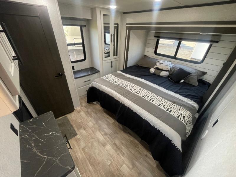Each Hampton destination trailer by CrossRoads RV includes a one-piece fiberglass front cap, tinted glass windows, and an outside faucet that will surely come in handy when wanting to rinse off your hands or even shoes after exploring outdoors. Each is constructed with a fiberglass roof and floor insulation with radiant tech foil, an enclosed underbelly, and severe weather welded mounts and rain gutters along the entire roof line. And, the Convenience package that comes standard includes KeyTV, a microwave, a quilted bedspread, a power vent in the bathroom, and more. Other interior features offered include decorative accent lighting, a 9-foot floor to ceiling height, a patio door with a swing-out assist rail, and two-toned wood fascia. So choose your destination, select your favorite Hampton, and start feeling at home when you are actually on vacation!