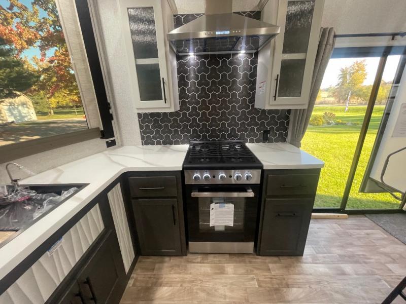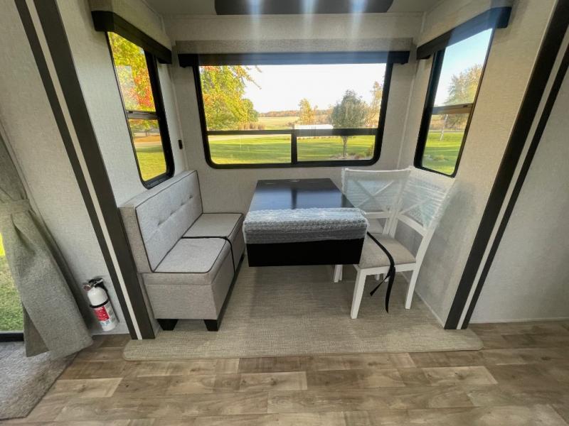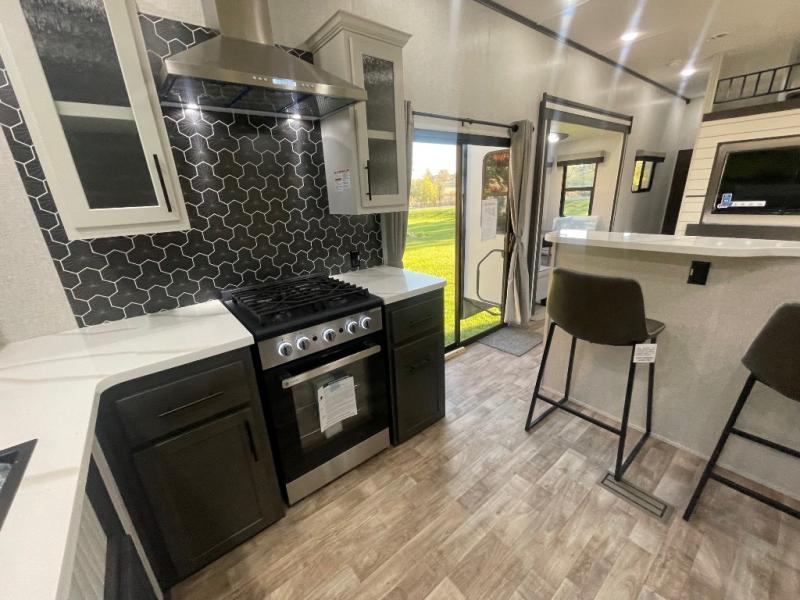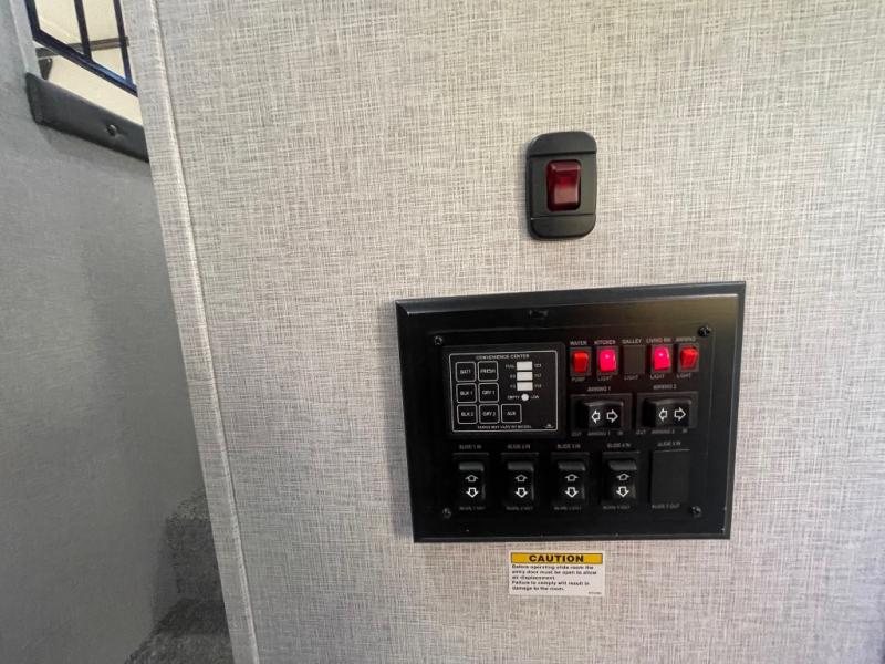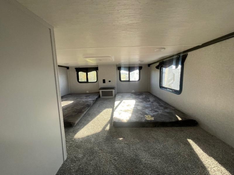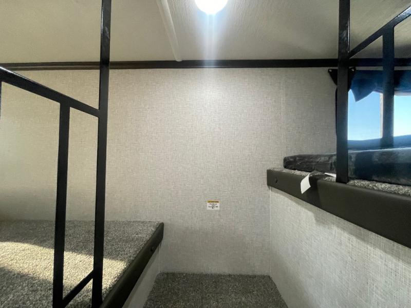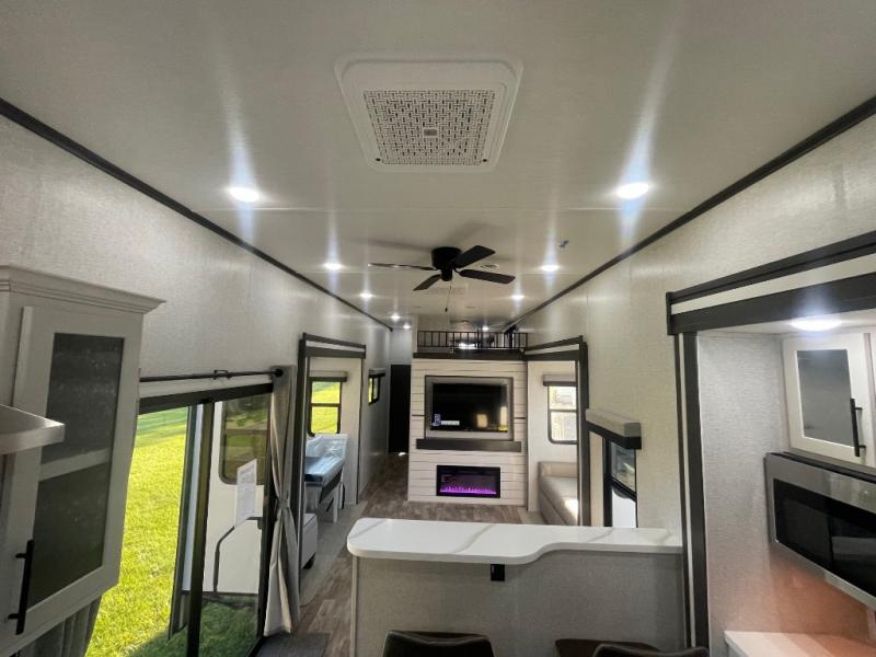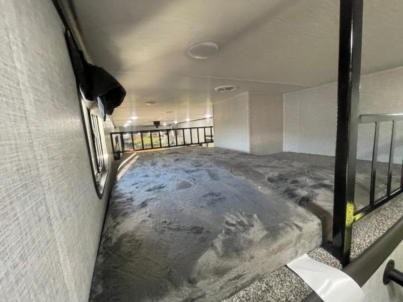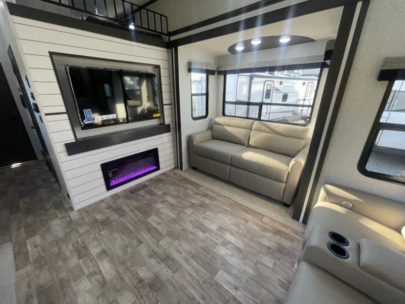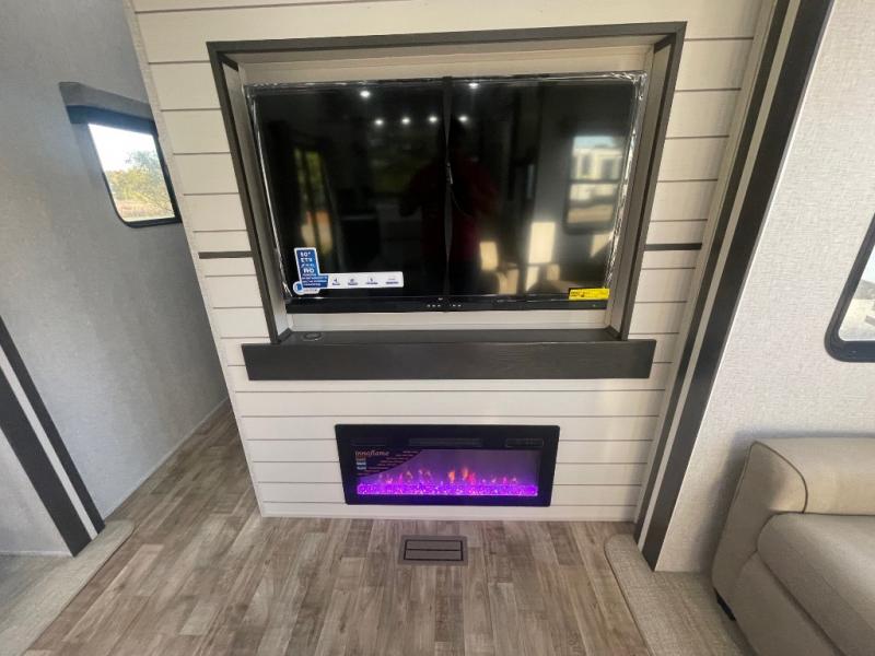 Are you looking for a destination trailer that can fit your whole crew? Look no further than this unit with four slides, three bunk mats in the loft areas, plus a spacious full bath that will allow everyone to stay clean each day. The front kitchen is any chef's dream with its ample counter space, pantry/cabinet, residential four burner range, and residential refrigerator. After dinner is cleaned up, everyone can meet in the middle living area to watch a movie on the 50" TV, and the fireplace here will make it feel more like home.