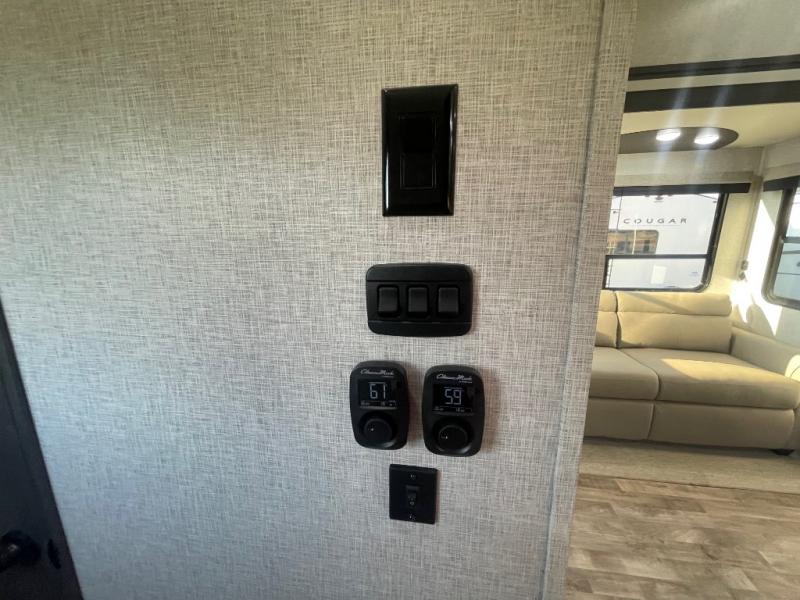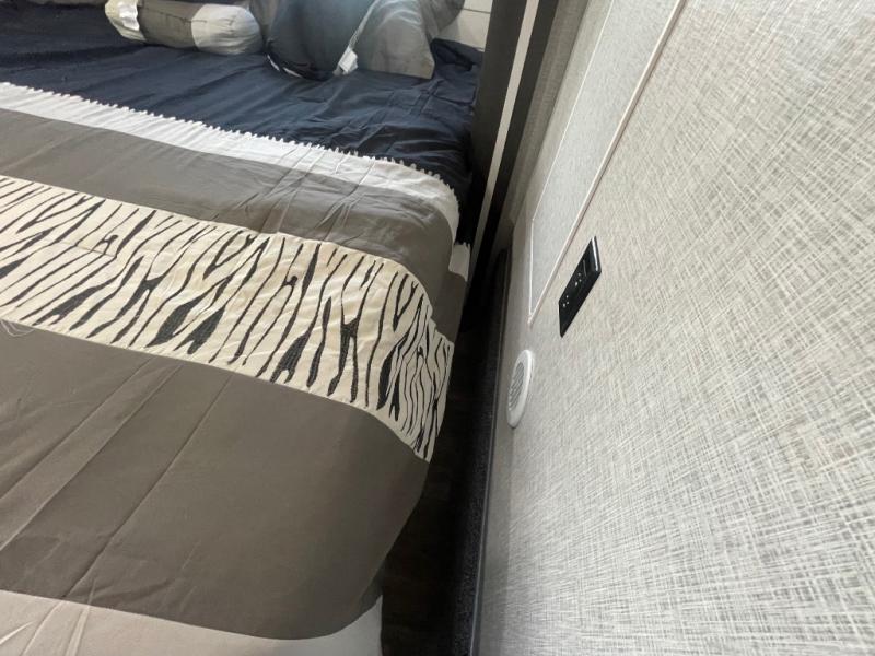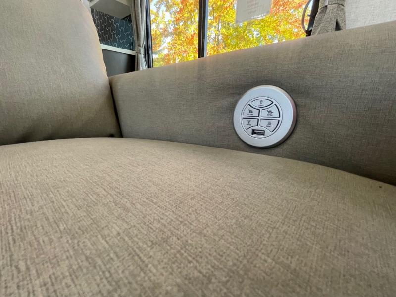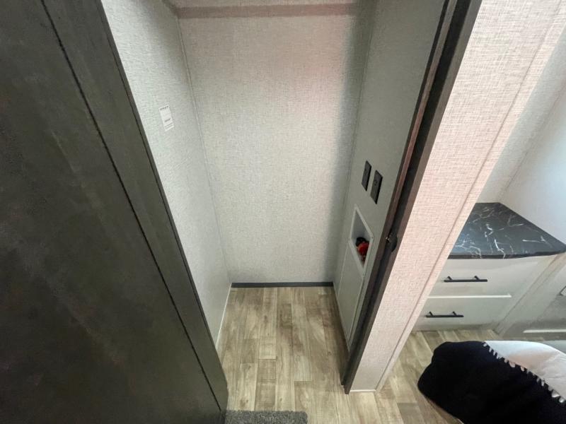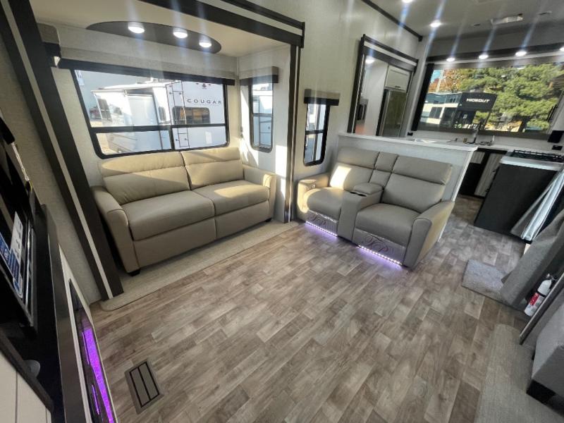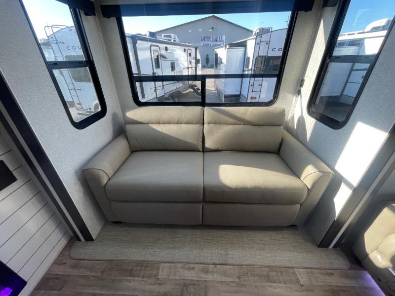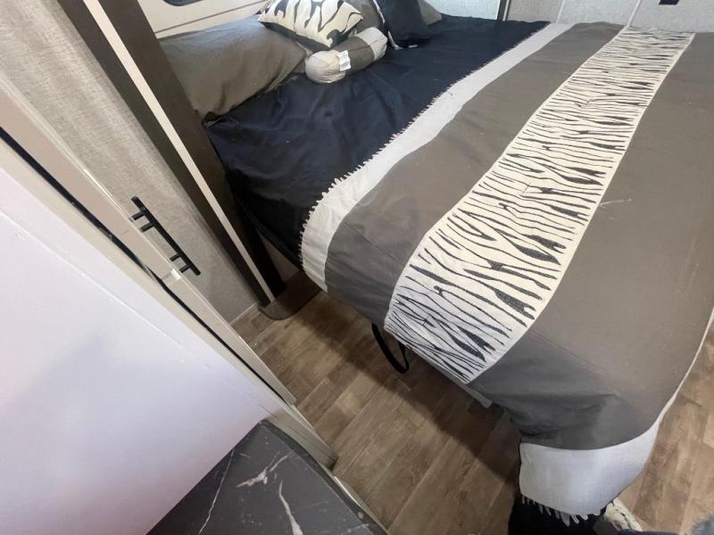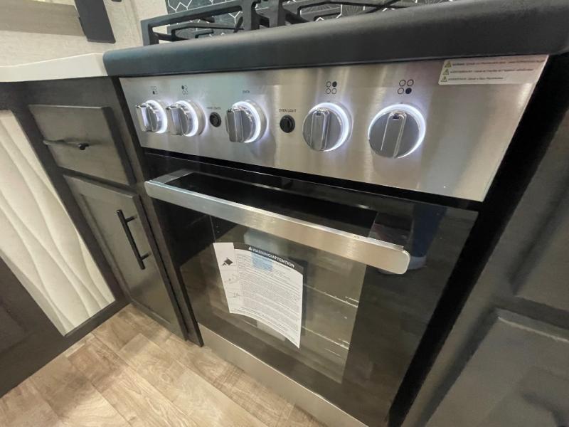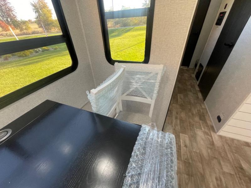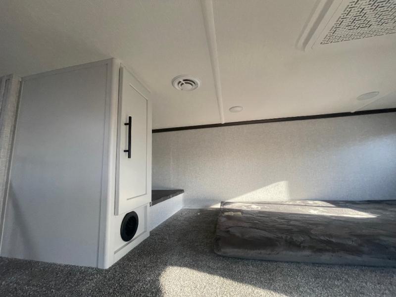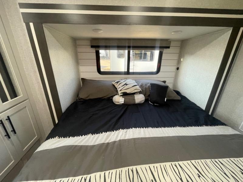 Are you looking for a destination trailer that can fit your whole crew? Look no further than this unit with four slides, three bunk mats in the loft areas, plus a spacious full bath that will allow everyone to stay clean each day. The front kitchen is any chef's dream with its ample counter space, pantry/cabinet, residential four burner range, and residential refrigerator. After dinner is cleaned up, everyone can meet in the middle living area to watch a movie on the 50" TV, and the fireplace here will make it feel more like home.