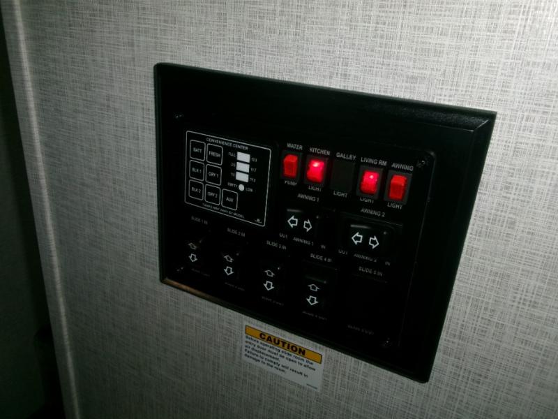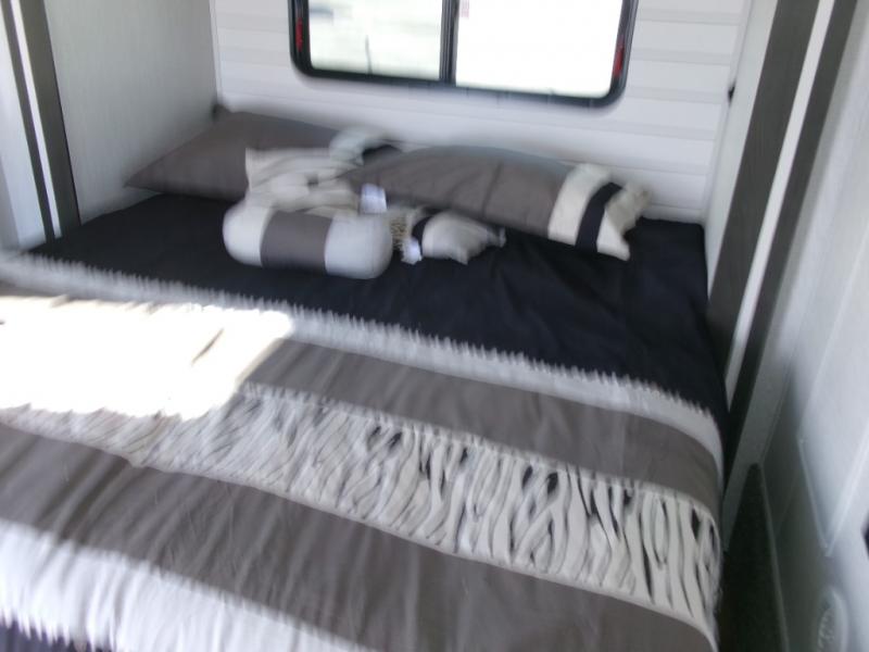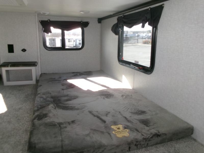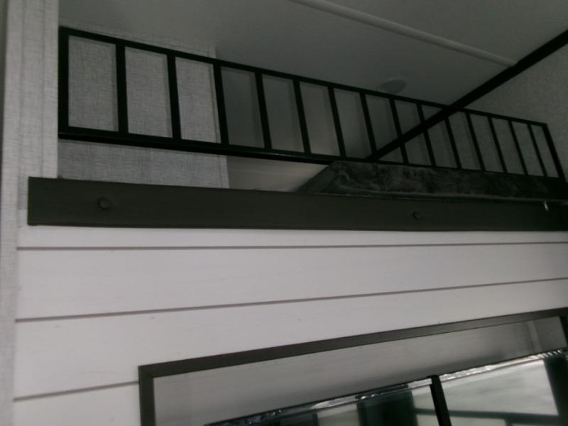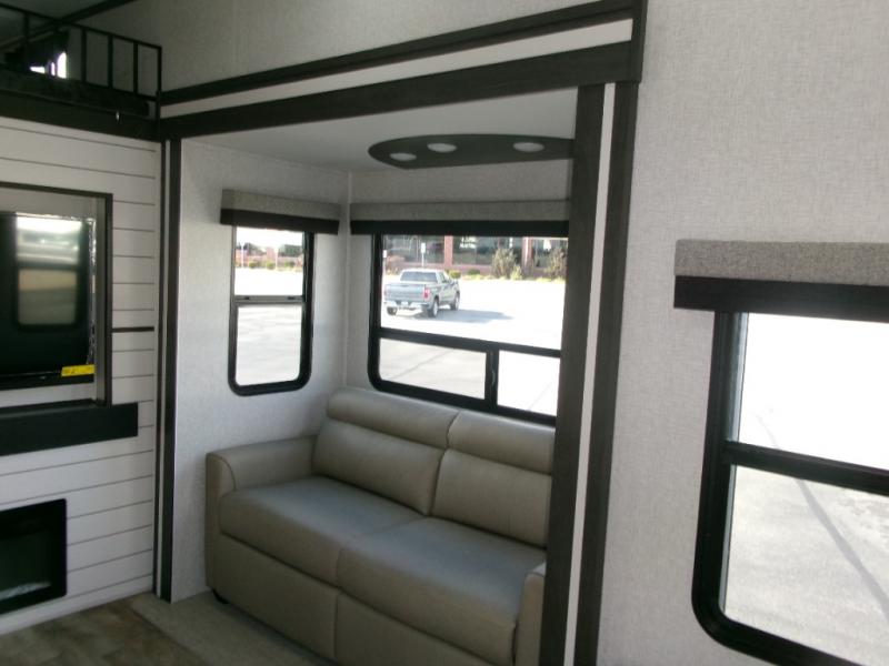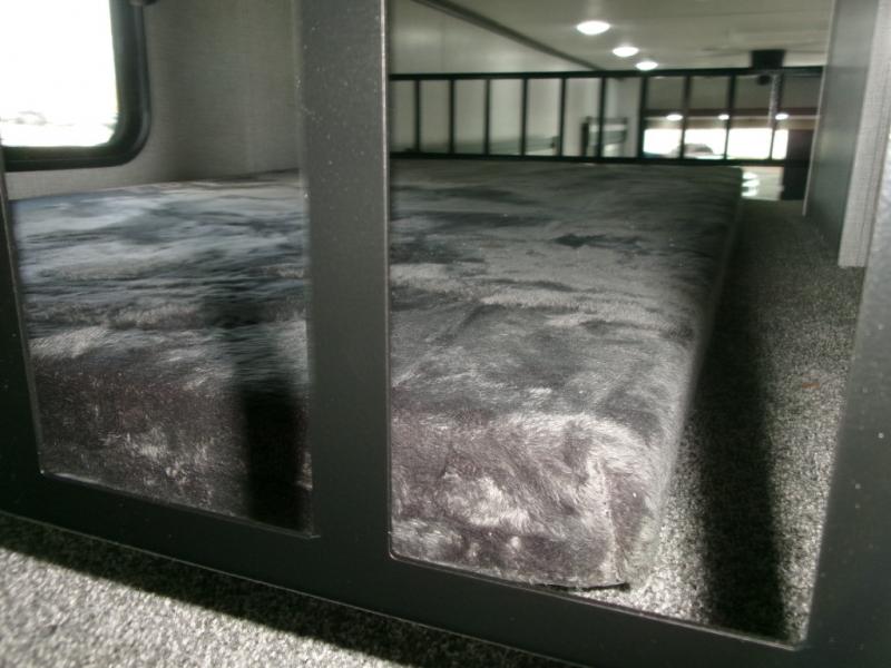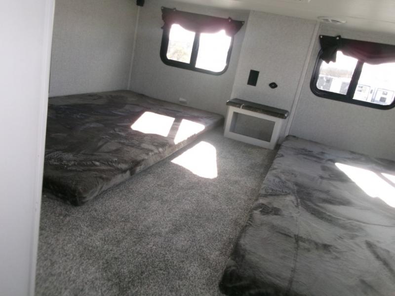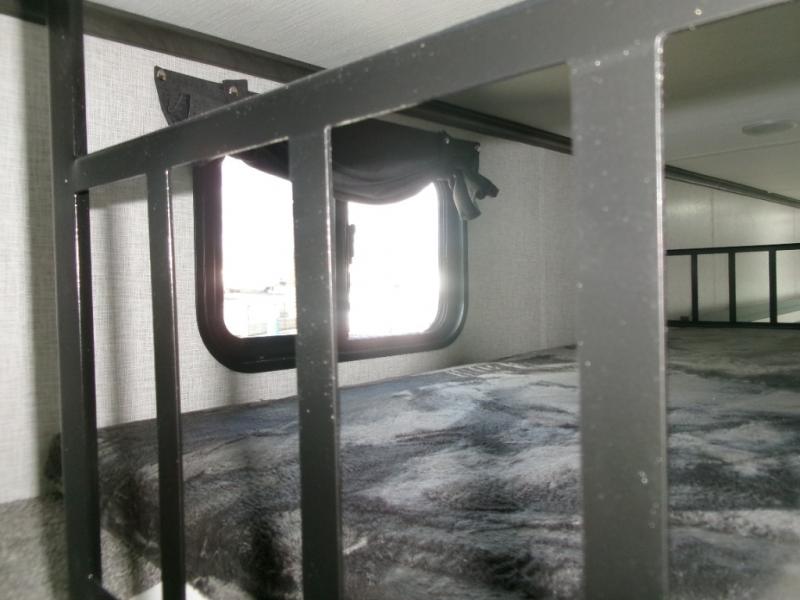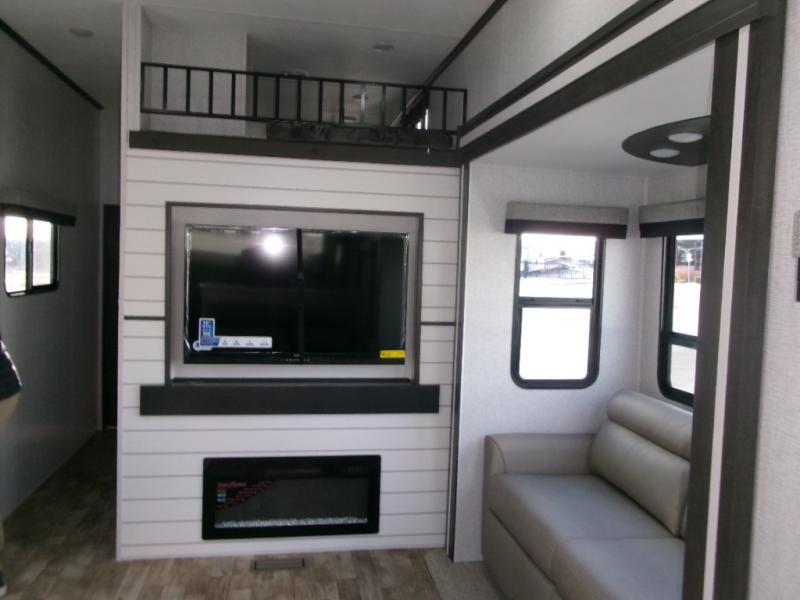Are you looking for a destination trailer that can fit your whole crew? Look no further than this unit with four slides, three bunk mats in the loft areas, plus a spacious full bath that will allow everyone to stay clean each day. The front kitchen is any chef's dream with its ample counter space, pantry/cabinet, residential four burner range, and residential refrigerator. After dinner is cleaned up, everyone can meet in the middle living area to watch a movie on the 50" TV, and the fireplace here will make it feel more like home.
