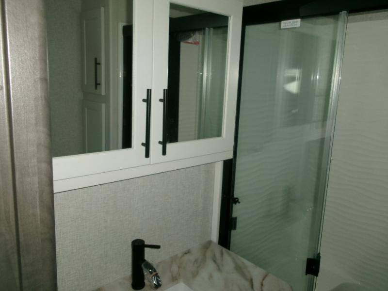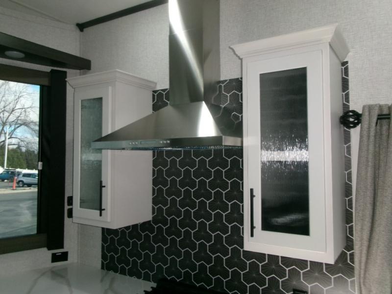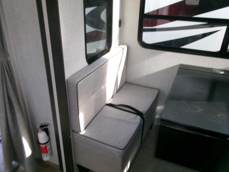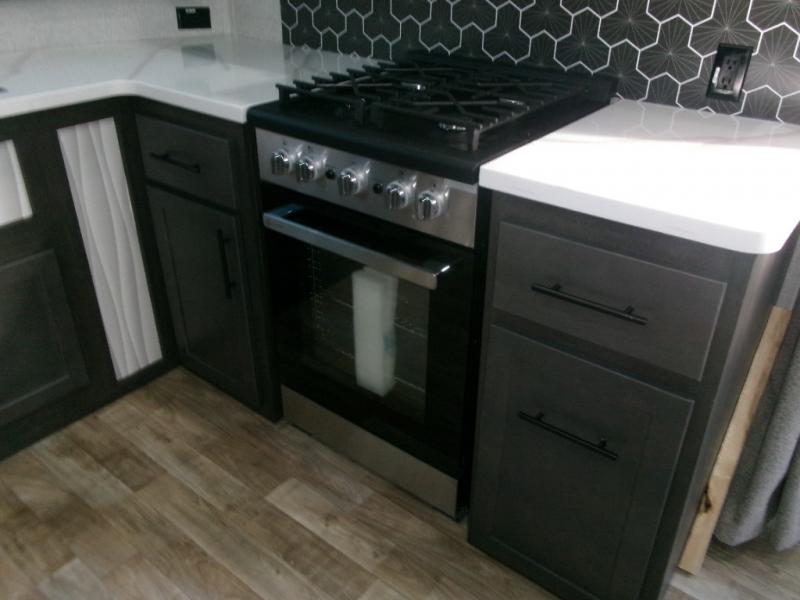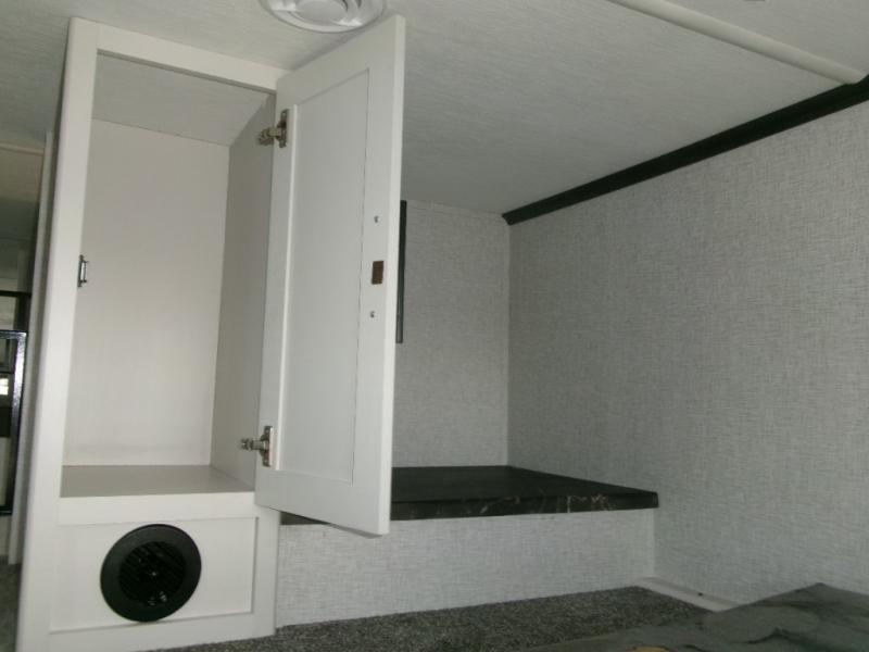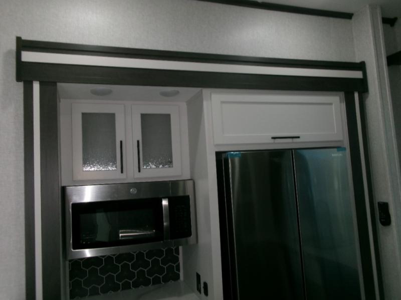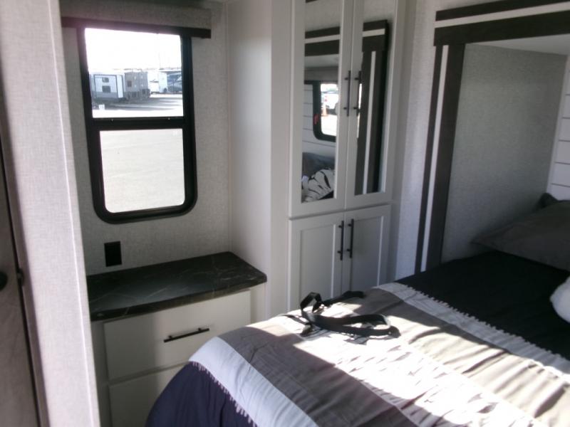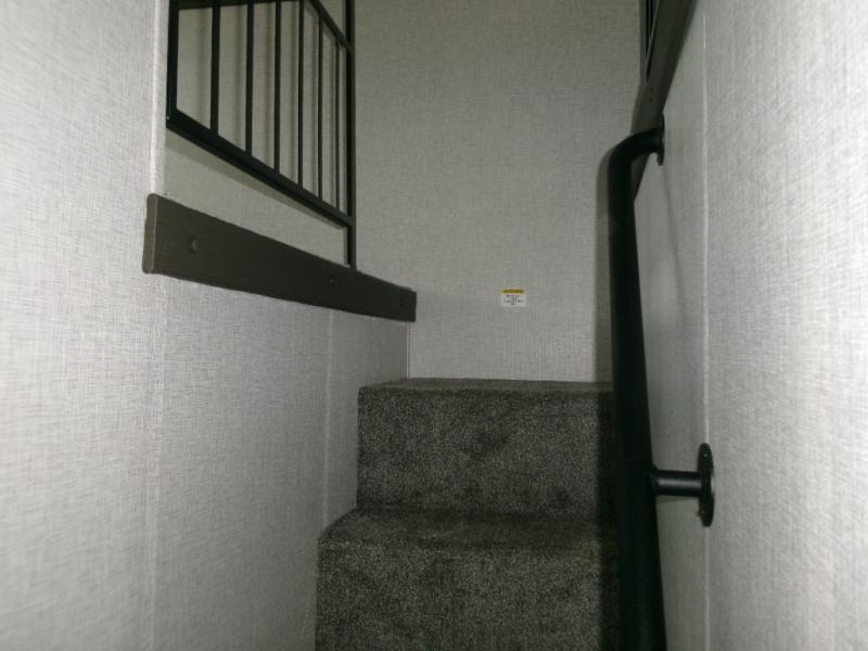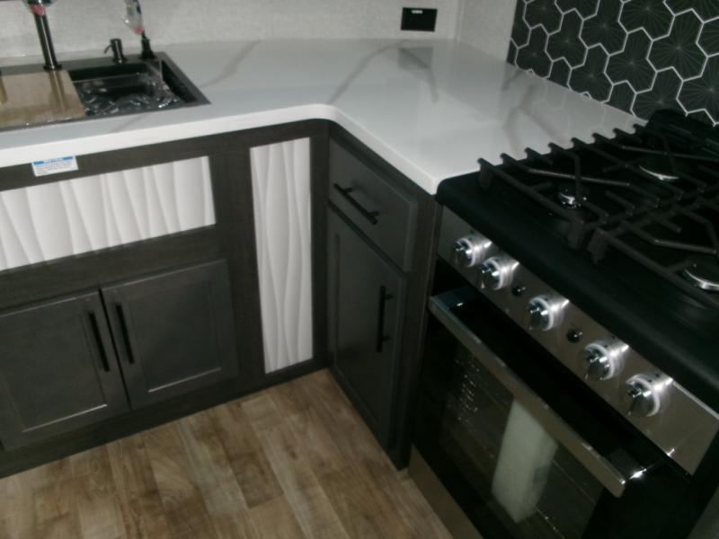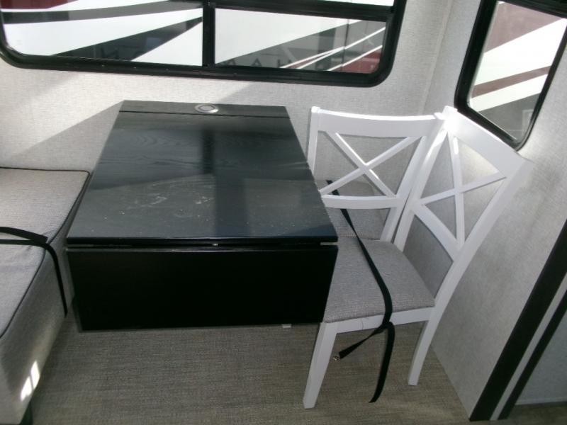 Are you looking for a destination trailer that can fit your whole crew? Look no further than this unit with four slides, three bunk mats in the loft areas, plus a spacious full bath that will allow everyone to stay clean each day. The front kitchen is any chef's dream with its ample counter space, pantry/cabinet, residential four burner range, and residential refrigerator. After dinner is cleaned up, everyone can meet in the middle living area to watch a movie on the 50" TV, and the fireplace here will make it feel more like home.