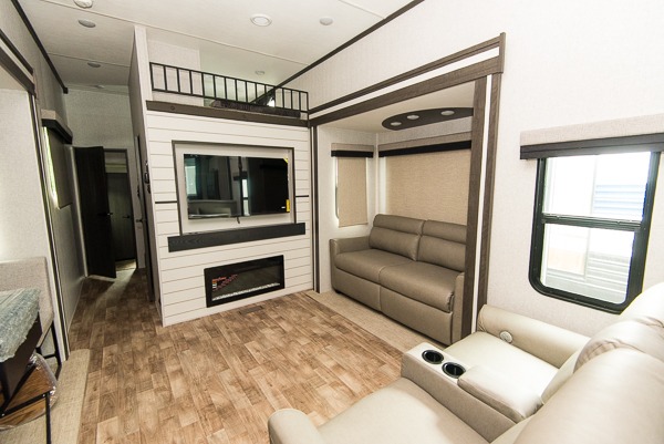 Are you looking for a destination trailer that can fit your whole crew? Look no further than this unit with four slides, three bunk mats in the loft areas, plus a spacious full bath that will allow everyone to stay clean each day. The front kitchen is any chef's dream with its ample counter space, pantry/cabinet, residential four burner range, and residential refrigerator. After dinner is cleaned up, everyone can meet in the middle living area to watch a movie on the 50" TV, and the fireplace here will make it feel more like home.
