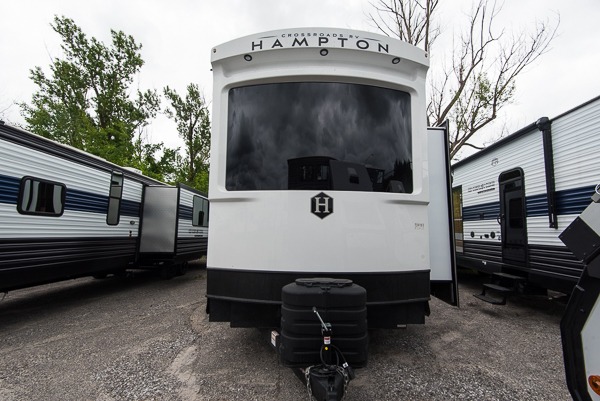 Each Hampton destination trailer by CrossRoads RV includes a one-piece fiberglass front cap, tinted glass windows, and an outside faucet that will surely come in handy when wanting to rinse off your hands or even shoes after exploring outdoors. Each is constructed with a fiberglass roof and floor insulation with radiant tech foil, an enclosed underbelly, and severe weather welded mounts and rain gutters along the entire roof line. And, the Convenience package that comes standard includes KeyTV, a microwave, a quilted bedspread, a power vent in the bathroom, and more. Other interior features offered include decorative accent lighting, a 9-foot floor to ceiling height, a patio door with a swing-out assist rail, and two-toned wood fascia. So choose your destination, select your favorite Hampton, and start feeling at home when you are actually on vacation!