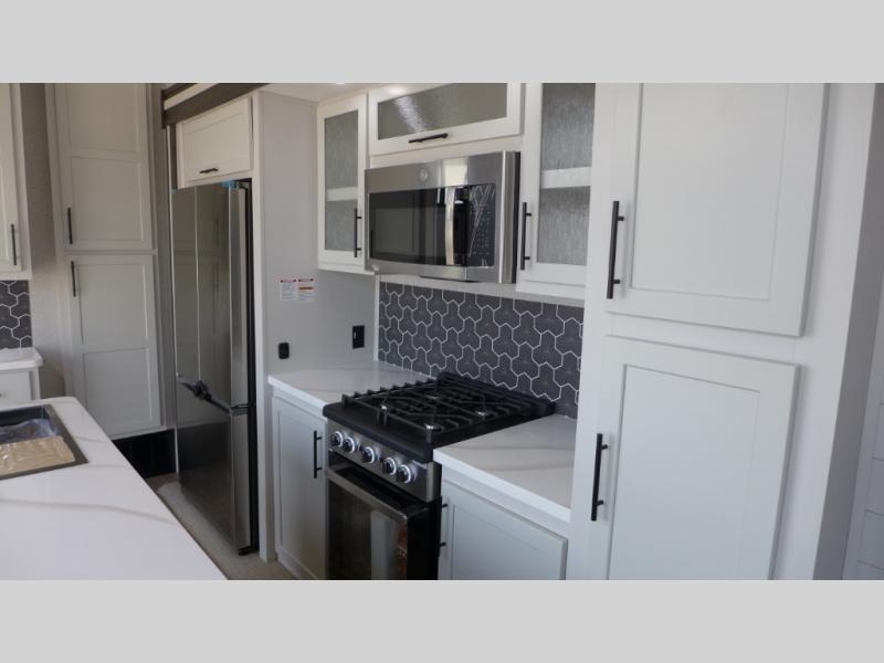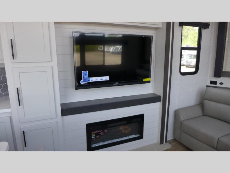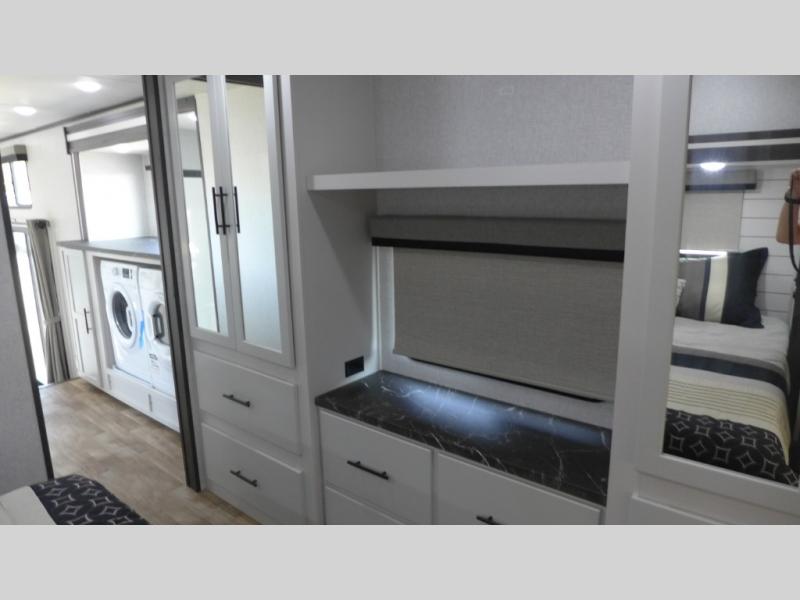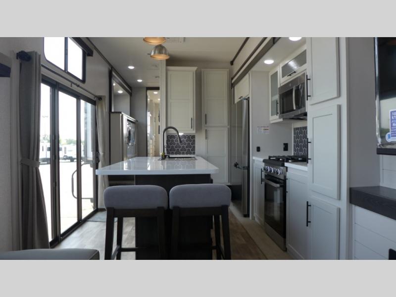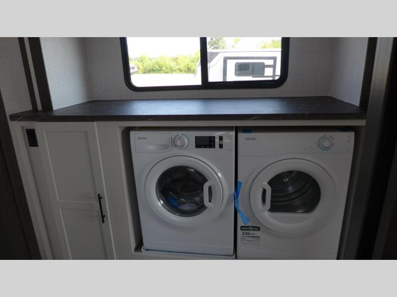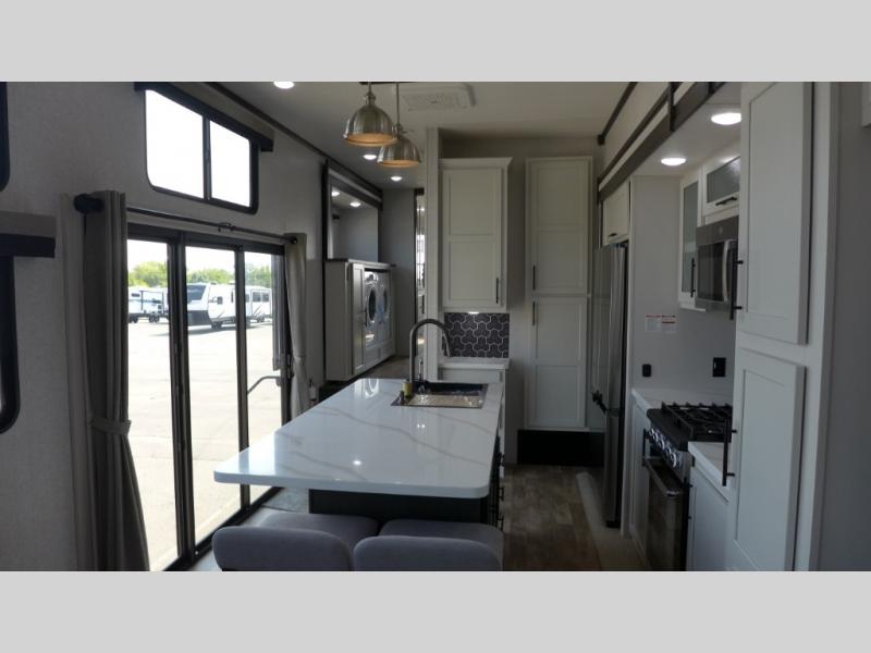 You'll love every minute spent in this spacious destination trailer. There is a front living area with an L-shaped sofa, a 65" TV plus a fireplace to make it feel more like home. You will find a large kitchen island with four stools where you can dine together each day. The kitchen also includes a pantry, closet, hutch, and overhead cabinets for tons of storage space. The full bath includes dual bath sinks and a spacious 48" shower, and right across the hall is a slide out with space for a washer/dryer. Head to the rear private bedroom where you can sleep soundly on the king bed slide out and keep your items organized in the dresser and wardrobes. And outside, you'll find five baggage doors so nothing gets left behind!