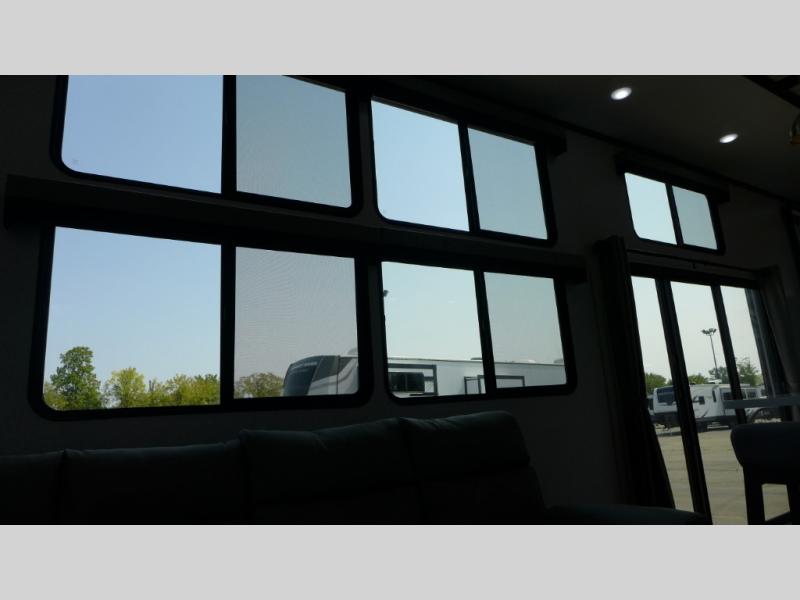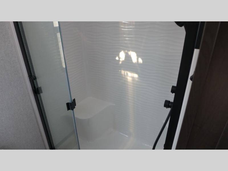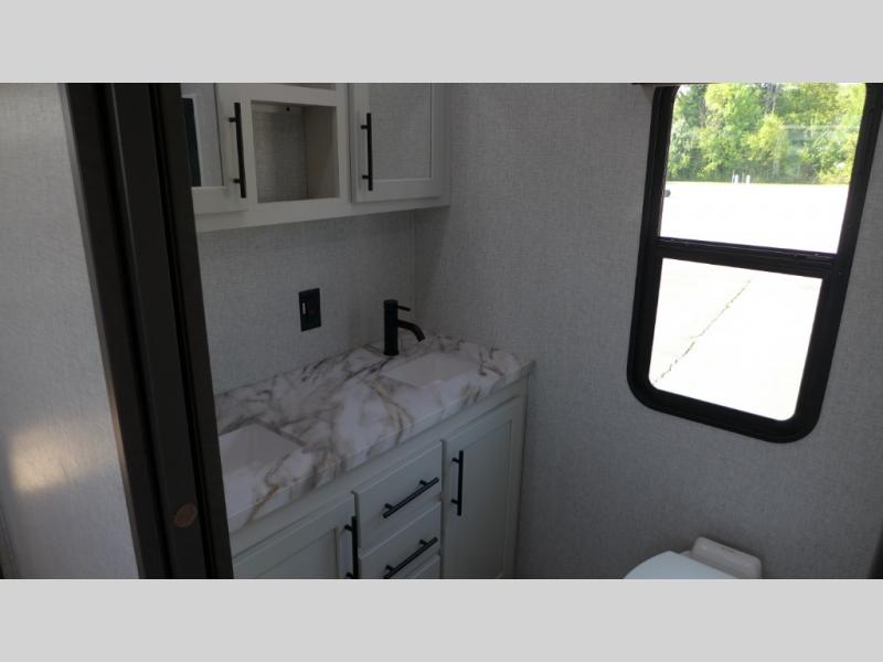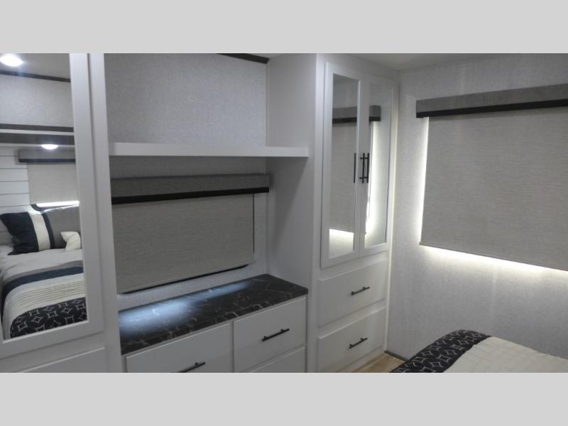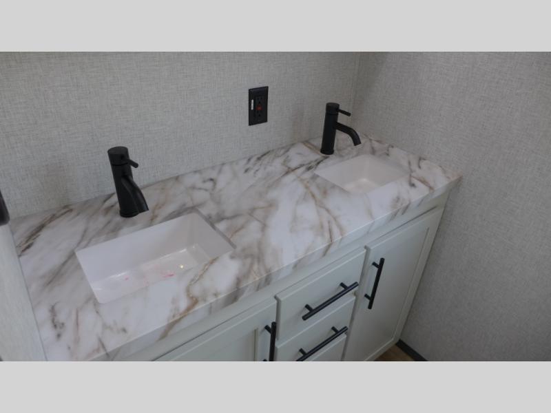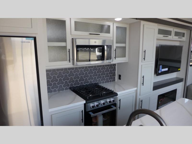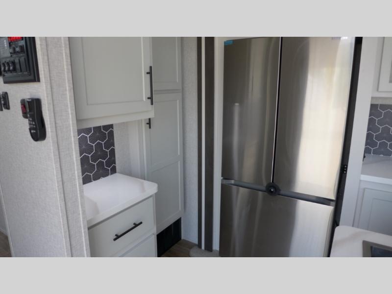 You'll love every minute spent in this spacious destination trailer. There is a front living area with an L-shaped sofa, a 65" TV plus a fireplace to make it feel more like home. You will find a large kitchen island with four stools where you can dine together each day. The kitchen also includes a pantry, closet, hutch, and overhead cabinets for tons of storage space. The full bath includes dual bath sinks and a spacious 48" shower, and right across the hall is a slide out with space for a washer/dryer. Head to the rear private bedroom where you can sleep soundly on the king bed slide out and keep your items organized in the dresser and wardrobes. And outside, you'll find five baggage doors so nothing gets left behind!