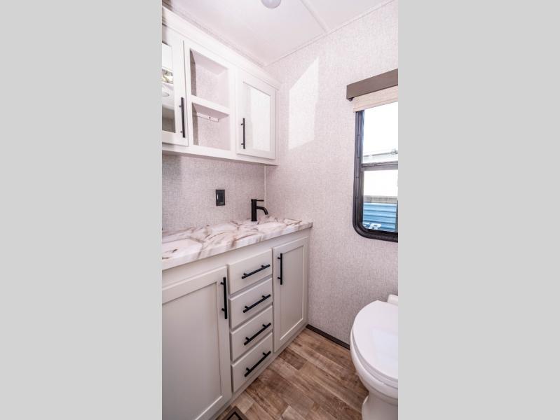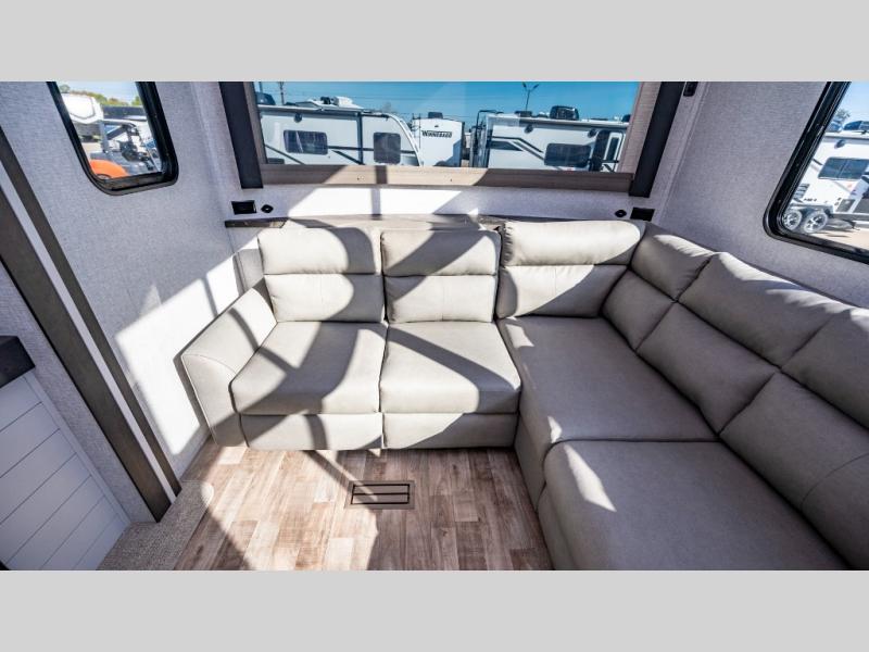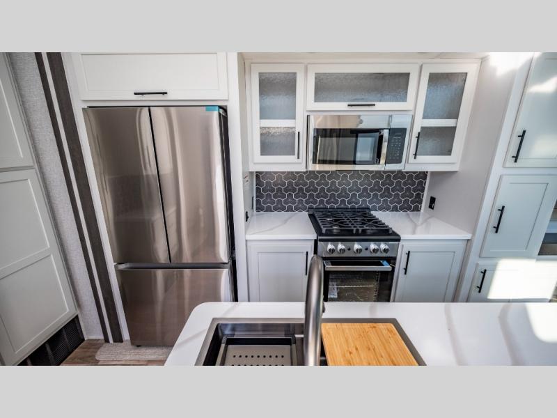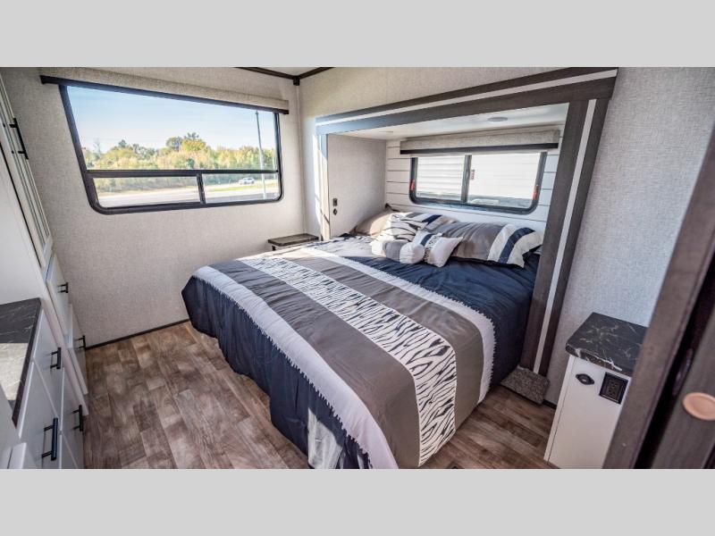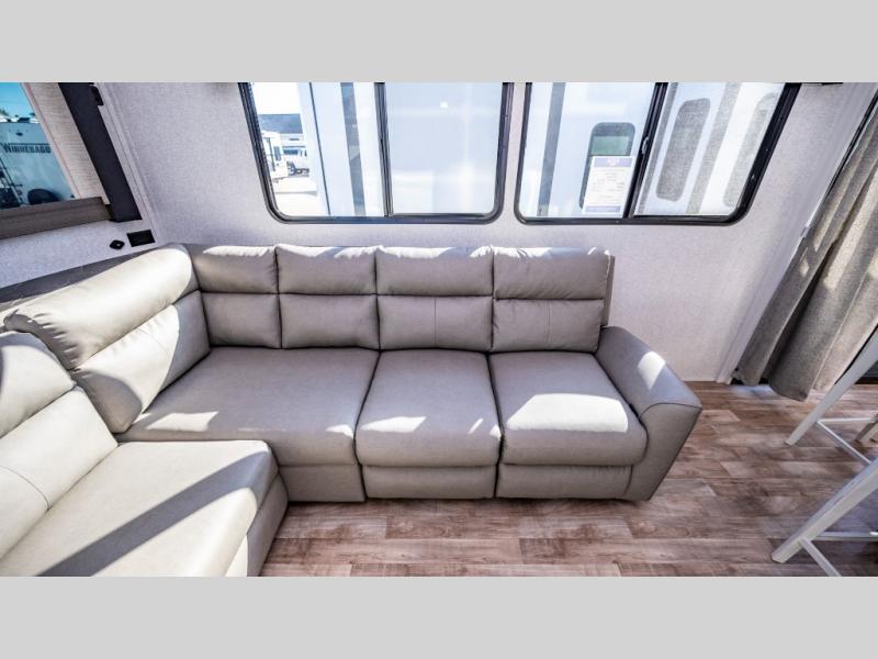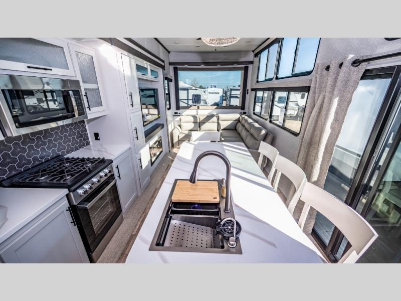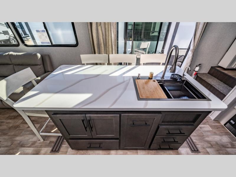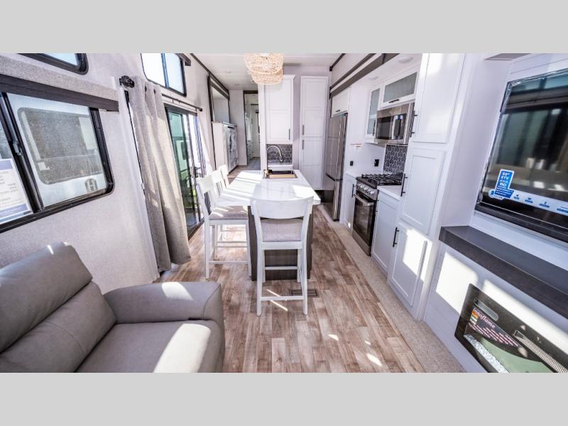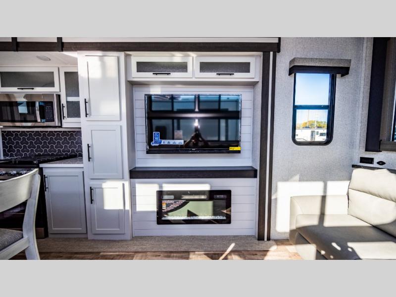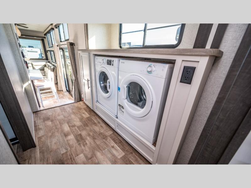 You'll love every minute spent in this spacious destination trailer. There is a front living area with an L-shaped sofa, a 65" TV plus a fireplace to make it feel more like home. You will find a large kitchen island with four stools where you can dine together each day. The kitchen also includes a pantry, closet, hutch, and overhead cabinets for tons of storage space. The full bath includes dual bath sinks and a spacious 48" shower, and right across the hall is a slide out with space for a washer/dryer. Head to the rear private bedroom where you can sleep soundly on the king bed slide out and keep your items organized in the dresser and wardrobes. And outside, you'll find five baggage doors so nothing gets left behind!