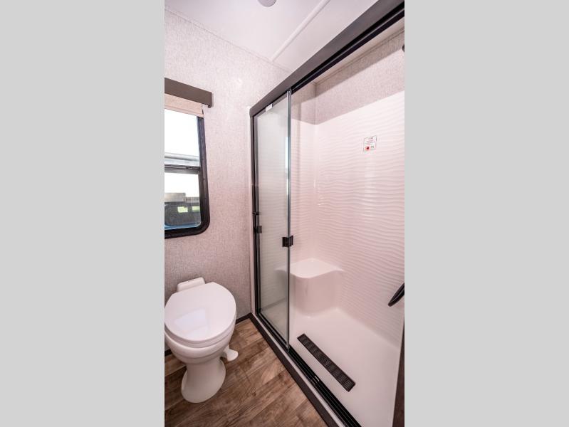 Each Hampton destination trailer by CrossRoads RV includes a one-piece fiberglass front cap, tinted glass windows, and an outside faucet that will surely come in handy when wanting to rinse off your hands or even shoes after exploring outdoors. Each is constructed with a fiberglass roof and floor insulation with radiant tech foil, an enclosed underbelly, and severe weather welded mounts plus rain gutters along the entire roof line. And, the Convenience package that comes standard includes KeyTV, a microwave, a quilted bedspread, a power vent in the bathroom, and more. Other interior features offered include decorative accent lighting, a patio door with a swing-out assist rail, and two-toned wood fascia. So choose your destination, select your favorite Hampton, and start feeling at home when you are actually on vacation!