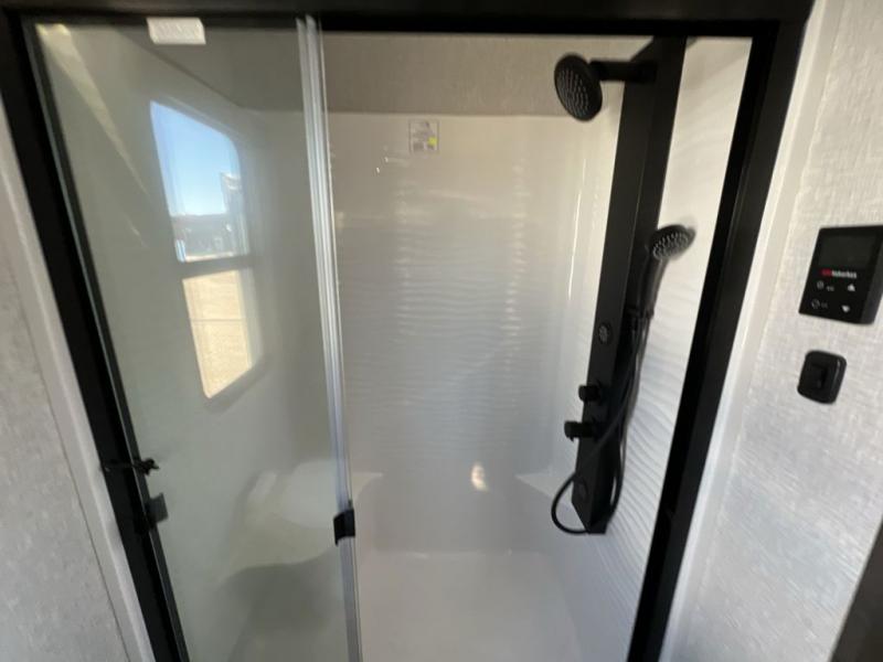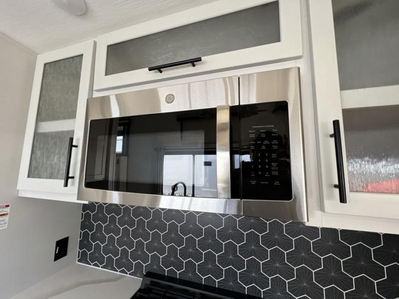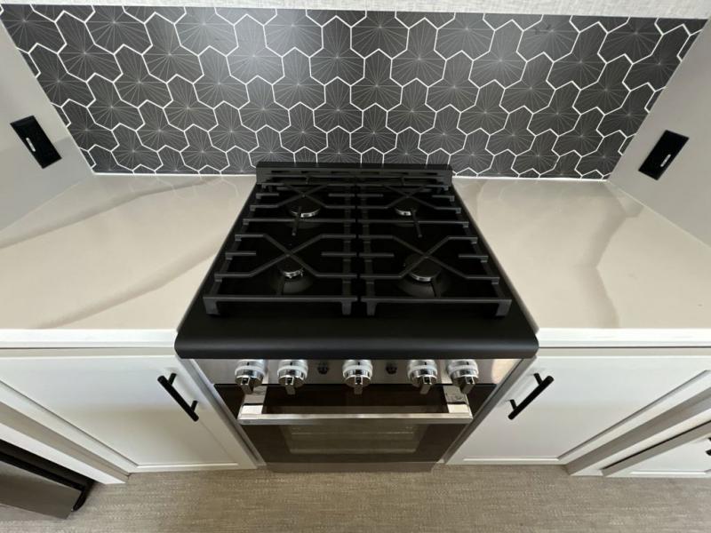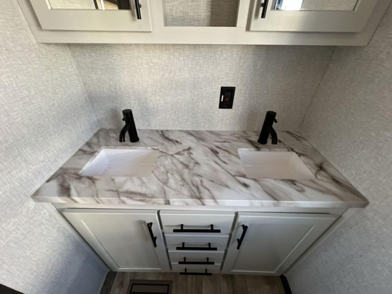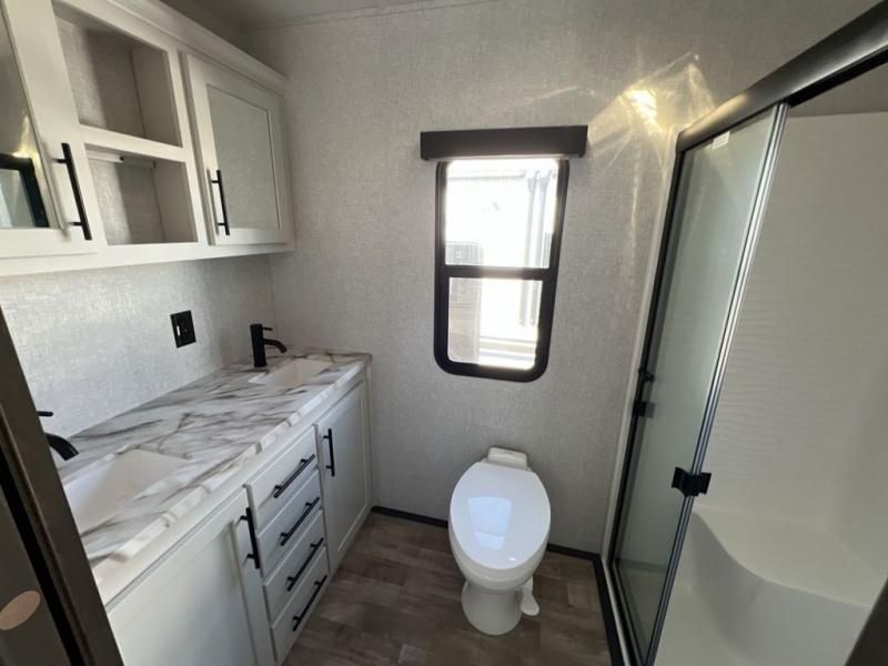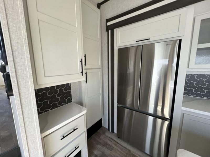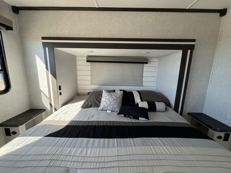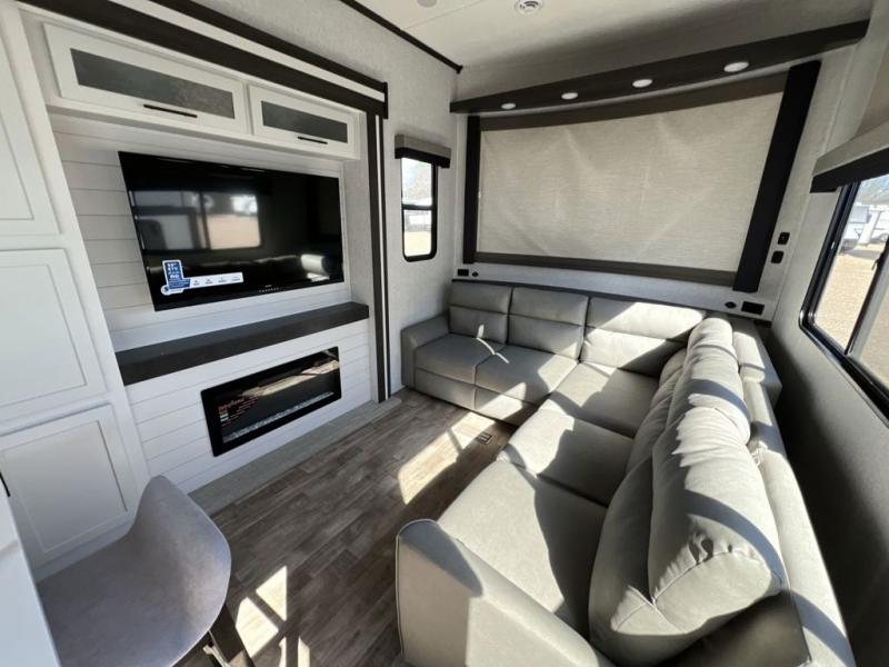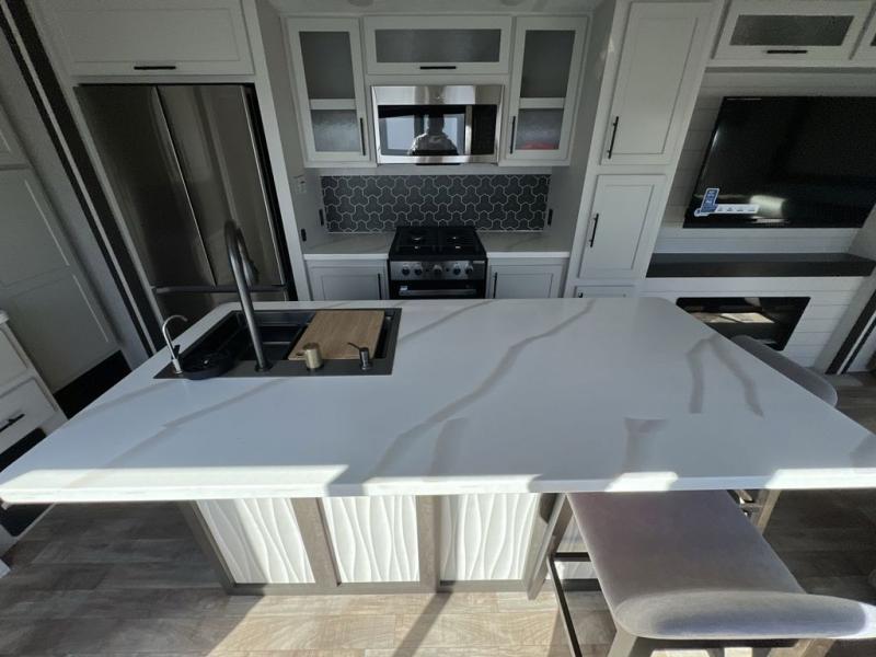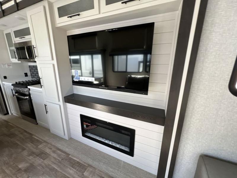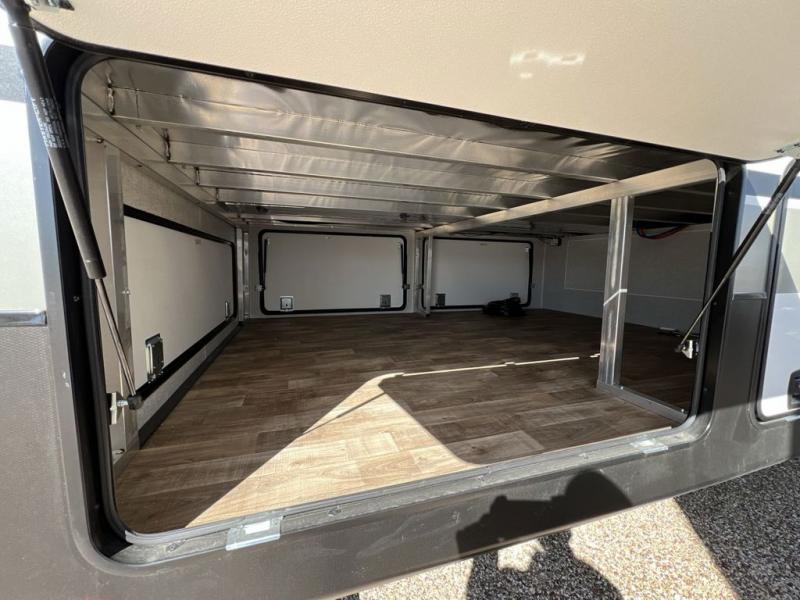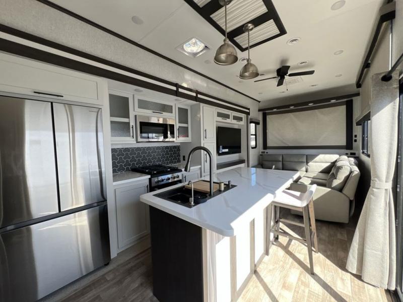 You'll love every minute spent in this spacious destination trailer. There is a front living area with an L-shaped sofa, a 65" TV plus a fireplace to make it feel more like home. You will find a large kitchen island with four stools where you can dine together each day. The kitchen also includes a pantry, closet, hutch, and overhead cabinets for tons of storage space. The full bath includes dual bath sinks and a spacious 48" shower, and right across the hall is a slide out with space for a washer/dryer. Head to the rear private bedroom where you can sleep soundly on the king bed slide out and keep your items organized in the dresser and wardrobes. And outside, you'll find five baggage doors so nothing gets left behind!
