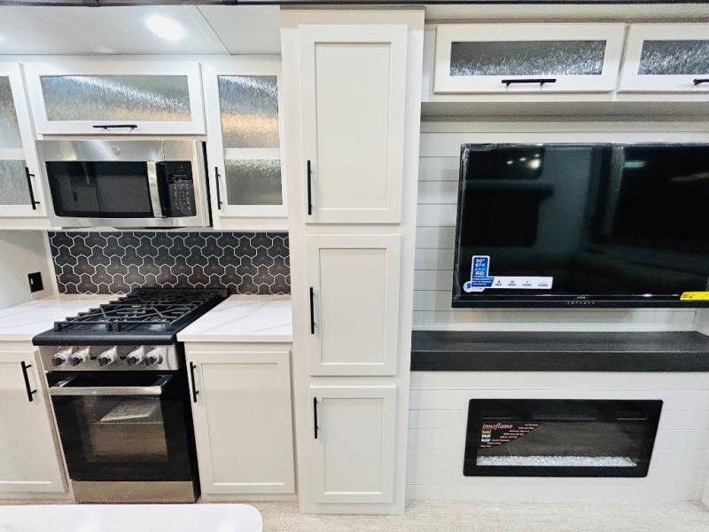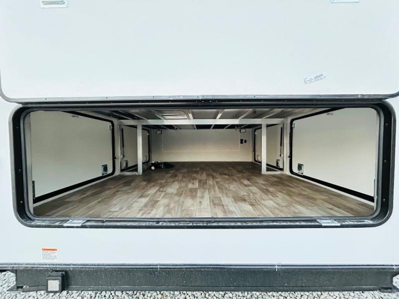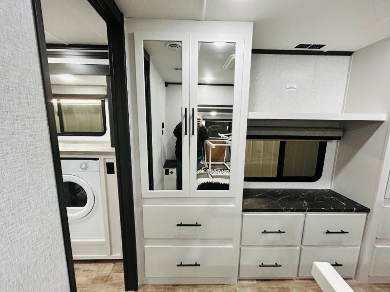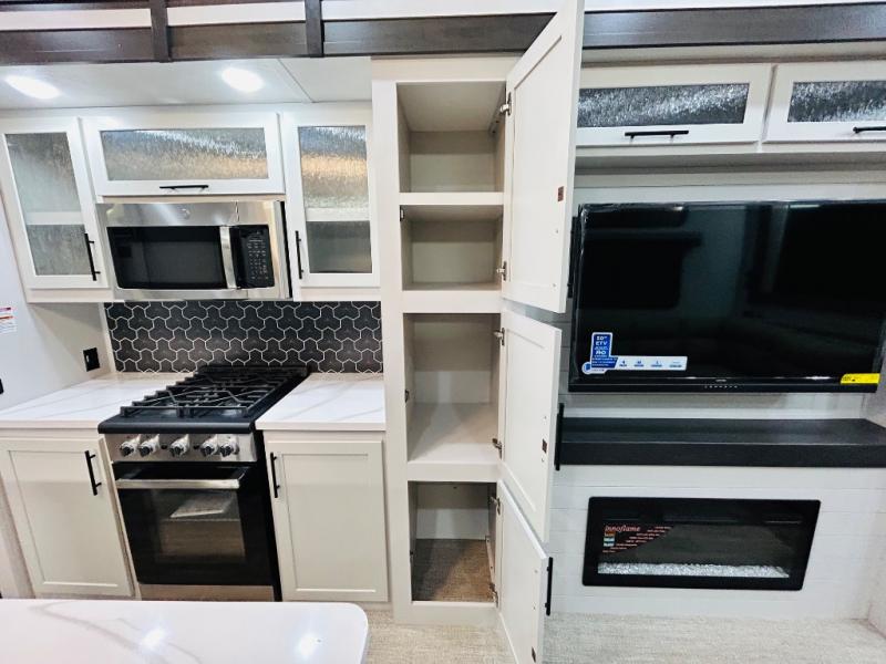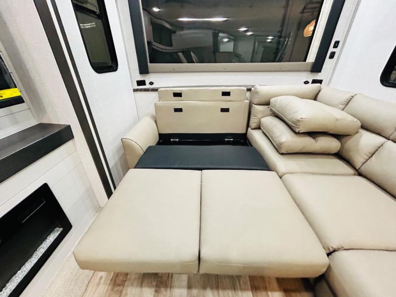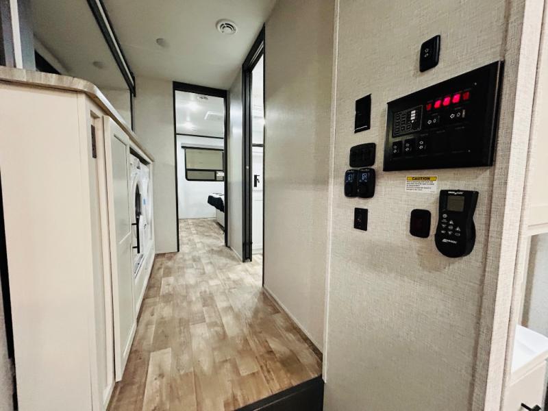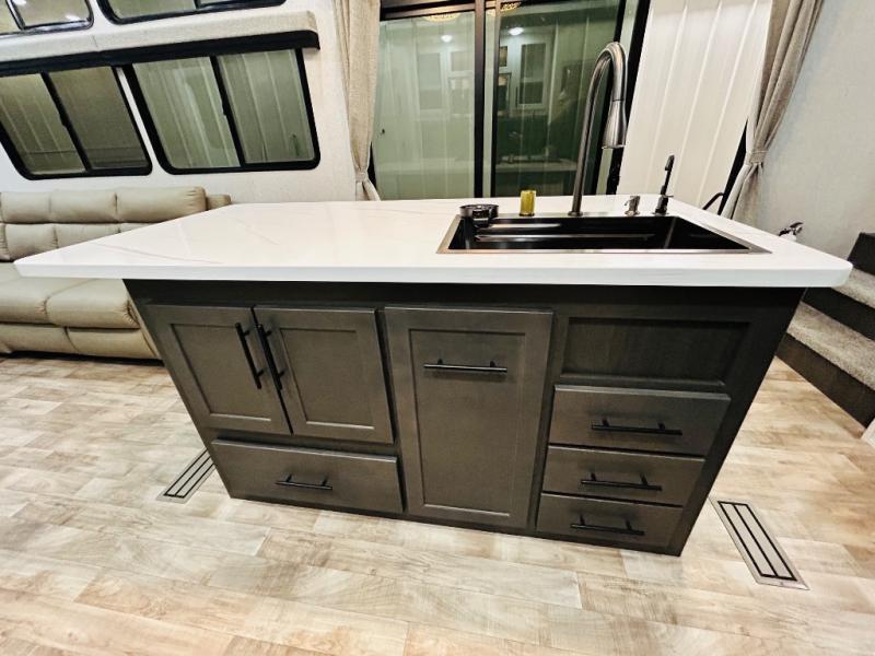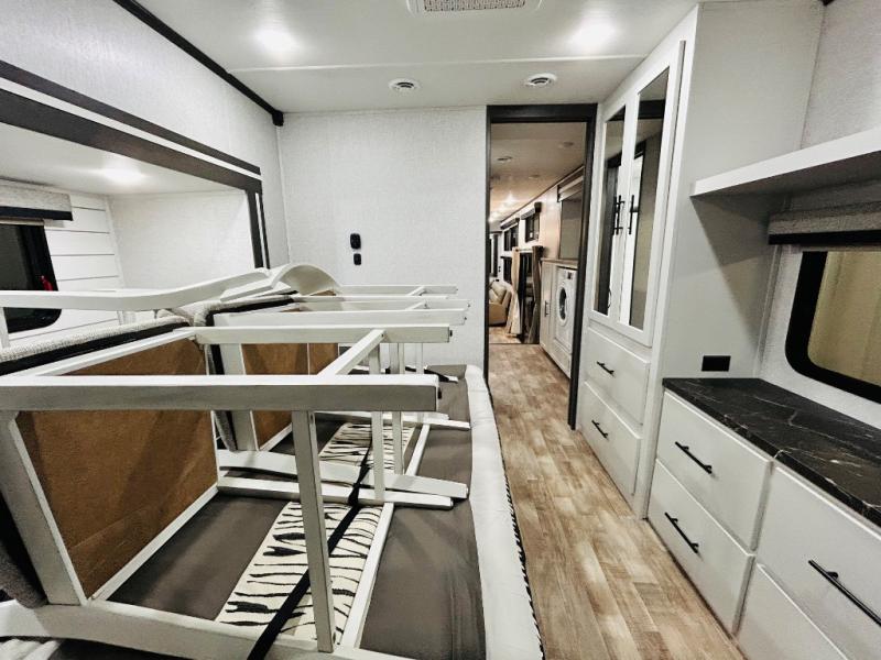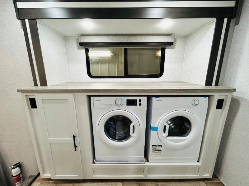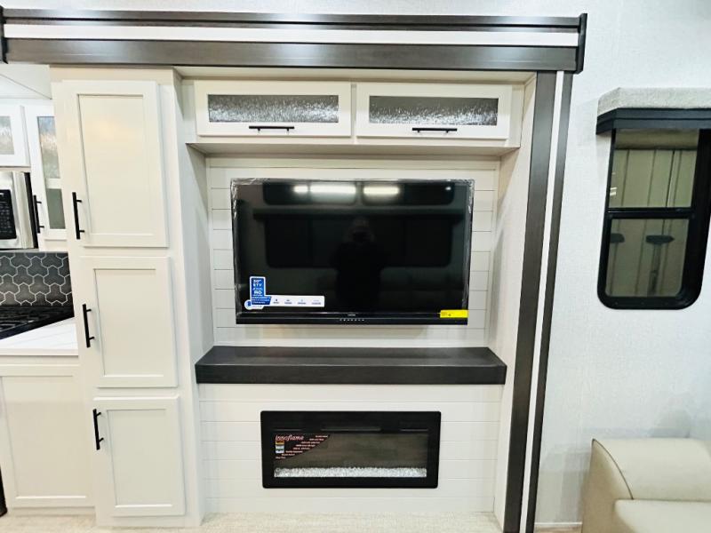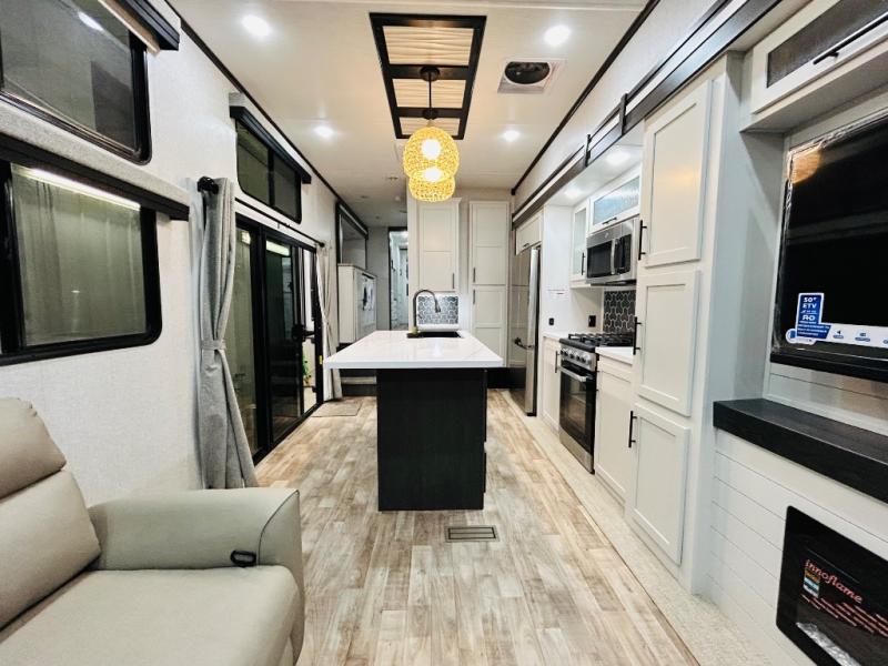 You'll love every minute spent in this spacious destination trailer. There is a front living area with an L-shaped sofa, a 65" TV plus a fireplace to make it feel more like home. You will find a large kitchen island with four stools where you can dine together each day. The kitchen also includes a pantry, closet, hutch, and overhead cabinets for tons of storage space. The full bath includes dual bath sinks and a spacious 48" shower, and right across the hall is a slide out with space for a washer/dryer. Head to the rear private bedroom where you can sleep soundly on the king bed slide out and keep your items organized in the dresser and wardrobes. And outside, you'll find five baggage doors so nothing gets left behind!
