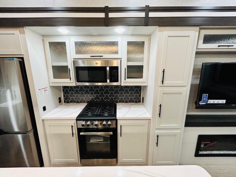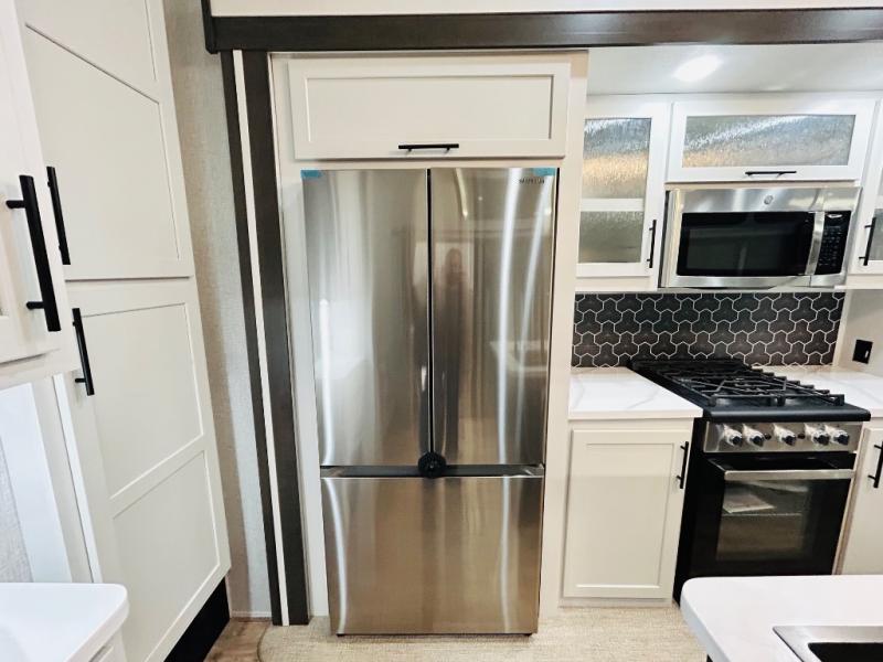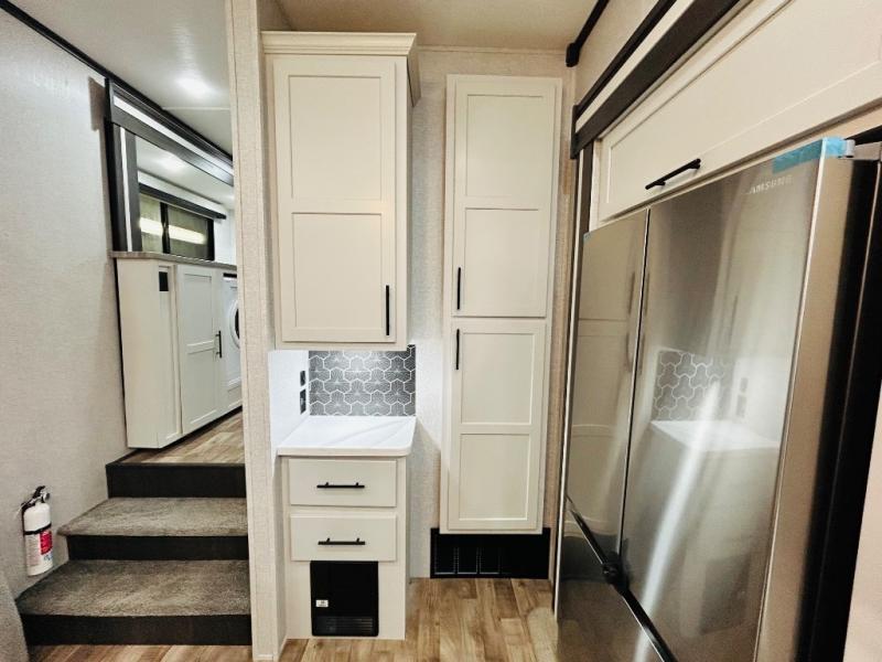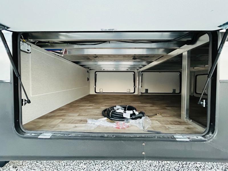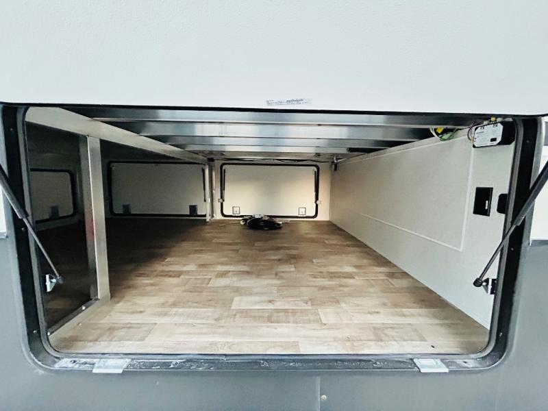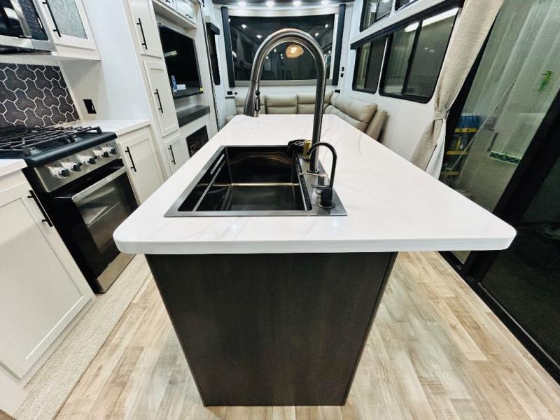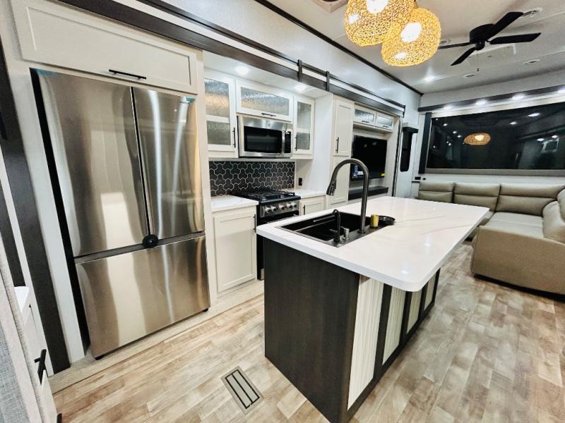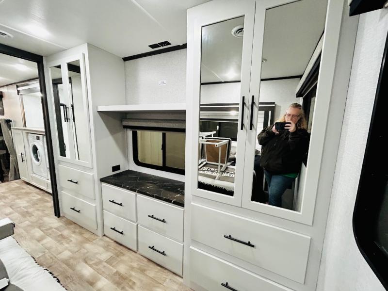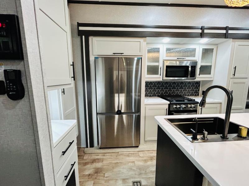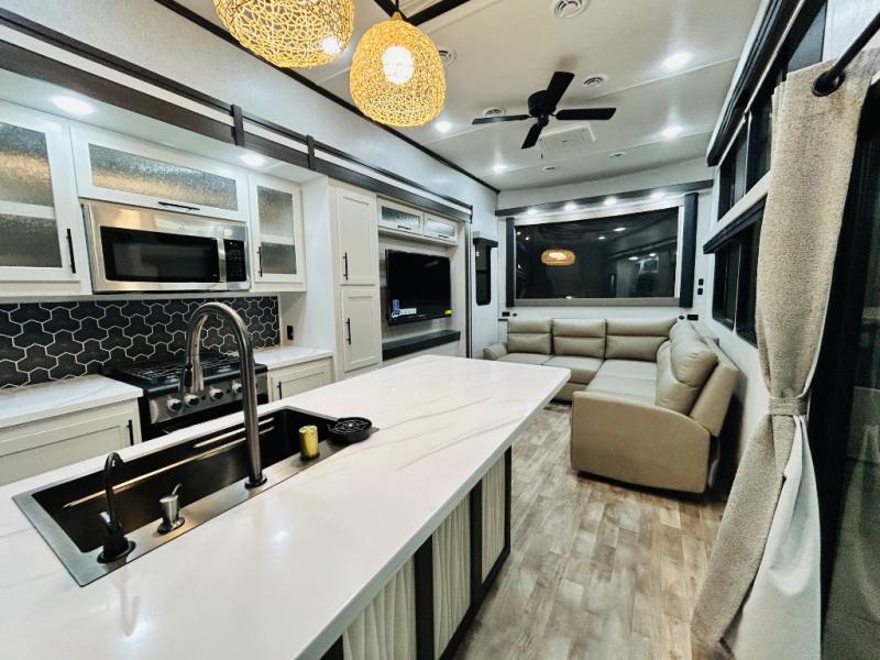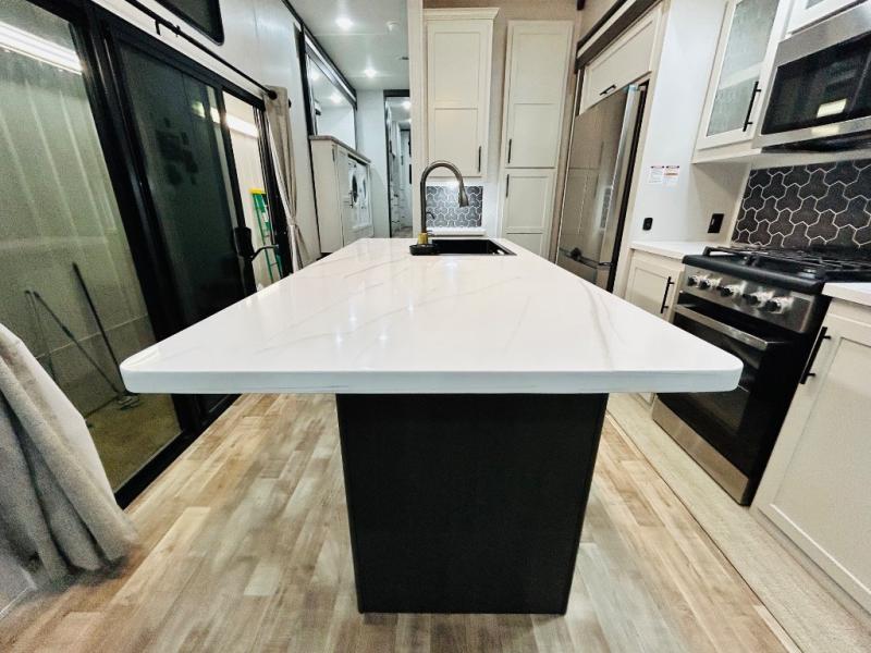 You'll love every minute spent in this spacious destination trailer. There is a front living area with an L-shaped sofa, a 65" TV plus a fireplace to make it feel more like home. You will find a large kitchen island with four stools where you can dine together each day. The kitchen also includes a pantry, closet, hutch, and overhead cabinets for tons of storage space. The full bath includes dual bath sinks and a spacious 48" shower, and right across the hall is a slide out with space for a washer/dryer. Head to the rear private bedroom where you can sleep soundly on the king bed slide out and keep your items organized in the dresser and wardrobes. And outside, you'll find five baggage doors so nothing gets left behind!