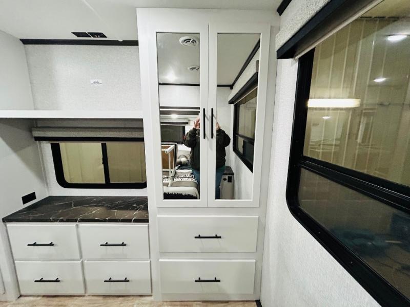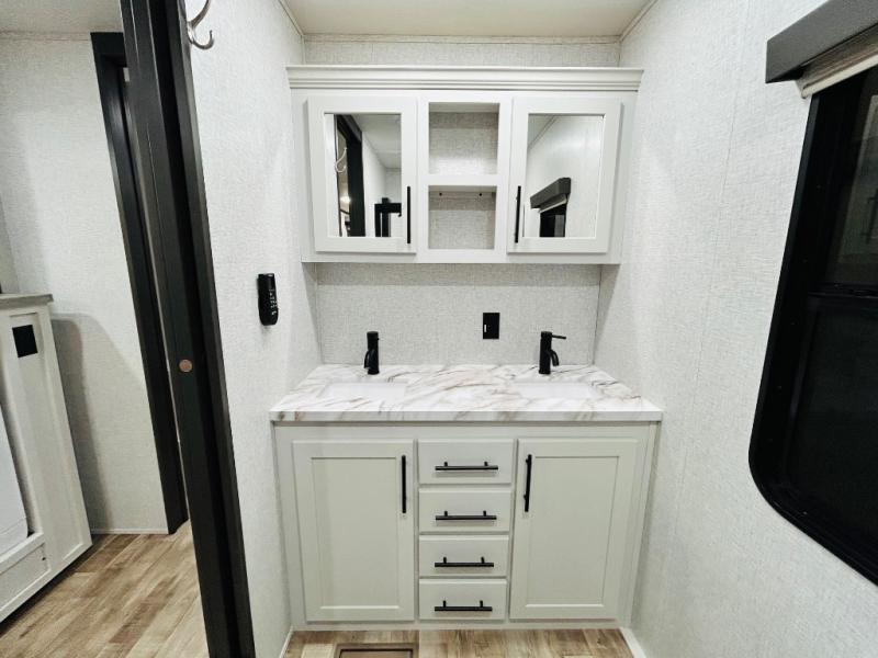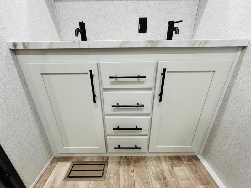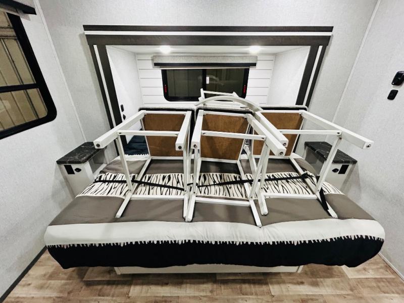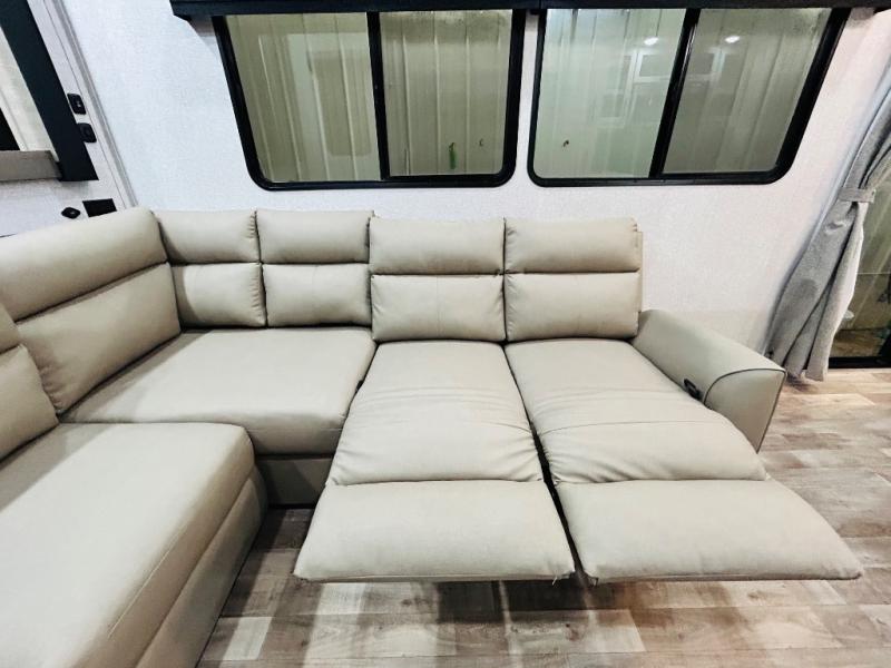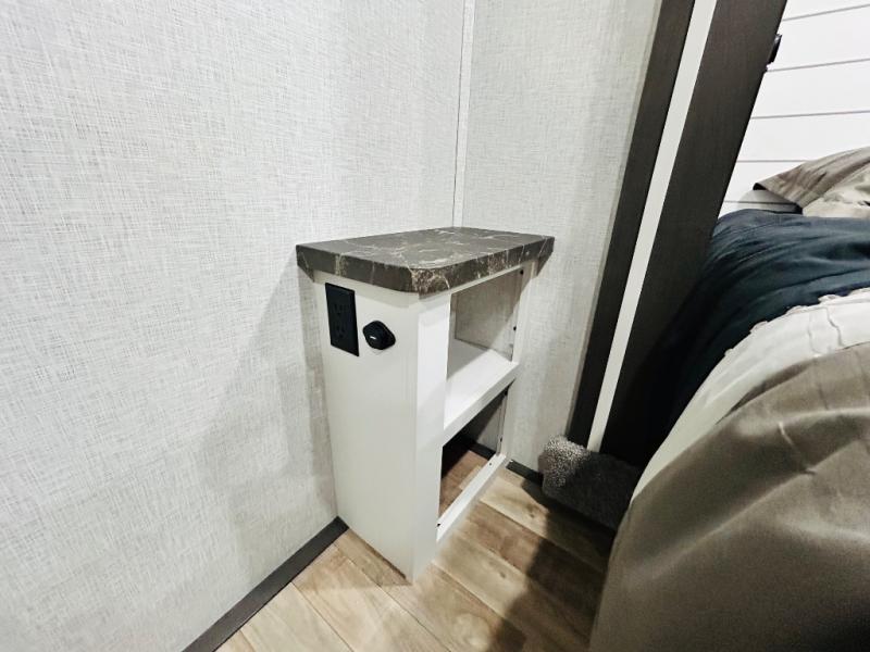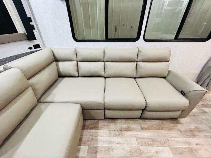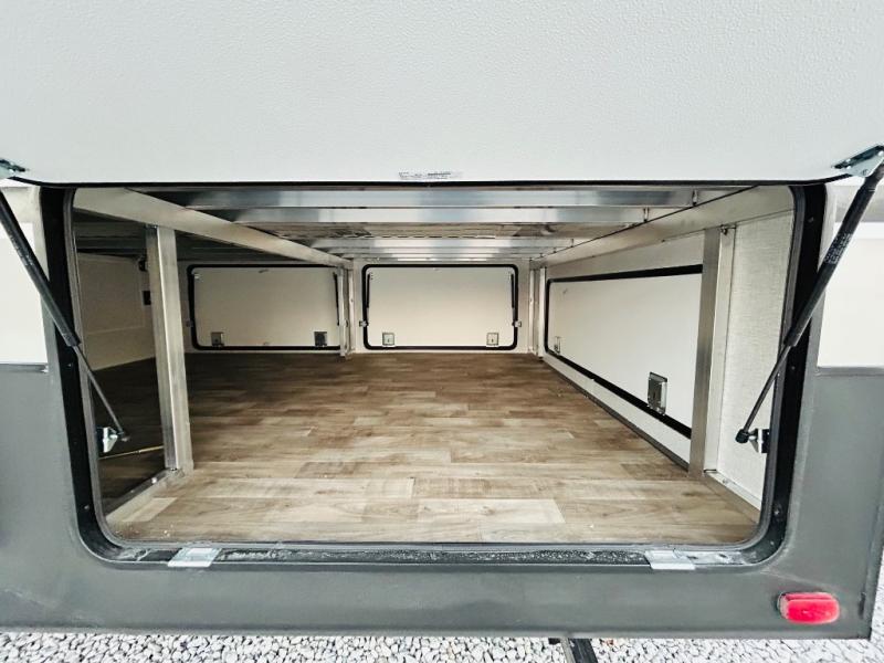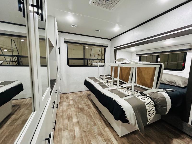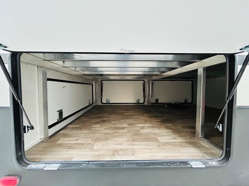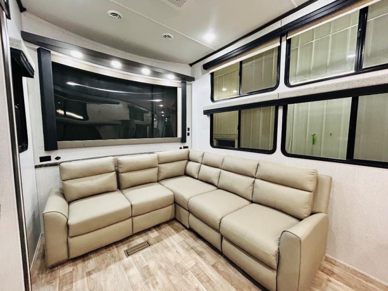 You'll love every minute spent in this spacious destination trailer. There is a front living area with an L-shaped sofa, a 65" TV plus a fireplace to make it feel more like home. You will find a large kitchen island with four stools where you can dine together each day. The kitchen also includes a pantry, closet, hutch, and overhead cabinets for tons of storage space. The full bath includes dual bath sinks and a spacious 48" shower, and right across the hall is a slide out with space for a washer/dryer. Head to the rear private bedroom where you can sleep soundly on the king bed slide out and keep your items organized in the dresser and wardrobes. And outside, you'll find five baggage doors so nothing gets left behind!