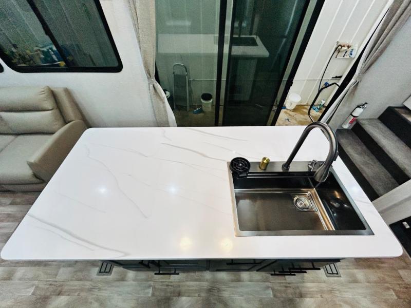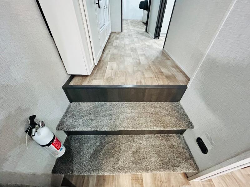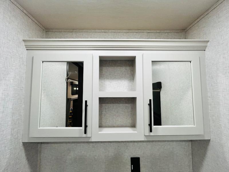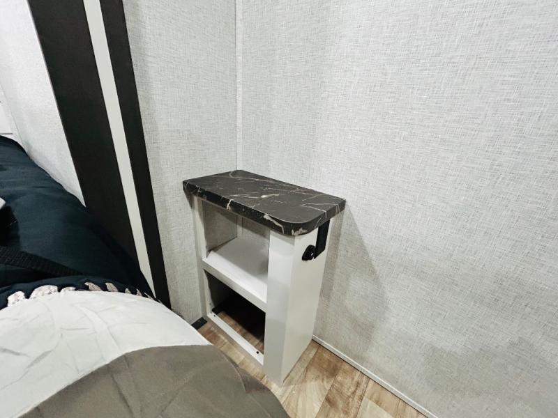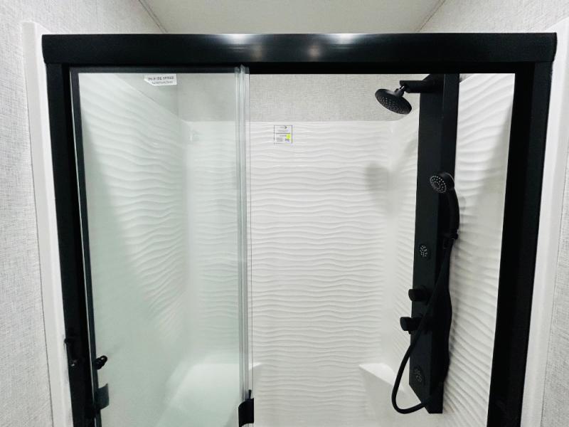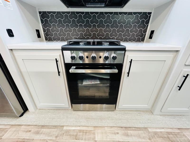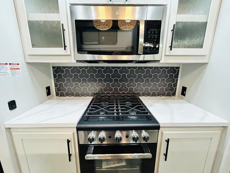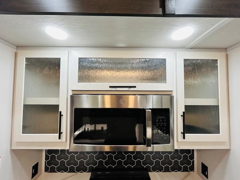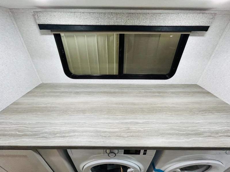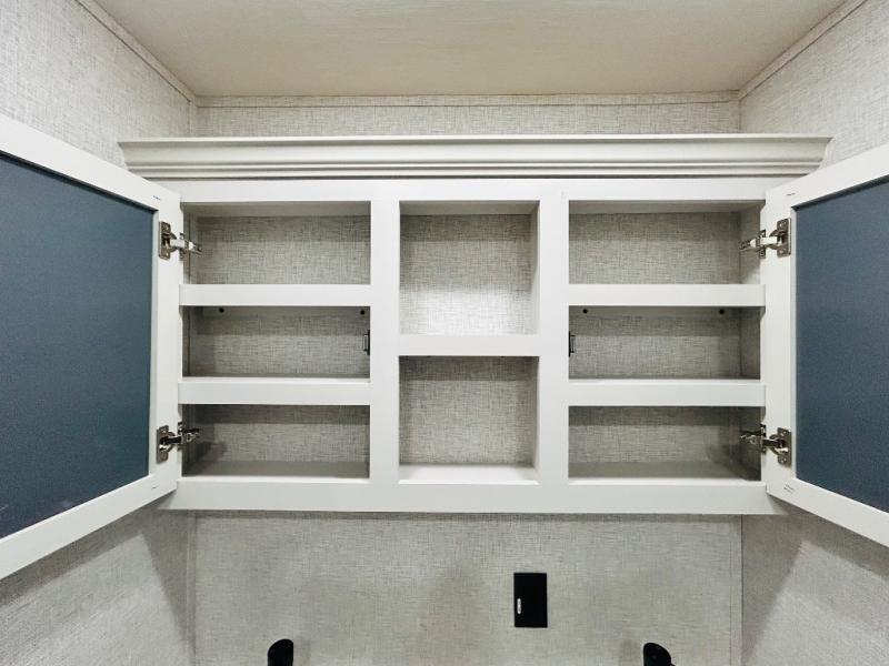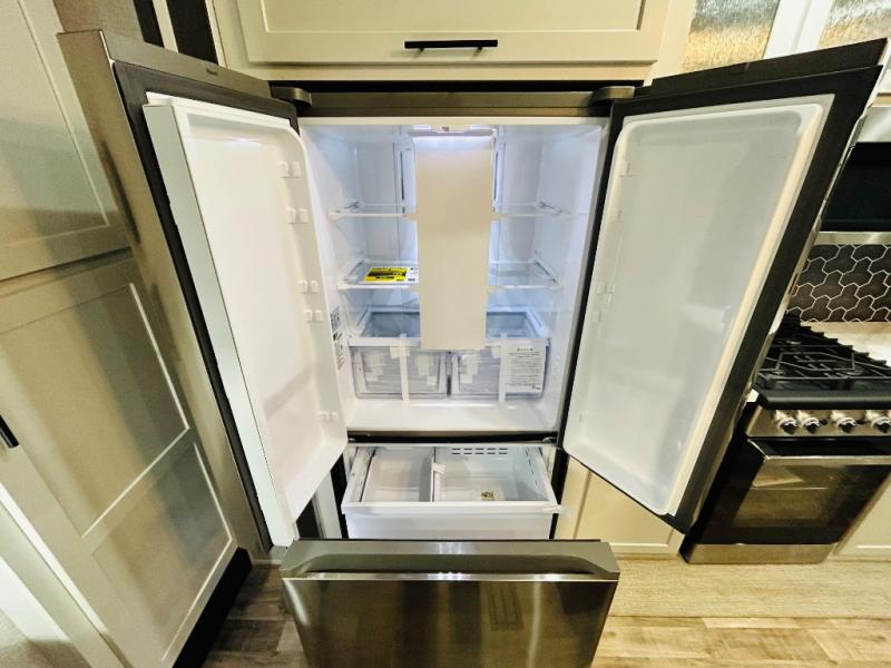 You'll love every minute spent in this spacious destination trailer. There is a front living area with an L-shaped sofa, a 65" TV plus a fireplace to make it feel more like home. You will find a large kitchen island with four stools where you can dine together each day. The kitchen also includes a pantry, closet, hutch, and overhead cabinets for tons of storage space. The full bath includes dual bath sinks and a spacious 48" shower, and right across the hall is a slide out with space for a washer/dryer. Head to the rear private bedroom where you can sleep soundly on the king bed slide out and keep your items organized in the dresser and wardrobes. And outside, you'll find five baggage doors so nothing gets left behind!