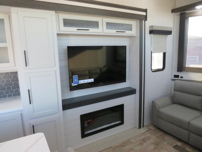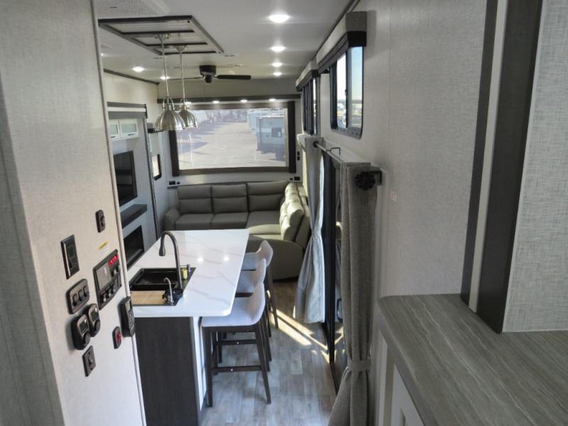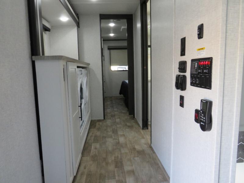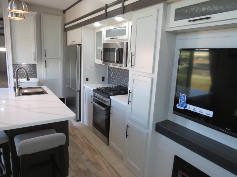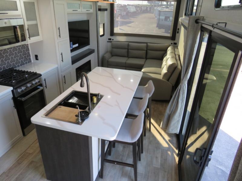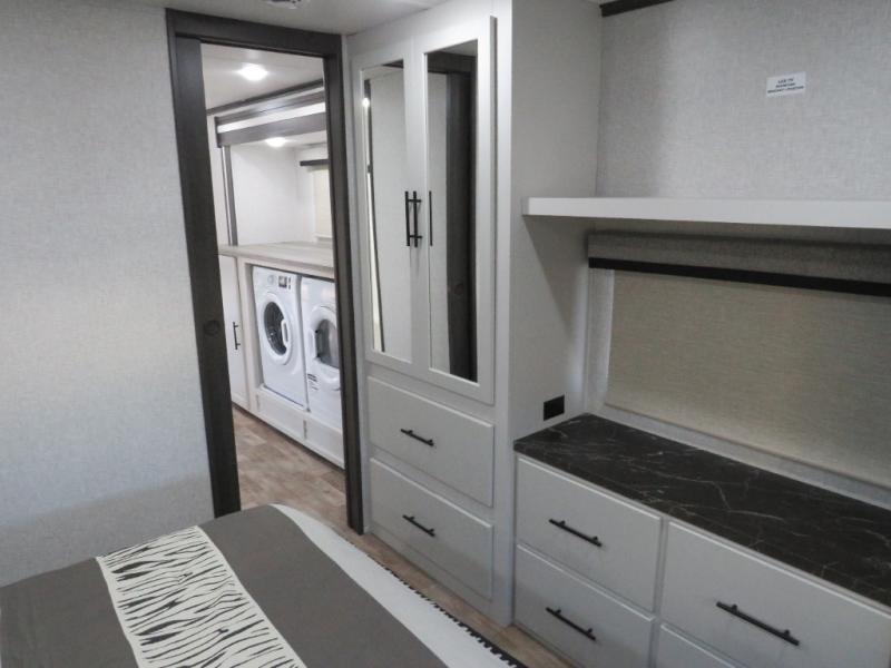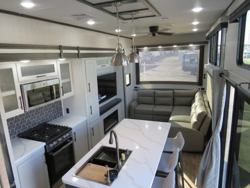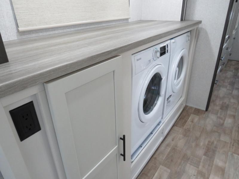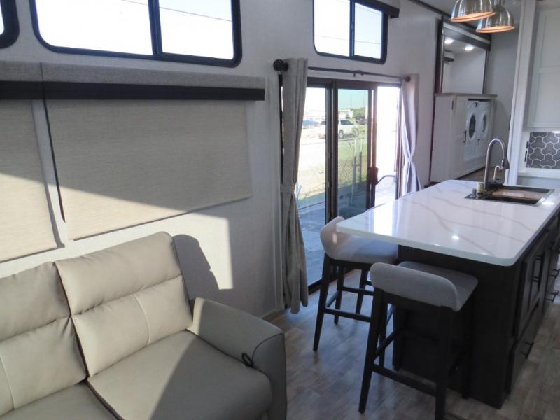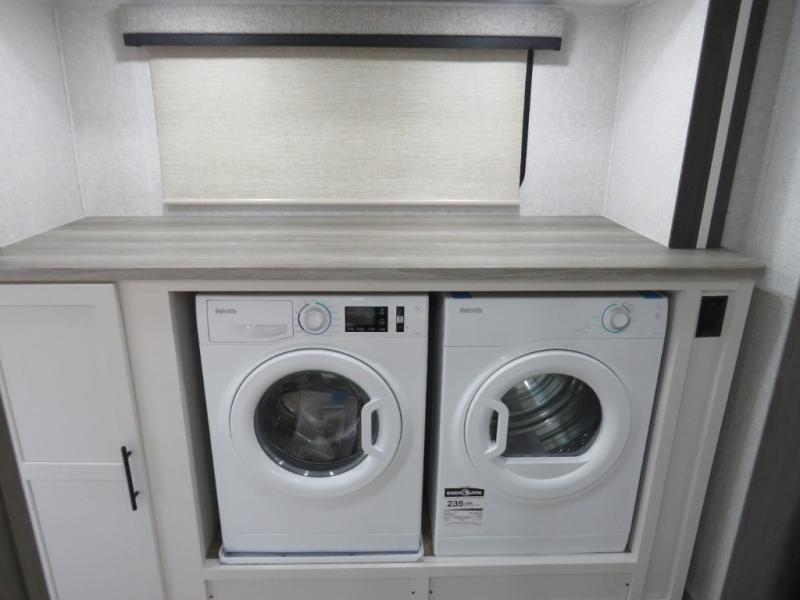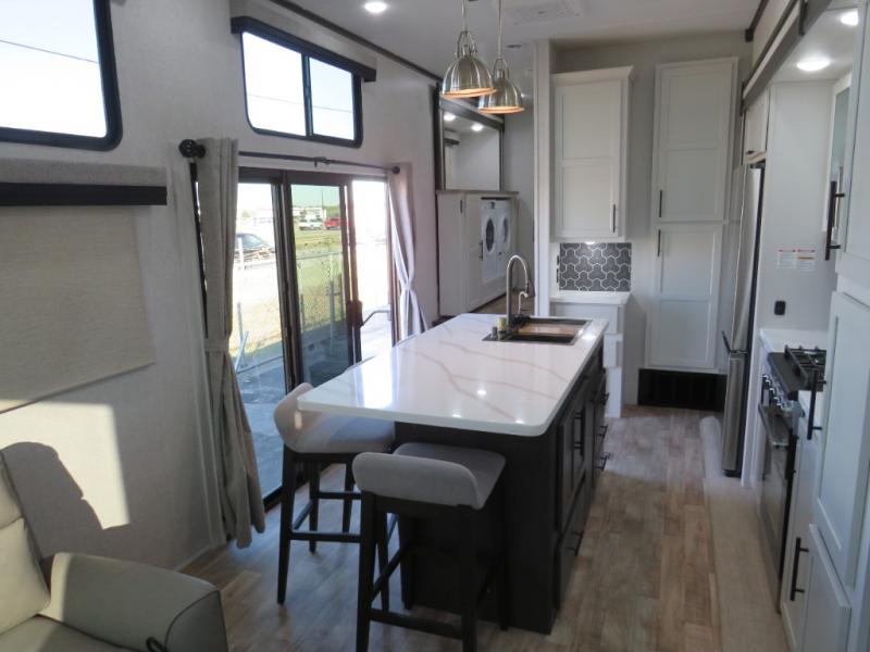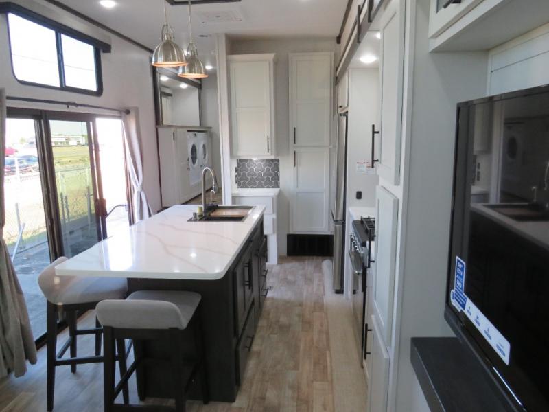You'll love every minute spent in this spacious destination trailer. There is a front living area with an L-shaped sofa, a 65" TV plus a fireplace to make it feel more like home. You will find a large kitchen island with four stools where you can dine together each day. The kitchen also includes a pantry, closet, hutch, and overhead cabinets for tons of storage space. The full bath includes dual bath sinks and a spacious 48" shower, and right across the hall is a slide out with space for a washer/dryer. Head to the rear private bedroom where you can sleep soundly on the king bed slide out and keep your items organized in the dresser and wardrobes. And outside, you'll find five baggage doors so nothing gets left behind!