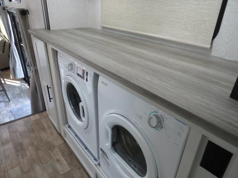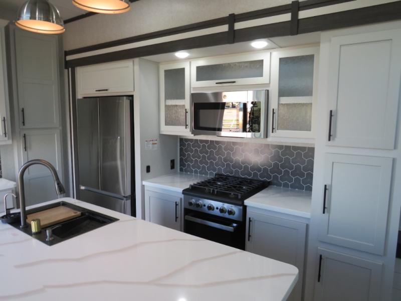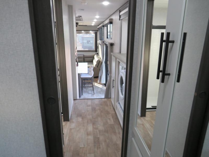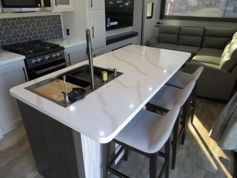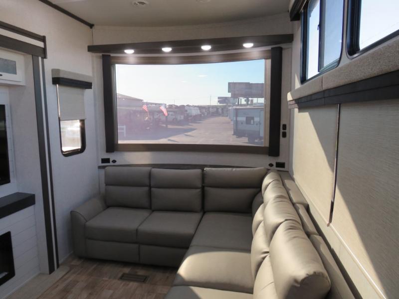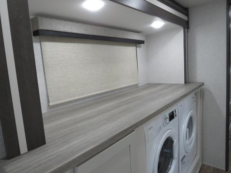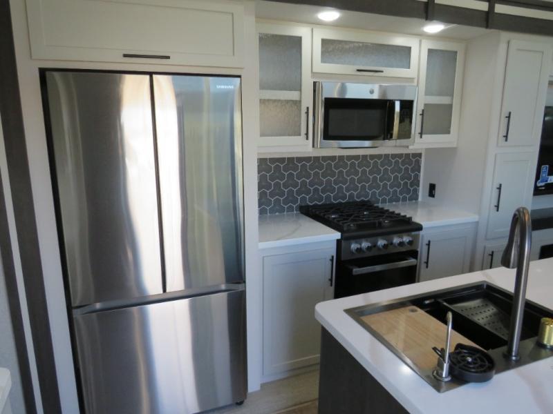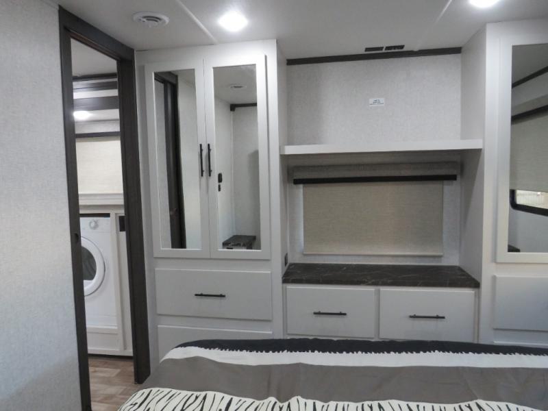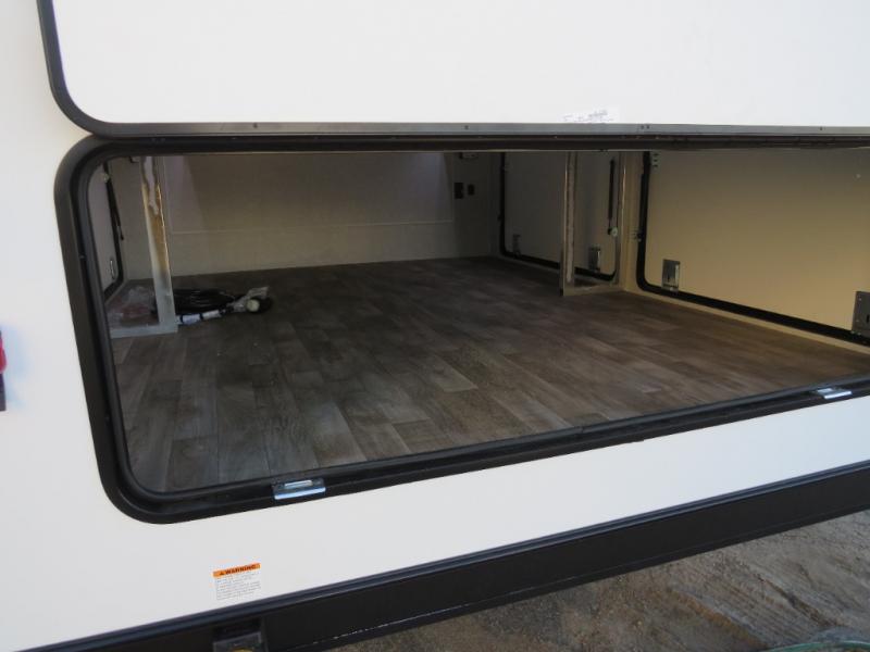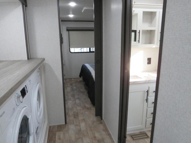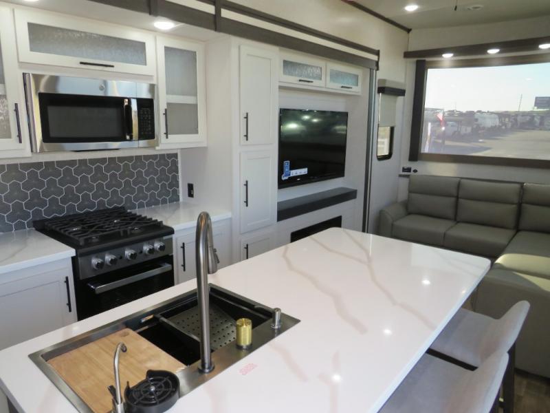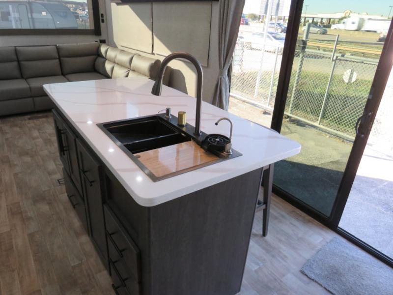 You'll love every minute spent in this spacious destination trailer. There is a front living area with an L-shaped sofa, a 65" TV plus a fireplace to make it feel more like home. You will find a large kitchen island with four stools where you can dine together each day. The kitchen also includes a pantry, closet, hutch, and overhead cabinets for tons of storage space. The full bath includes dual bath sinks and a spacious 48" shower, and right across the hall is a slide out with space for a washer/dryer. Head to the rear private bedroom where you can sleep soundly on the king bed slide out and keep your items organized in the dresser and wardrobes. And outside, you'll find five baggage doors so nothing gets left behind!