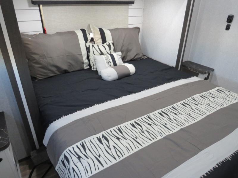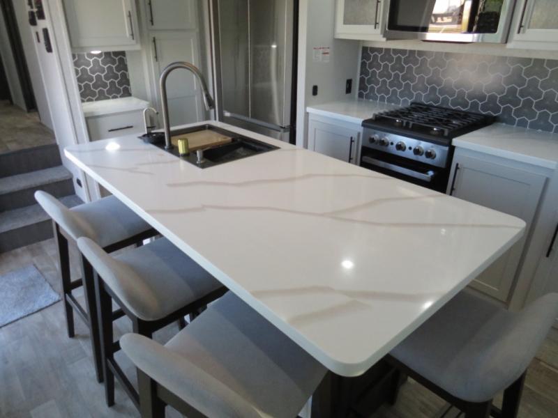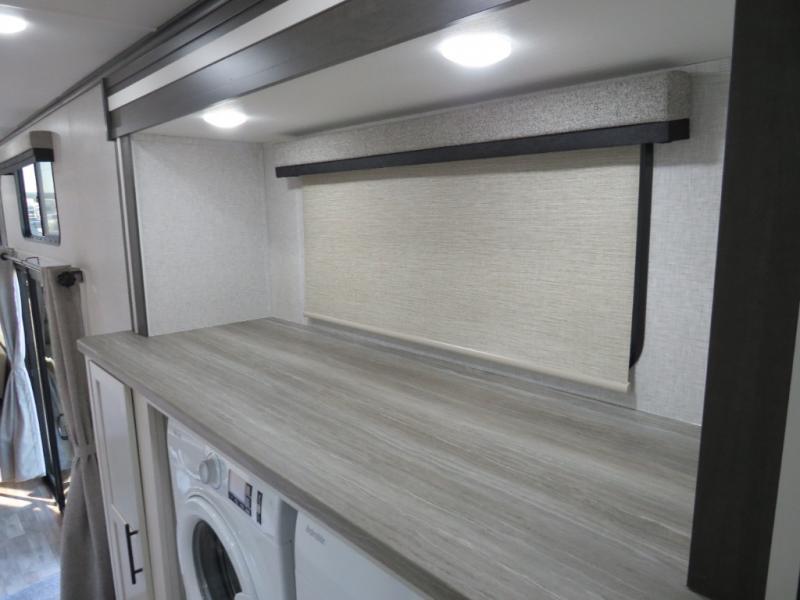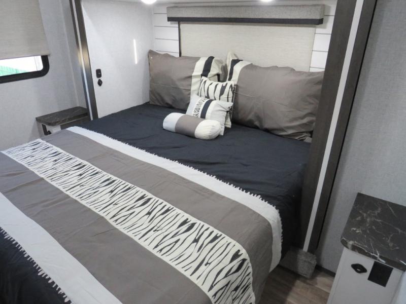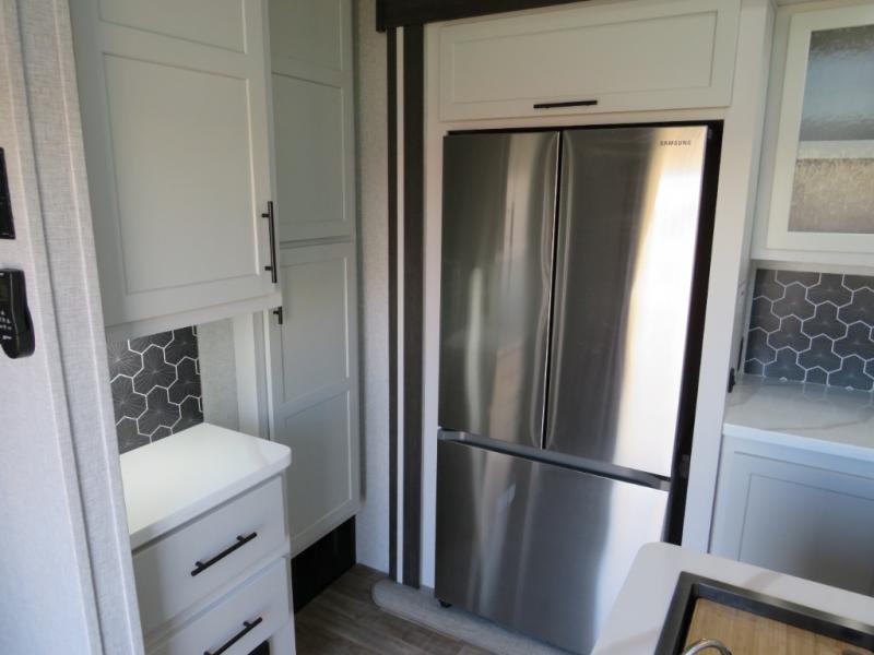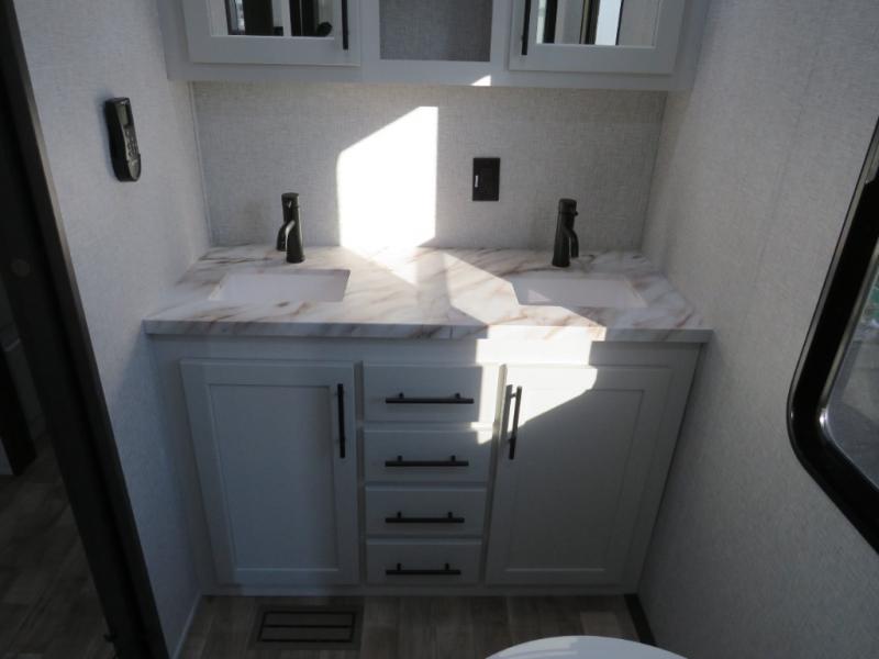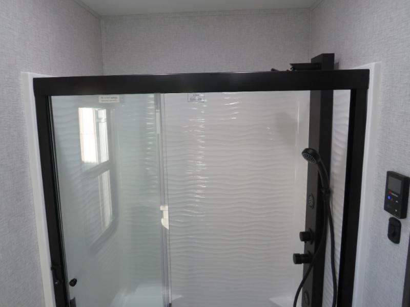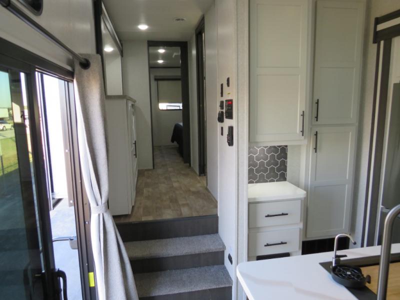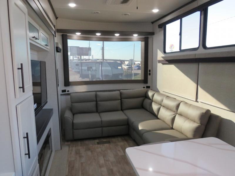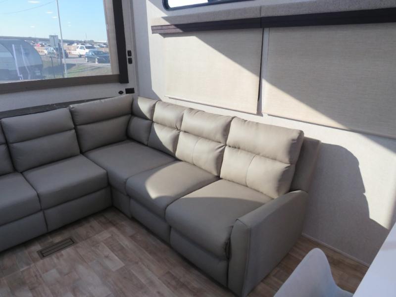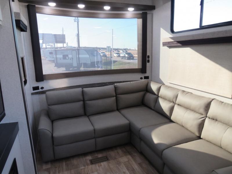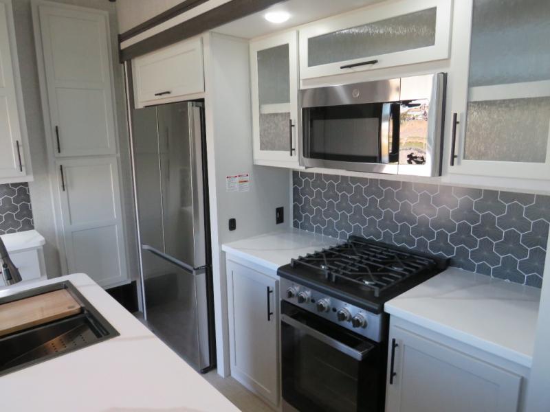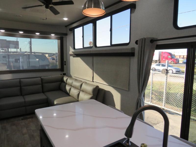 You'll love every minute spent in this spacious destination trailer. There is a front living area with an L-shaped sofa, a 65" TV plus a fireplace to make it feel more like home. You will find a large kitchen island with four stools where you can dine together each day. The kitchen also includes a pantry, closet, hutch, and overhead cabinets for tons of storage space. The full bath includes dual bath sinks and a spacious 48" shower, and right across the hall is a slide out with space for a washer/dryer. Head to the rear private bedroom where you can sleep soundly on the king bed slide out and keep your items organized in the dresser and wardrobes. And outside, you'll find five baggage doors so nothing gets left behind!