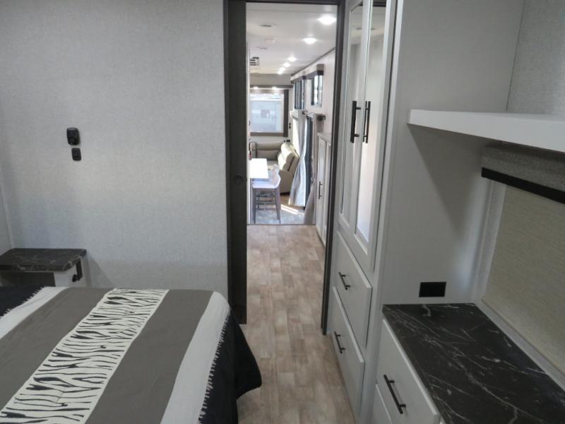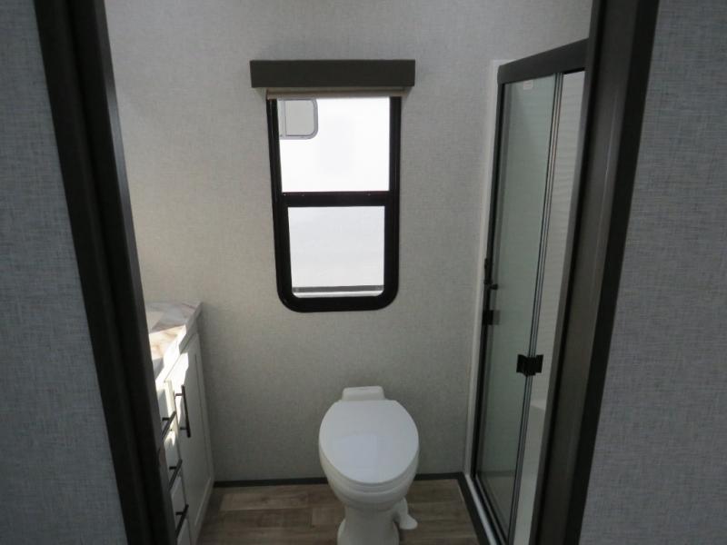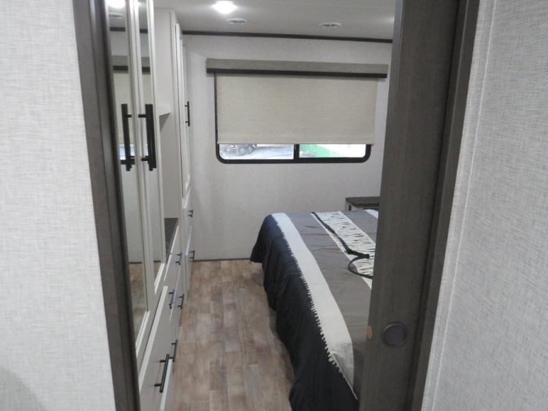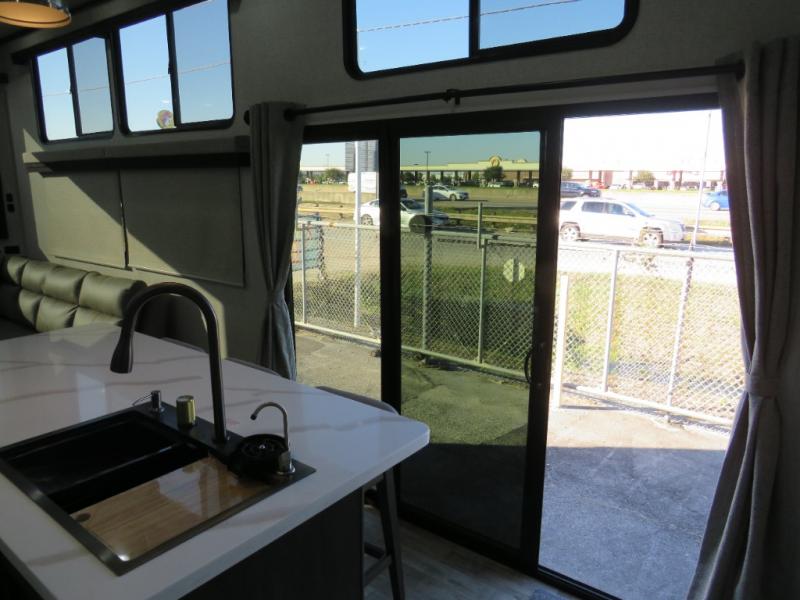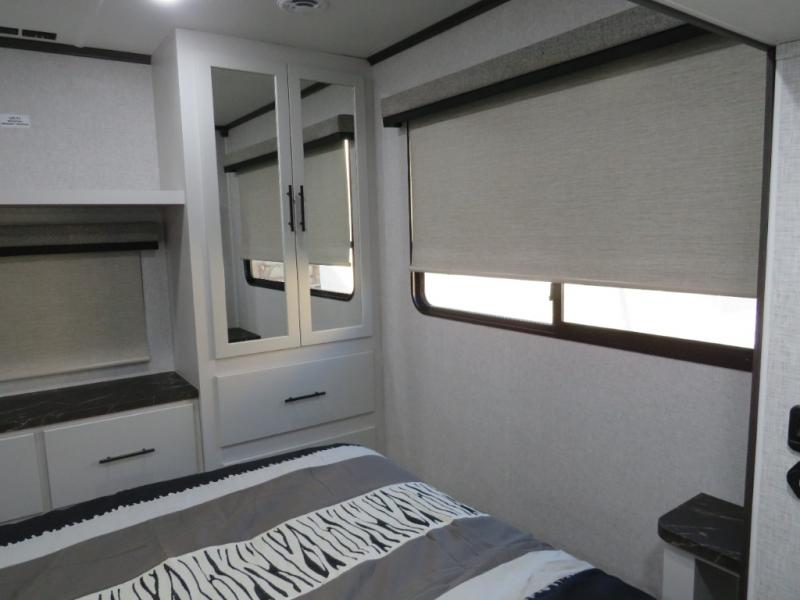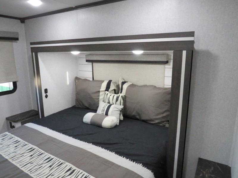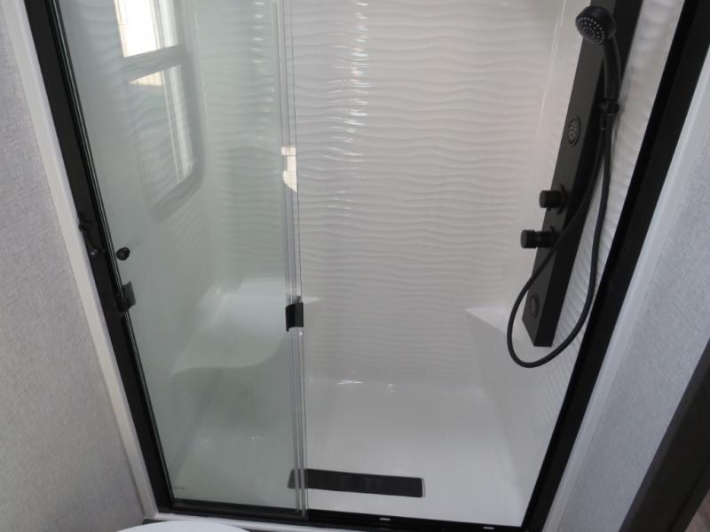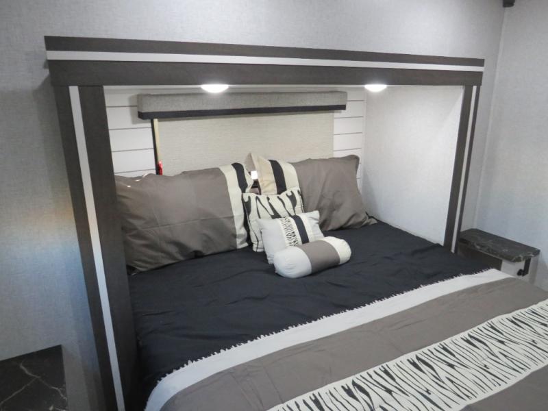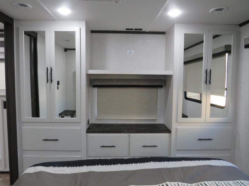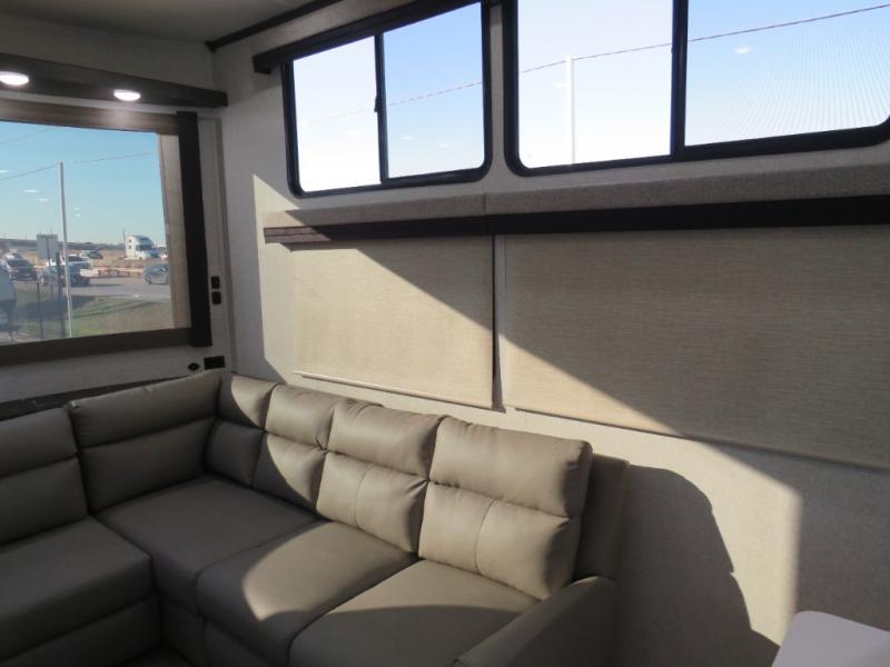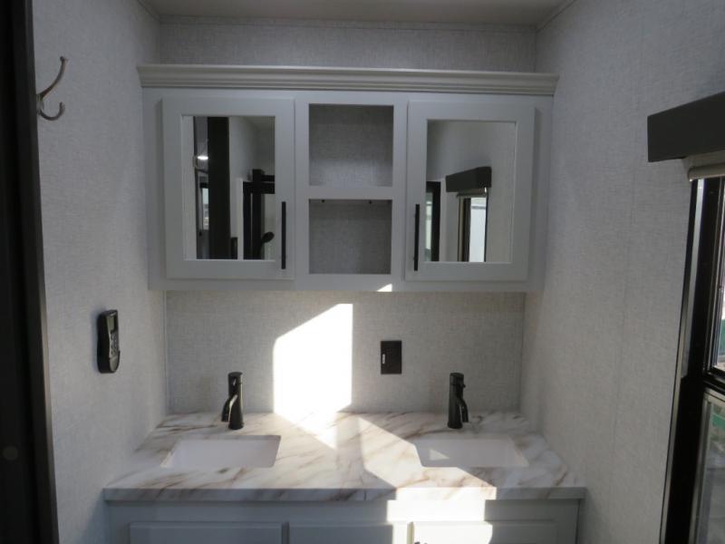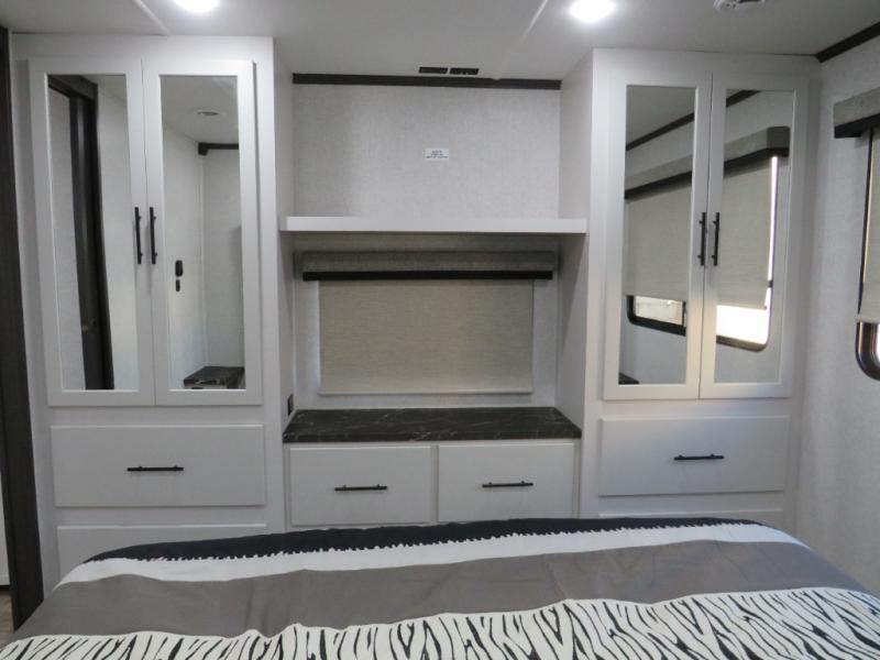 You'll love every minute spent in this spacious destination trailer. There is a front living area with an L-shaped sofa, a 65" TV plus a fireplace to make it feel more like home. You will find a large kitchen island with four stools where you can dine together each day. The kitchen also includes a pantry, closet, hutch, and overhead cabinets for tons of storage space. The full bath includes dual bath sinks and a spacious 48" shower, and right across the hall is a slide out with space for a washer/dryer. Head to the rear private bedroom where you can sleep soundly on the king bed slide out and keep your items organized in the dresser and wardrobes. And outside, you'll find five baggage doors so nothing gets left behind!