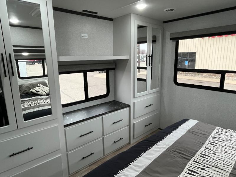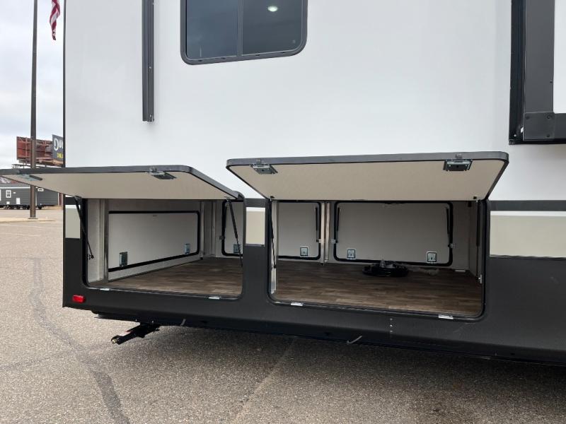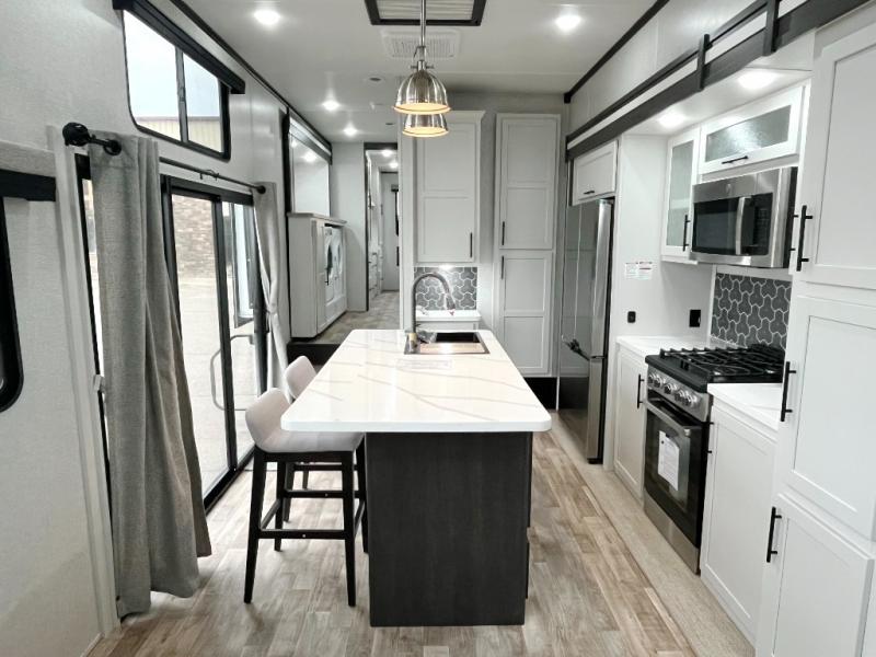 You'll love every minute spent in this spacious destination trailer. There is a front living area with an L-shaped sofa, a 65" TV plus a fireplace to make it feel more like home. You will find a large kitchen island with four stools where you can dine together each day. The kitchen also includes a pantry, closet, hutch, and overhead cabinets for tons of storage space. The full bath includes dual bath sinks and a spacious 48" shower, and right across the hall is a slide out with space for a washer/dryer. Head to the rear private bedroom where you can sleep soundly on the king bed slide out and keep your items organized in the dresser and wardrobes. And outside, you'll find five baggage doors so nothing gets left behind!