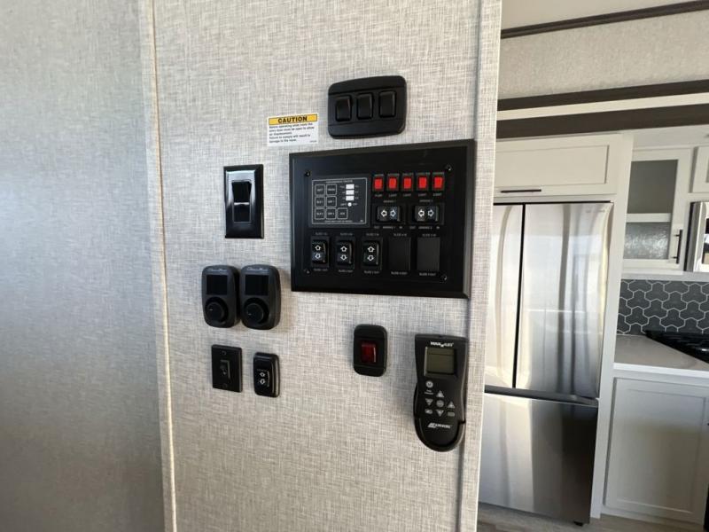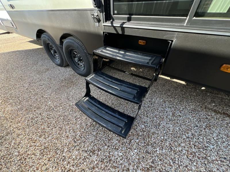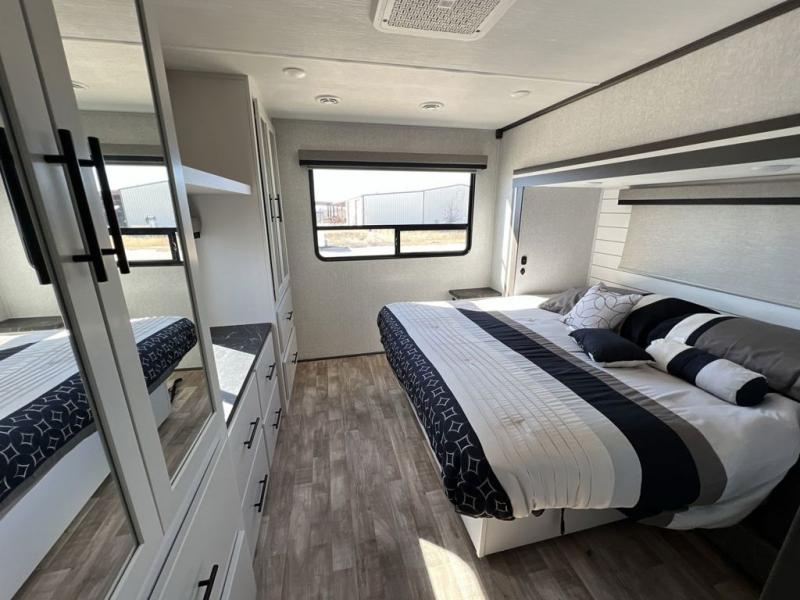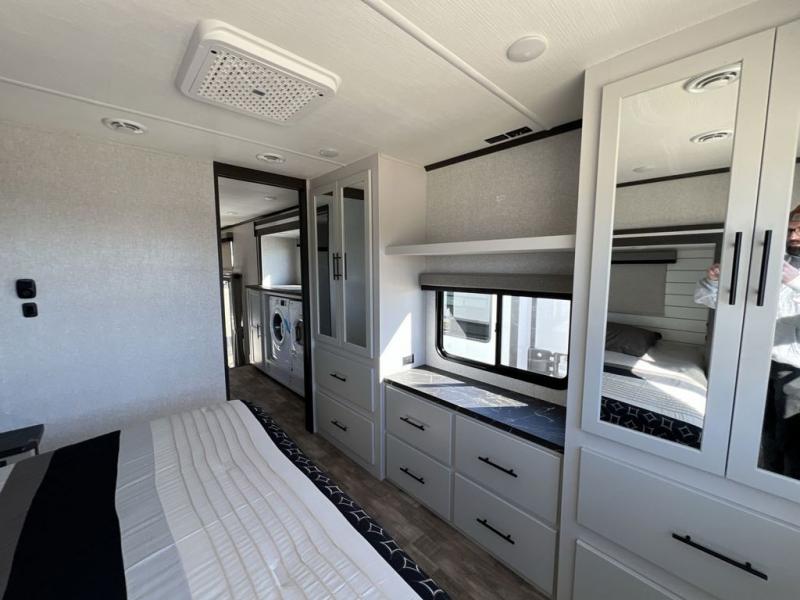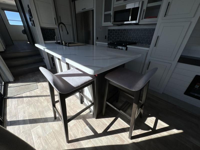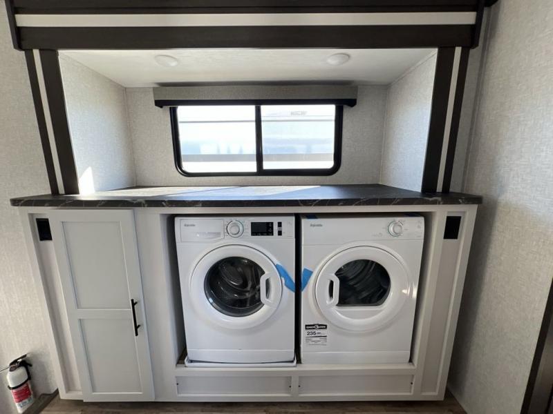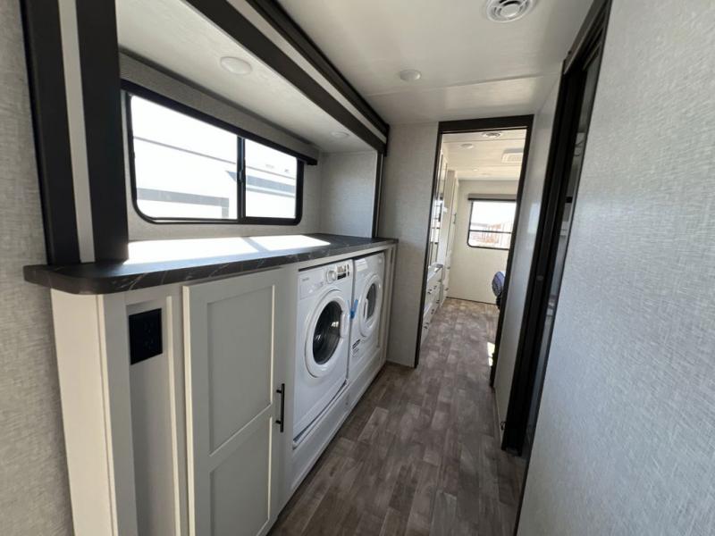 You'll love every minute spent in this spacious destination trailer. There is a front living area with an L-shaped sofa, a 65" TV plus a fireplace to make it feel more like home. You will find a large kitchen island with four stools where you can dine together each day. The kitchen also includes a pantry, closet, hutch, and overhead cabinets for tons of storage space. The full bath includes dual bath sinks and a spacious 48" shower, and right across the hall is a slide out with space for a washer/dryer. Head to the rear private bedroom where you can sleep soundly on the king bed slide out and keep your items organized in the dresser and wardrobes. And outside, you'll find five baggage doors so nothing gets left behind!