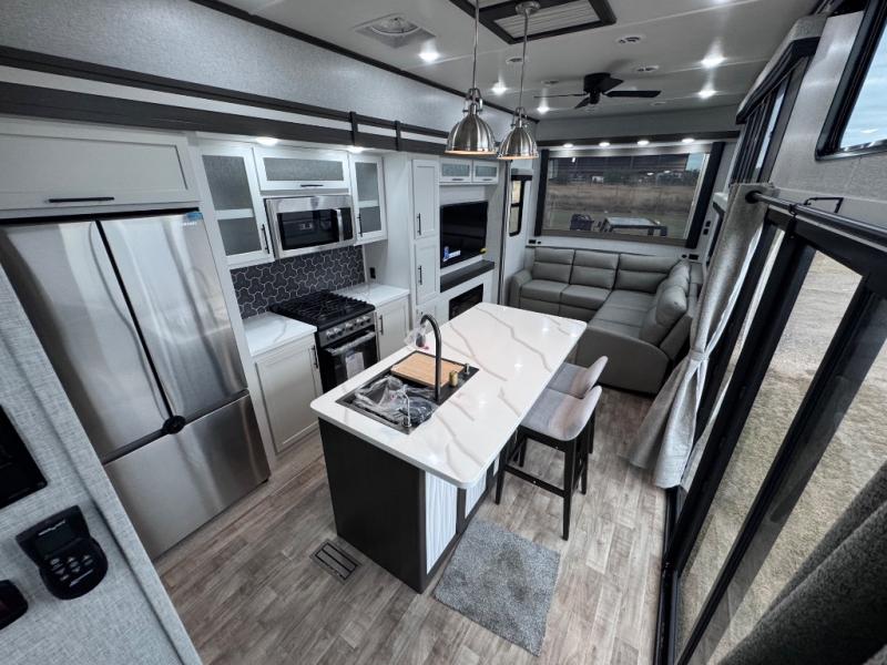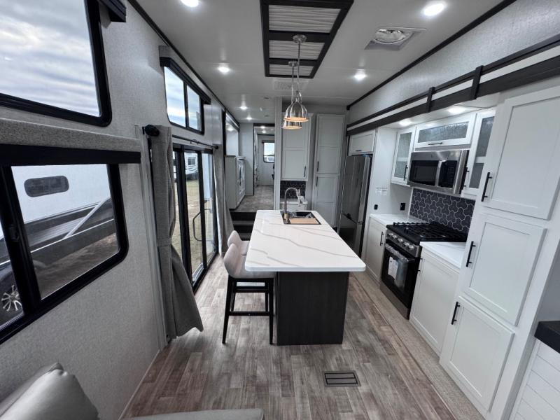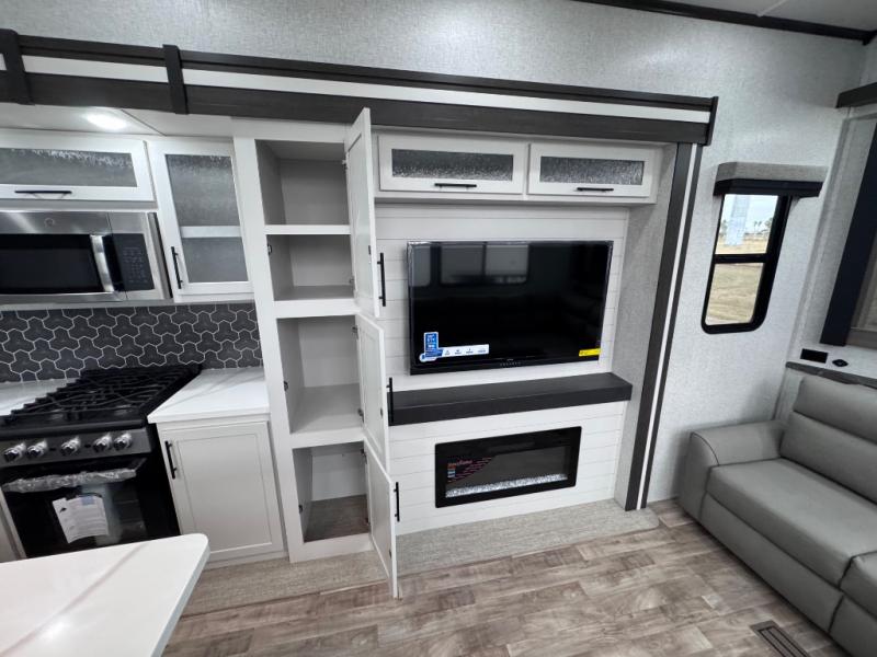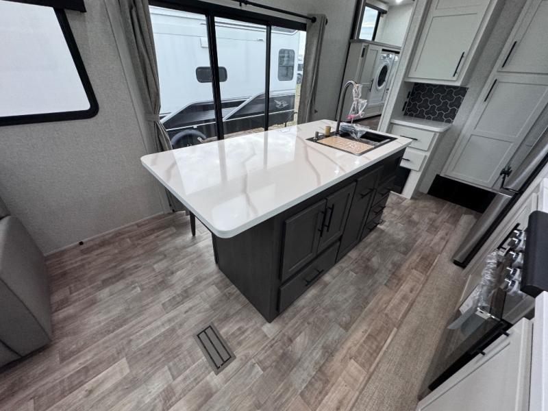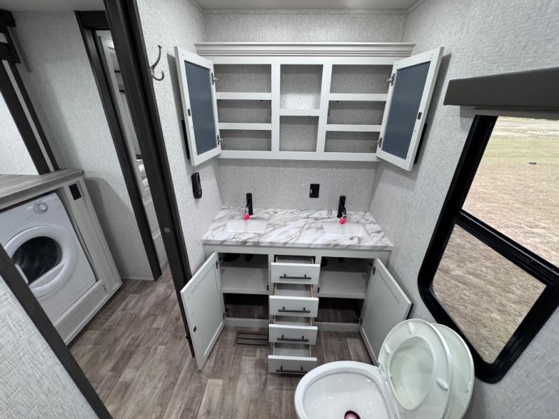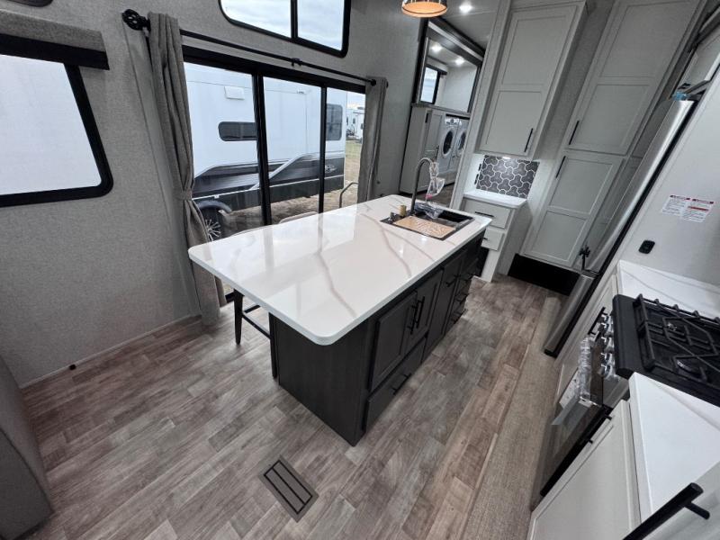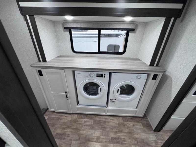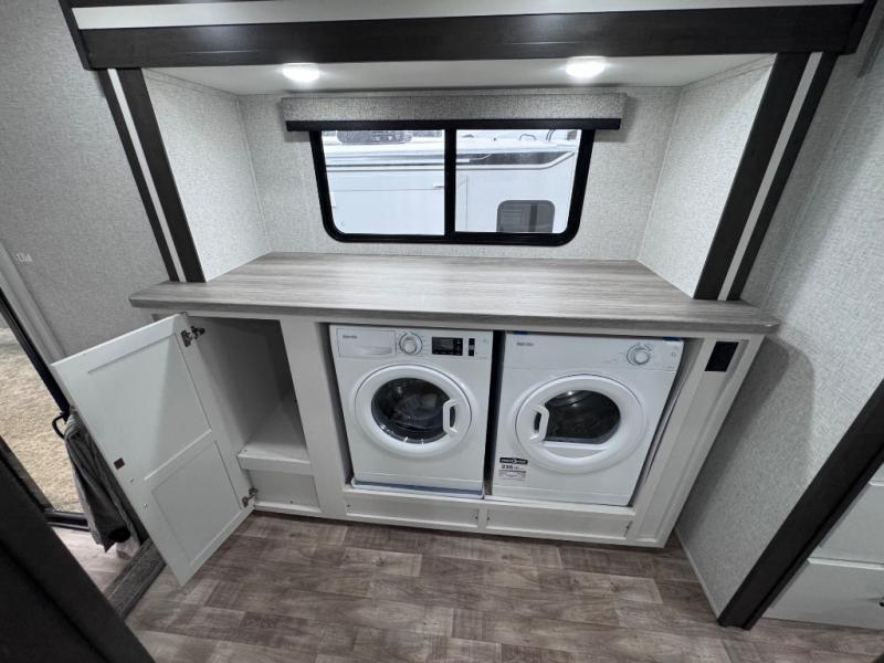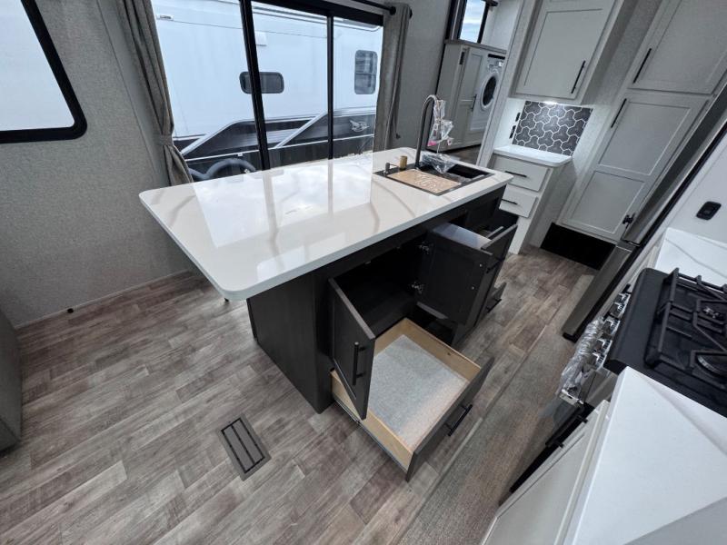 You'll love every minute spent in this spacious destination trailer. There is a front living area with an L-shaped sofa, a 65" TV plus a fireplace to make it feel more like home. You will find a large kitchen island with four stools where you can dine together each day. The kitchen also includes a pantry, closet, hutch, and overhead cabinets for tons of storage space. The full bath includes dual bath sinks and a spacious 48" shower, and right across the hall is a slide out with space for a washer/dryer. Head to the rear private bedroom where you can sleep soundly on the king bed slide out and keep your items organized in the dresser and wardrobes. And outside, you'll find five baggage doors so nothing gets left behind!