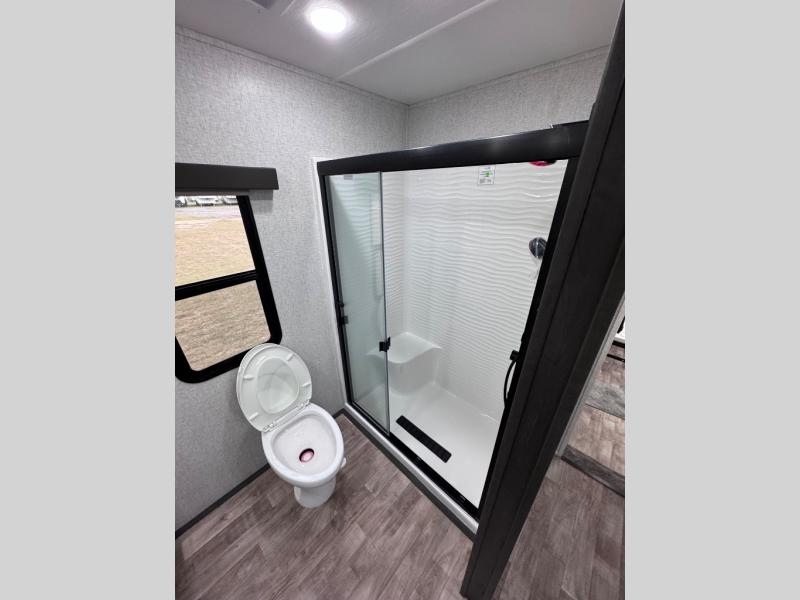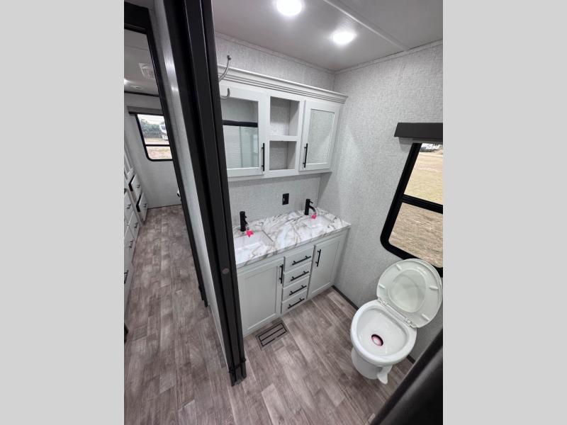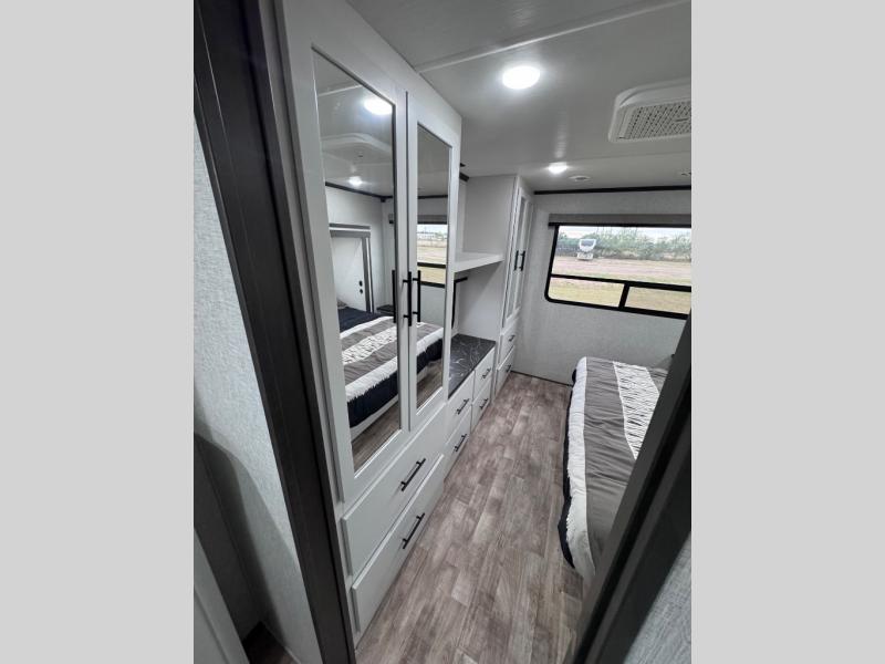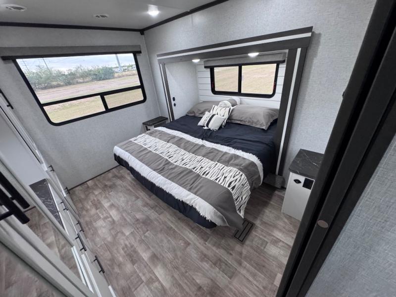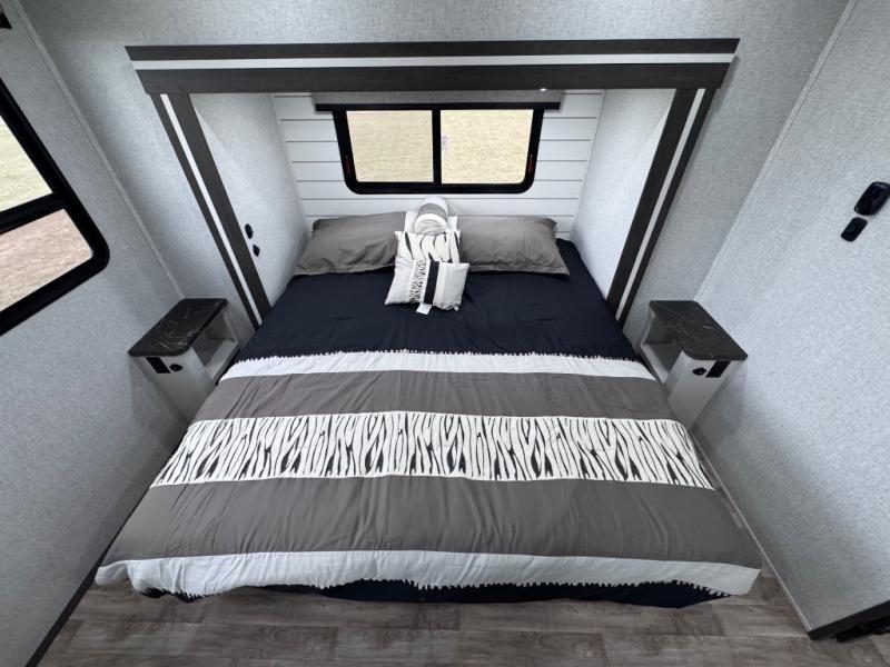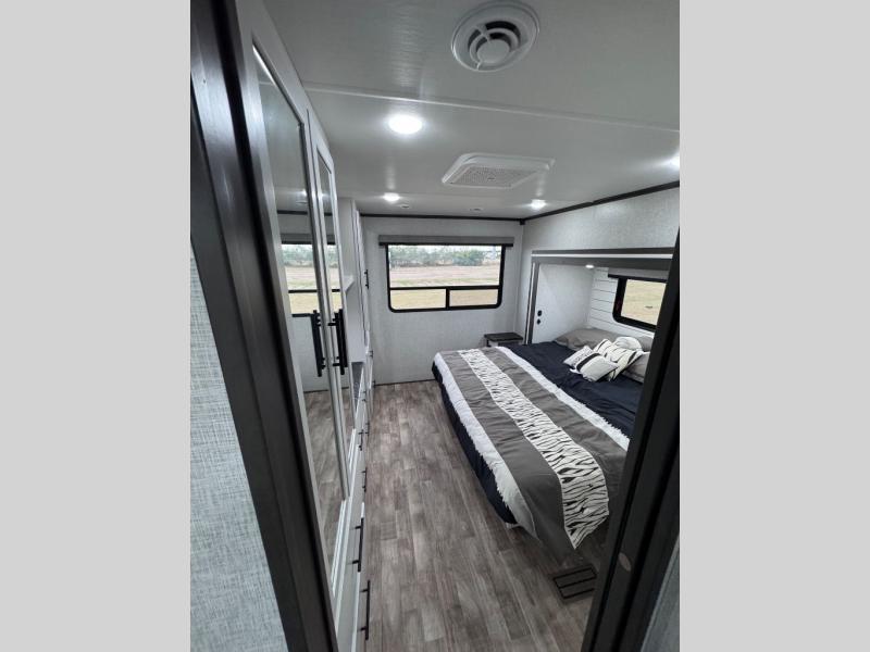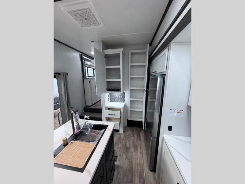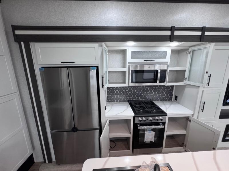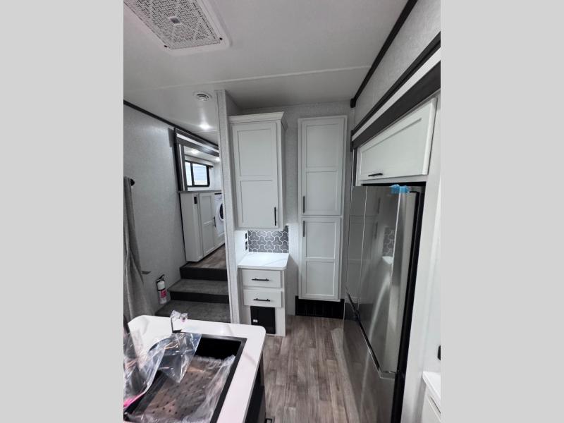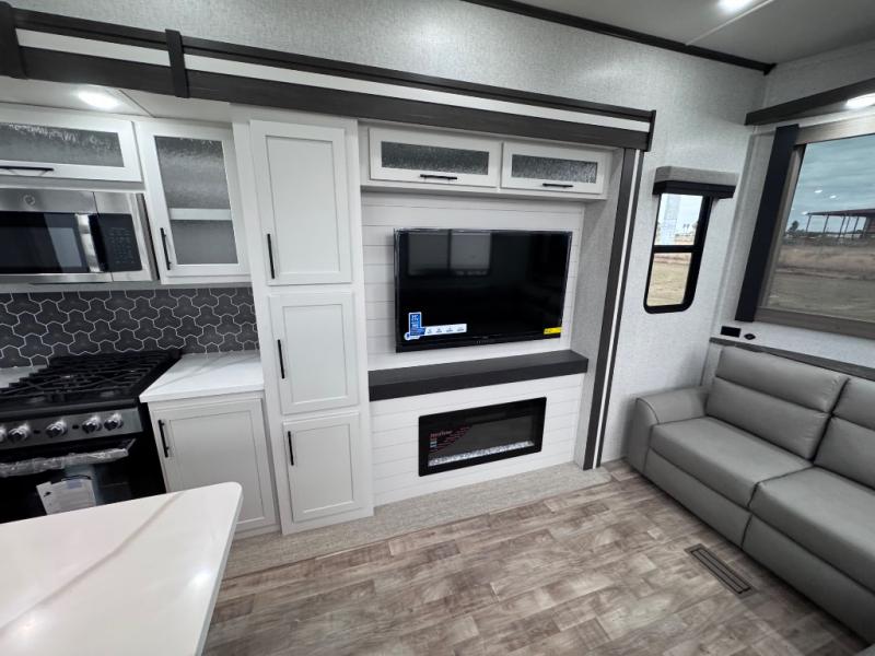 You'll love every minute spent in this spacious destination trailer. There is a front living area with an L-shaped sofa, a 65" TV plus a fireplace to make it feel more like home. You will find a large kitchen island with four stools where you can dine together each day. The kitchen also includes a pantry, closet, hutch, and overhead cabinets for tons of storage space. The full bath includes dual bath sinks and a spacious 48" shower, and right across the hall is a slide out with space for a washer/dryer. Head to the rear private bedroom where you can sleep soundly on the king bed slide out and keep your items organized in the dresser and wardrobes. And outside, you'll find five baggage doors so nothing gets left behind!