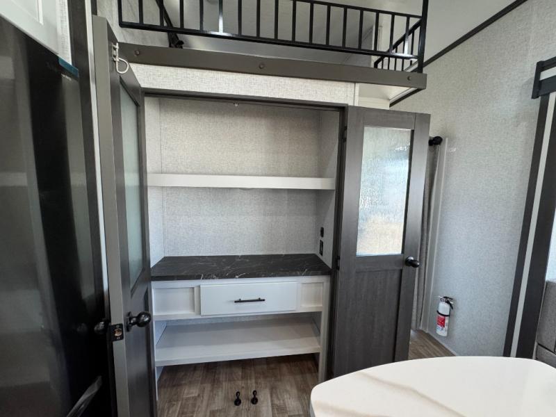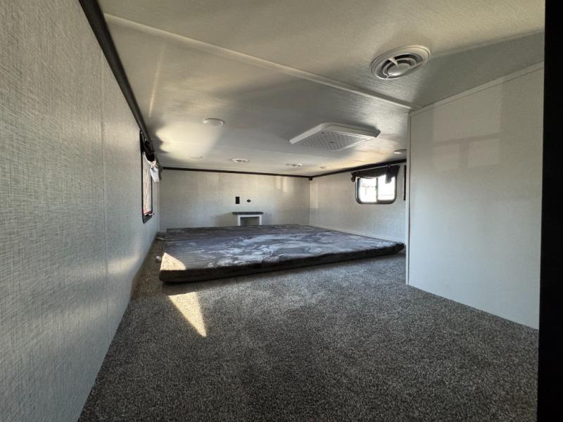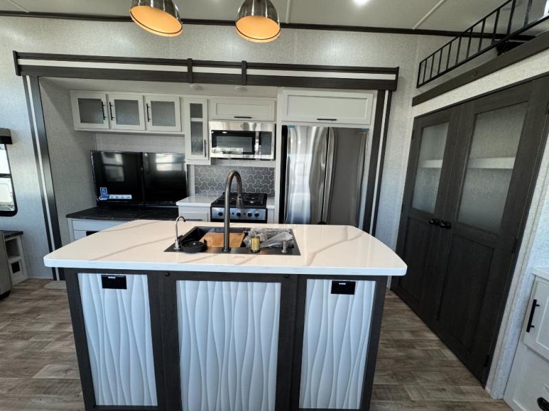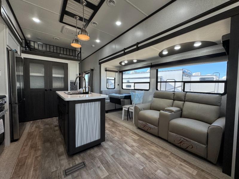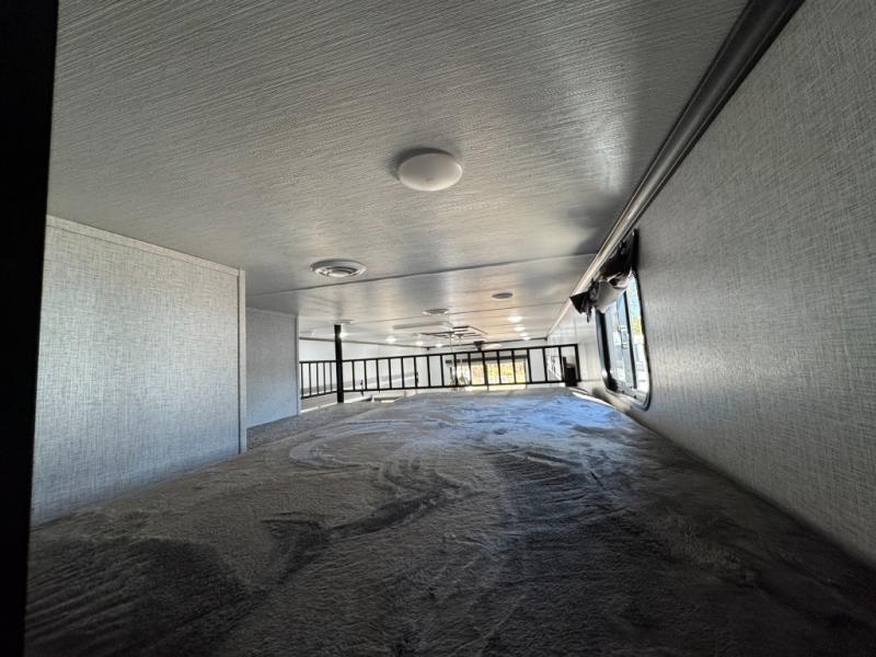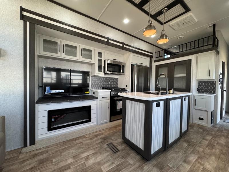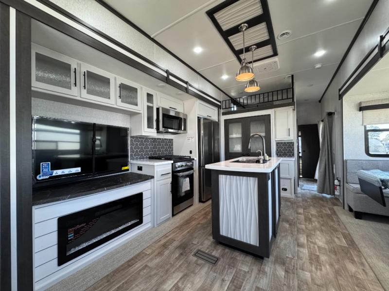 2025 CrossRoads RV Hampton HP375DBL destination trailer: You can comfortably sleep seven people in this destination trailer, so invite more friends along! The little ones are sure to love the loft areas above the bedroom and bathroom. You will have the front private bedroom all to yourselves with a king bed slide out and plenty of space to relax and store your things. If you have any other guests, they can sleep on the hide-a-bed sofa at the back of the trailer. You will find everything you need in this residential kitchen with an island, an Insignia four burner cooktop, plus a double door pantry with shelves. And when your day is over you can relax in the rear living area on the theater seating across from the 50" lift TV and fireplace!