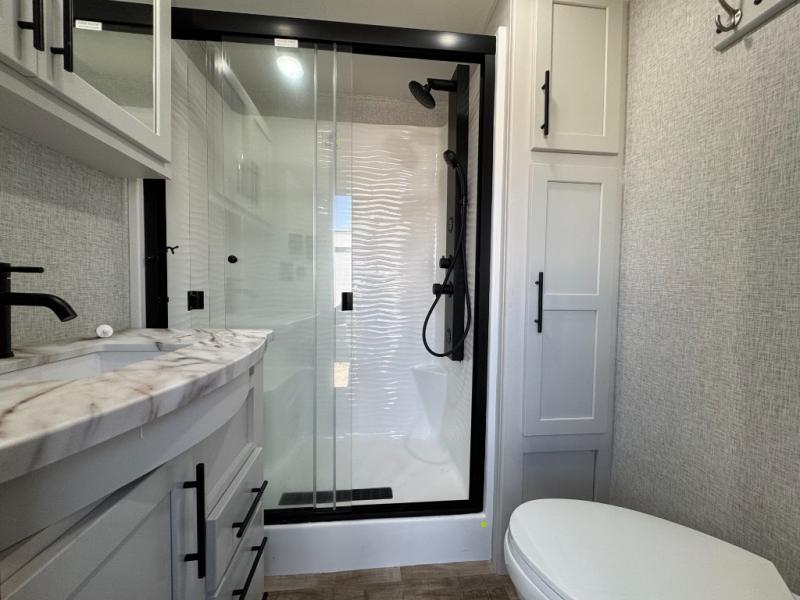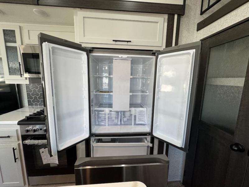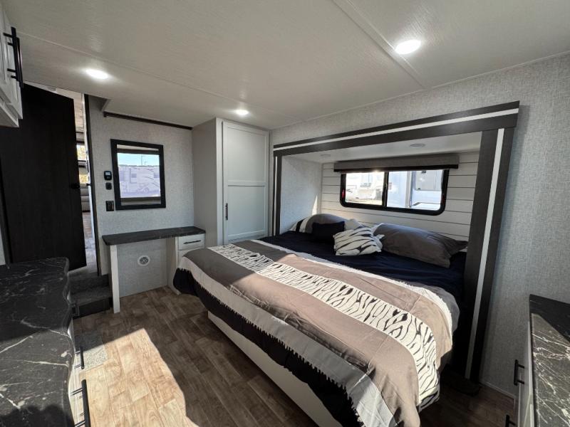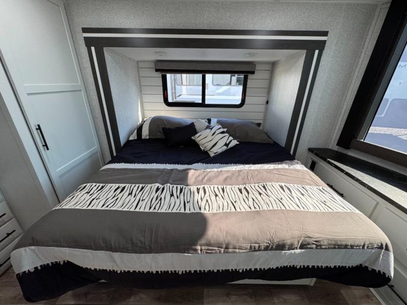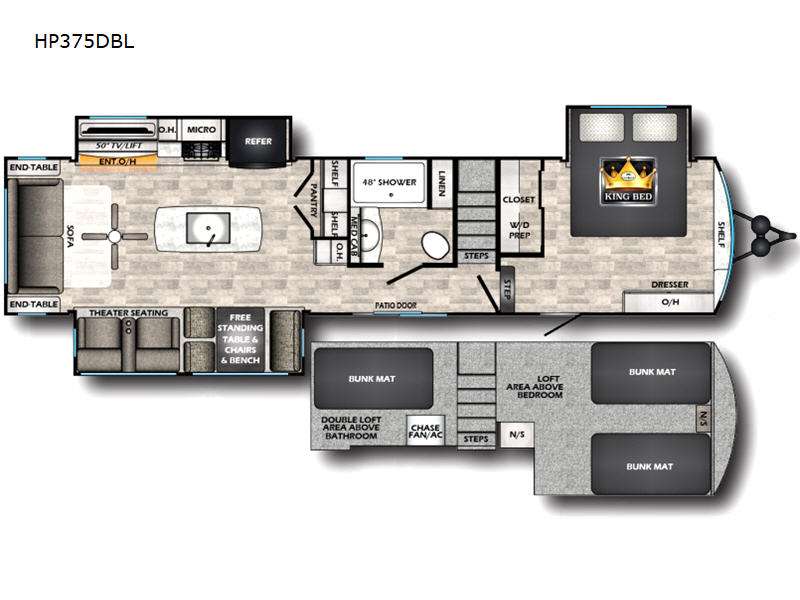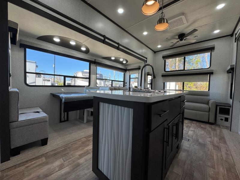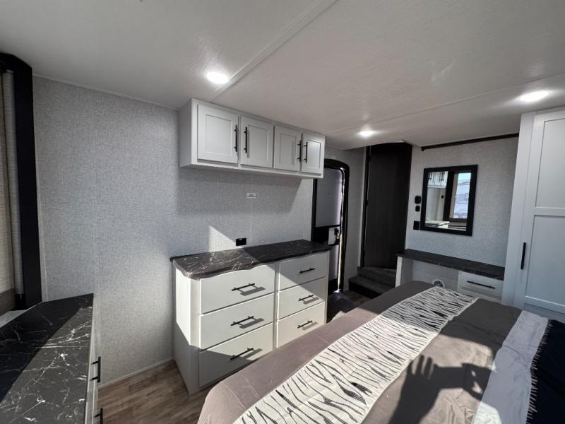 2025 CrossRoads RV Hampton HP375DBL destination trailer: You can comfortably sleep seven people in this destination trailer, so invite more friends along! The little ones are sure to love the loft areas above the bedroom and bathroom. You will have the front private bedroom all to yourselves with a king bed slide out and plenty of space to relax and store your things. If you have any other guests, they can sleep on the hide-a-bed sofa at the back of the trailer. You will find everything you need in this residential kitchen with an island, an Insignia four burner cooktop, plus a double door pantry with shelves. And when your day is over you can relax in the rear living area on the theater seating across from the 50" lift TV and fireplace!