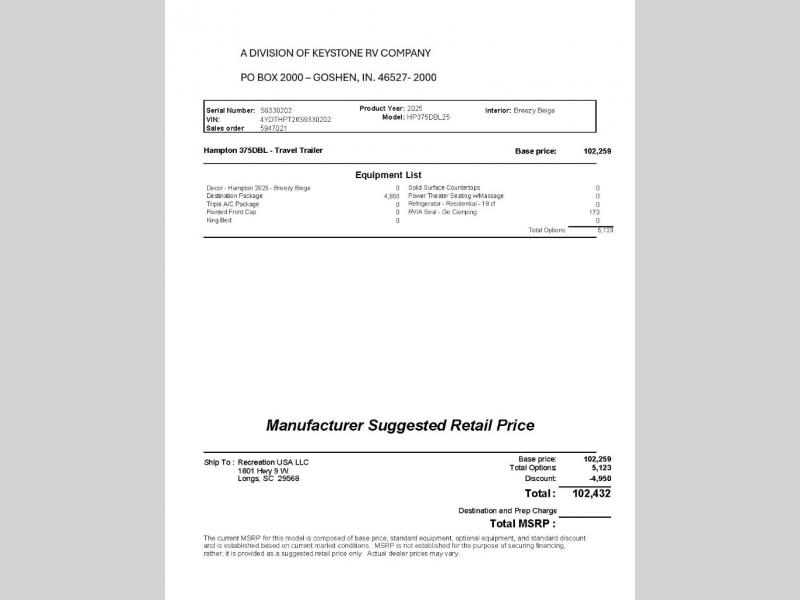 2025 CrossRoads RV Hampton HP375DBL destination trailer highlights:
