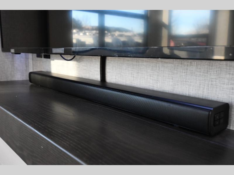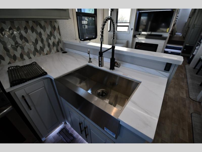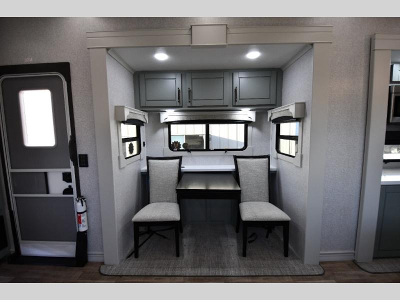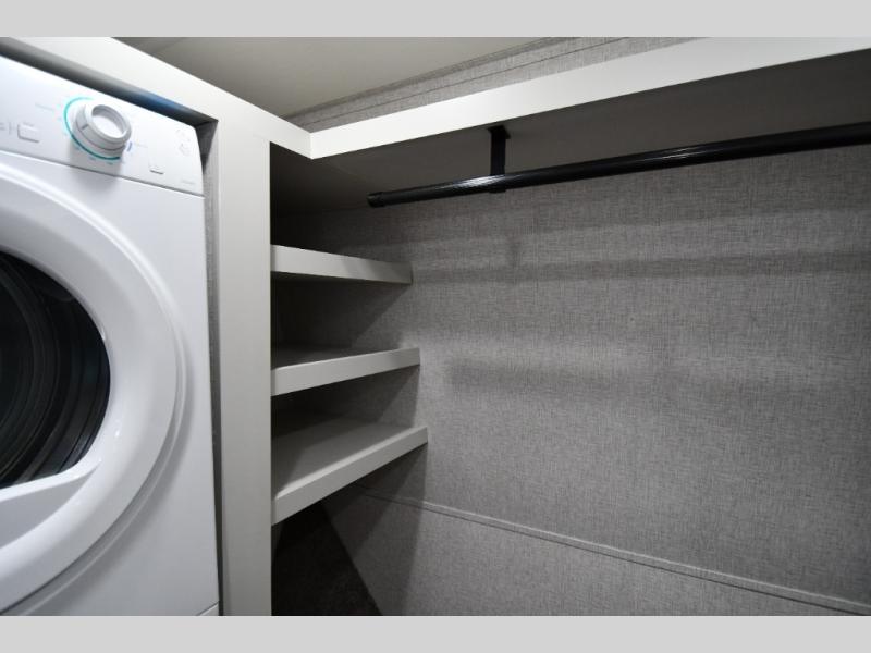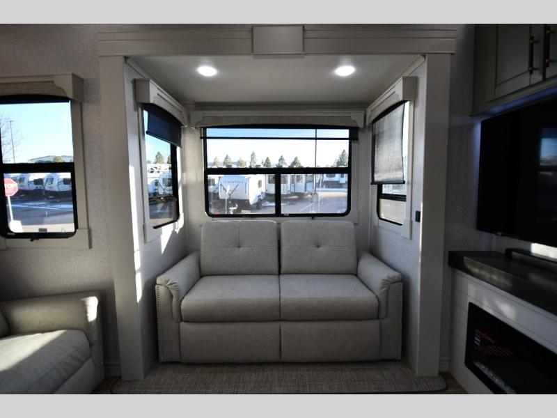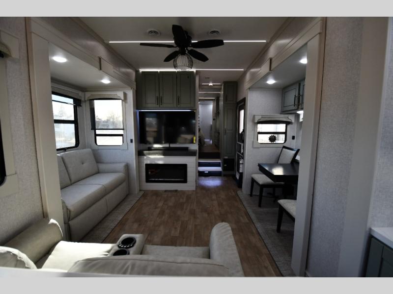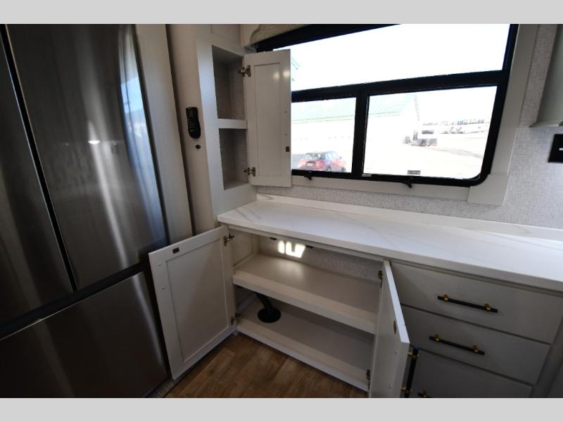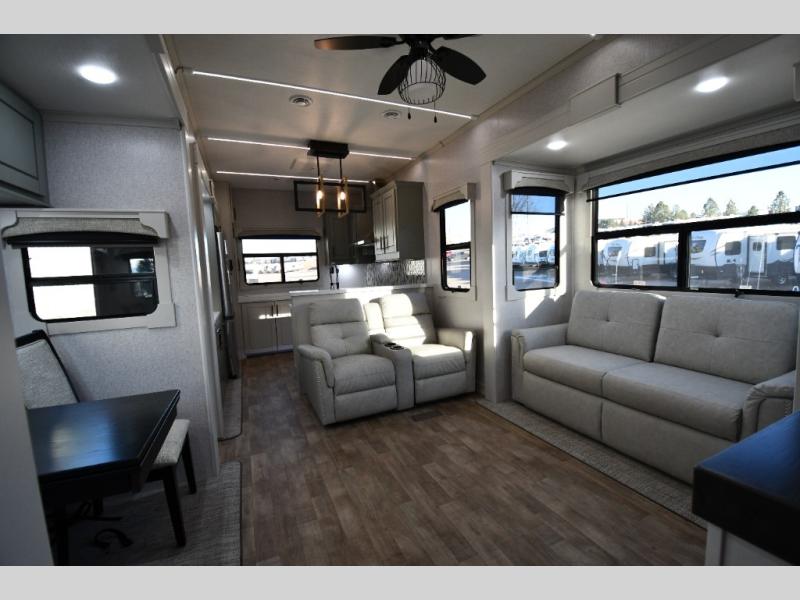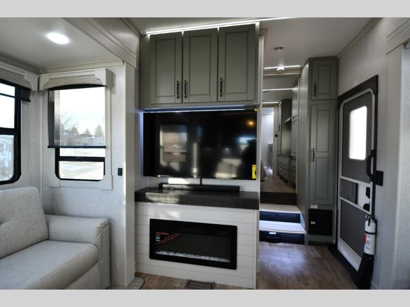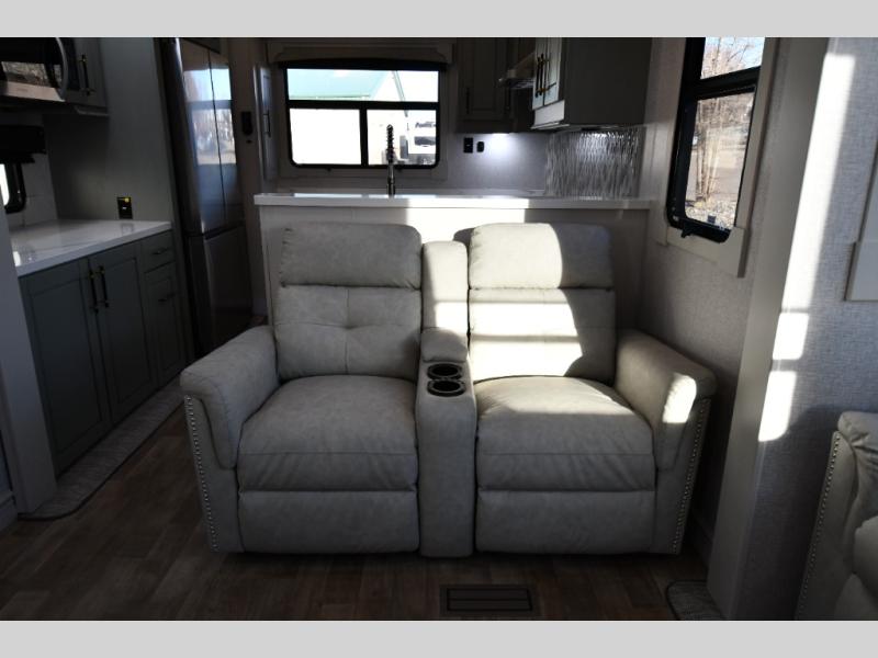 One step inside this fifth wheel and you'll be hooked! You'll love the rear kitchen that includes ample countertop for food prep and a slide including the refrigerator, pantry and microwave for added moving around space. Head to the main living area where you can enjoy some family time on the theater seats, and the dinette with chairs will be the perfect place for a game of cards. The half bath is right off of this room for convenience, and your guests or kids can convert the tri-fold sofa into a bed for sleeping space at night. You will love the master bedroom with a king bed slide out, a dresser with a flip-up lid, plus a 39" TV. The front full bath is super spacious, and it includes a large walk-in wardrobe where you can even add an optional washer and dryer if you choose!