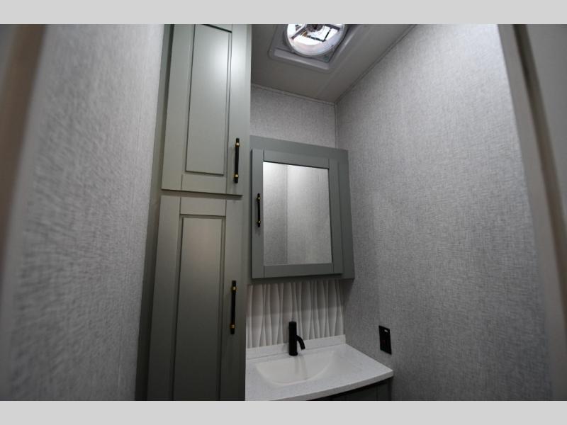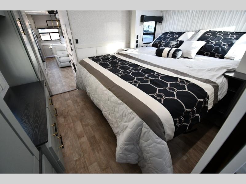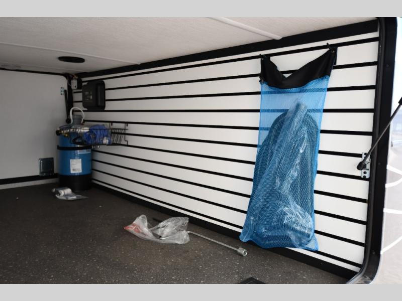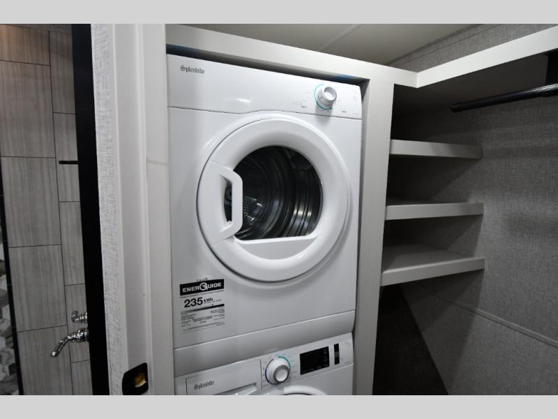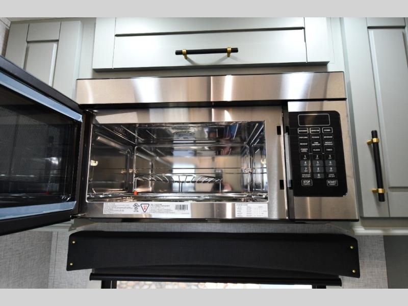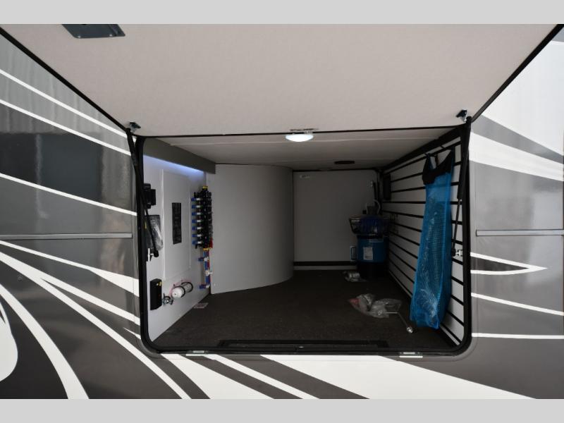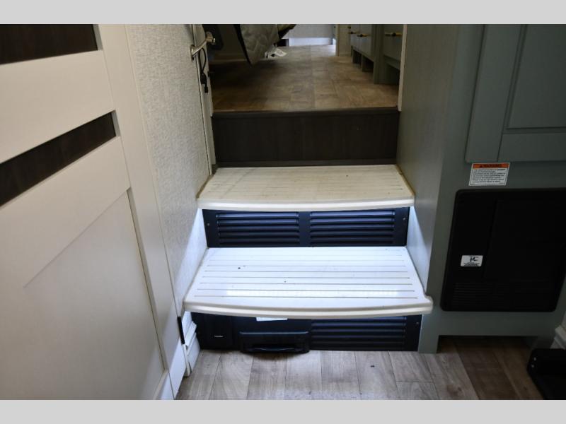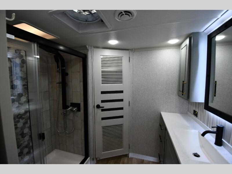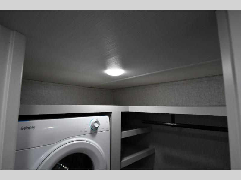 One step inside this fifth wheel and you'll be hooked! You'll love the rear kitchen that includes ample countertop for food prep and a slide including the refrigerator, pantry and microwave for added moving around space. Head to the main living area where you can enjoy some family time on the theater seats, and the dinette with chairs will be the perfect place for a game of cards. The half bath is right off of this room for convenience, and your guests or kids can convert the tri-fold sofa into a bed for sleeping space at night. You will love the master bedroom with a king bed slide out, a dresser with a flip-up lid, plus a 39" TV. The front full bath is super spacious, and it includes a large walk-in wardrobe where you can even add an optional washer and dryer if you choose!