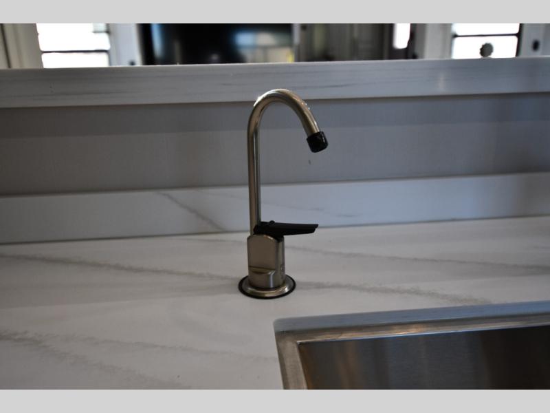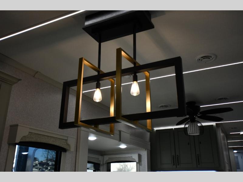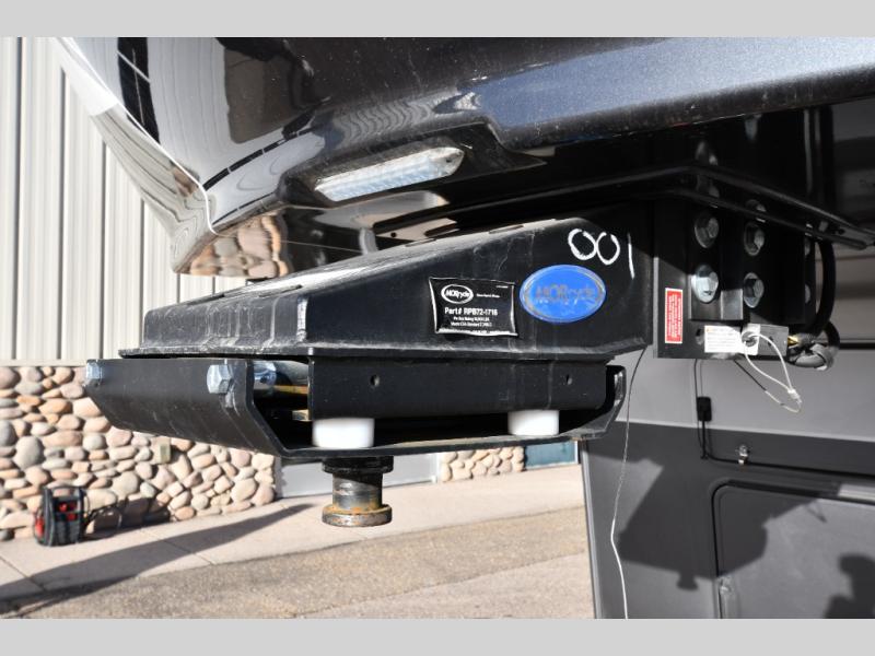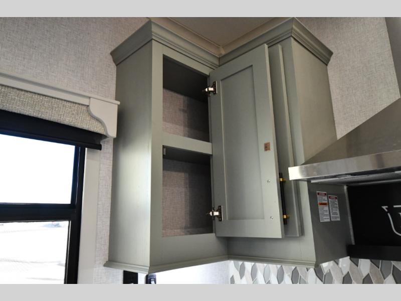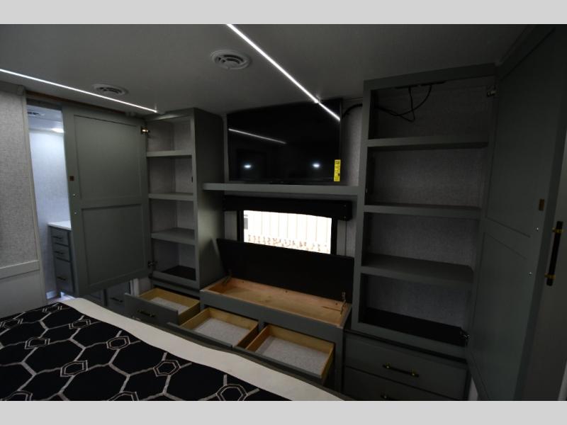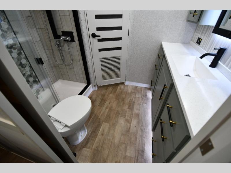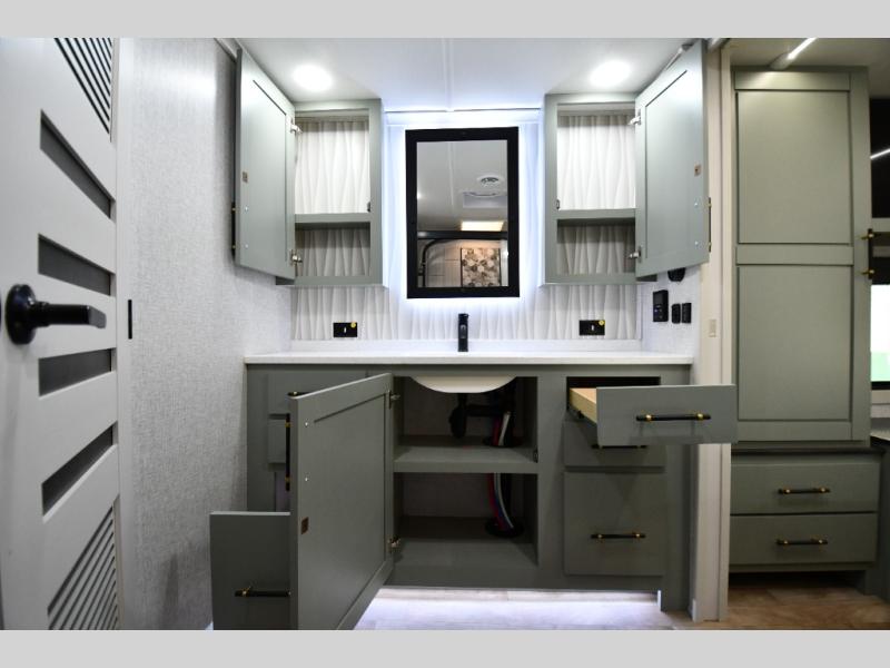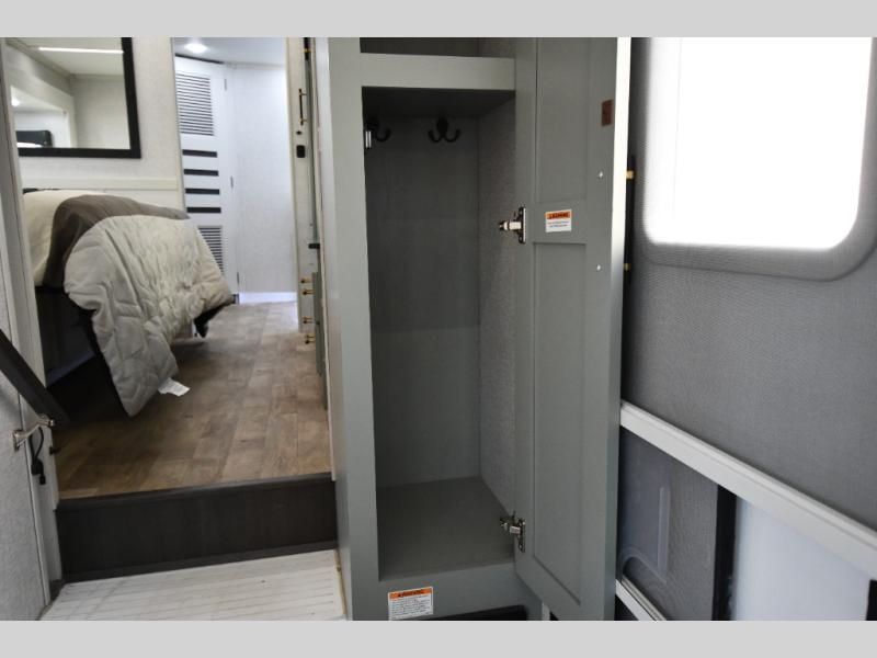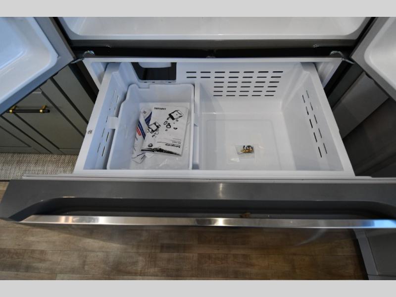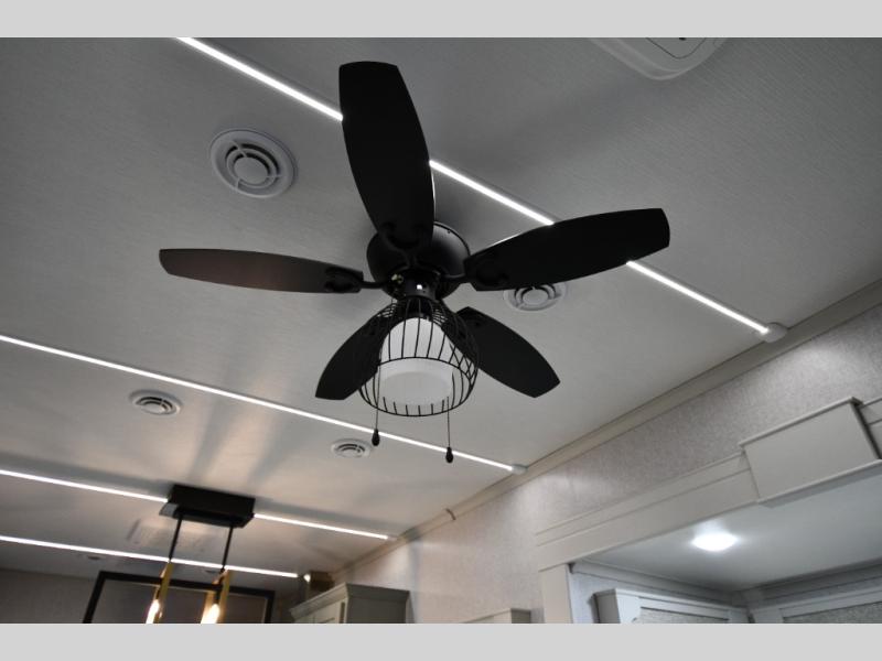 One step inside this fifth wheel and you'll be hooked! You'll love the rear kitchen that includes ample countertop for food prep and a slide including the refrigerator, pantry and microwave for added moving around space. Head to the main living area where you can enjoy some family time on the theater seats, and the dinette with chairs will be the perfect place for a game of cards. The half bath is right off of this room for convenience, and your guests or kids can convert the tri-fold sofa into a bed for sleeping space at night. You will love the master bedroom with a king bed slide out, a dresser with a flip-up lid, plus a 39" TV. The front full bath is super spacious, and it includes a large walk-in wardrobe where you can even add an optional washer and dryer if you choose!