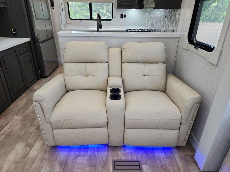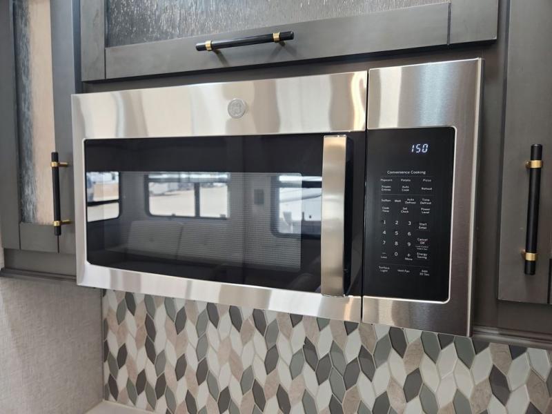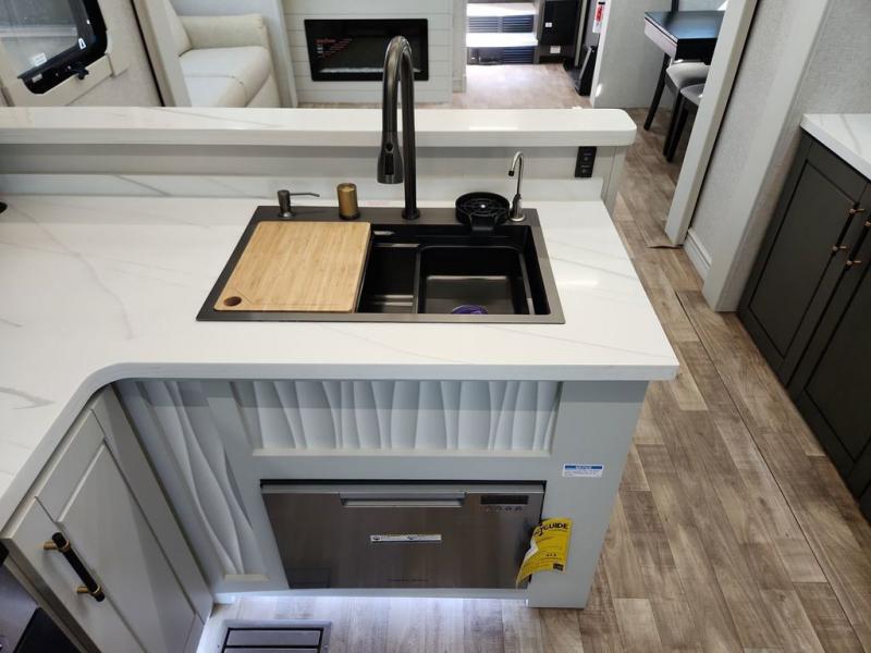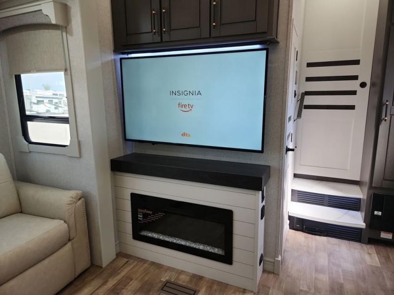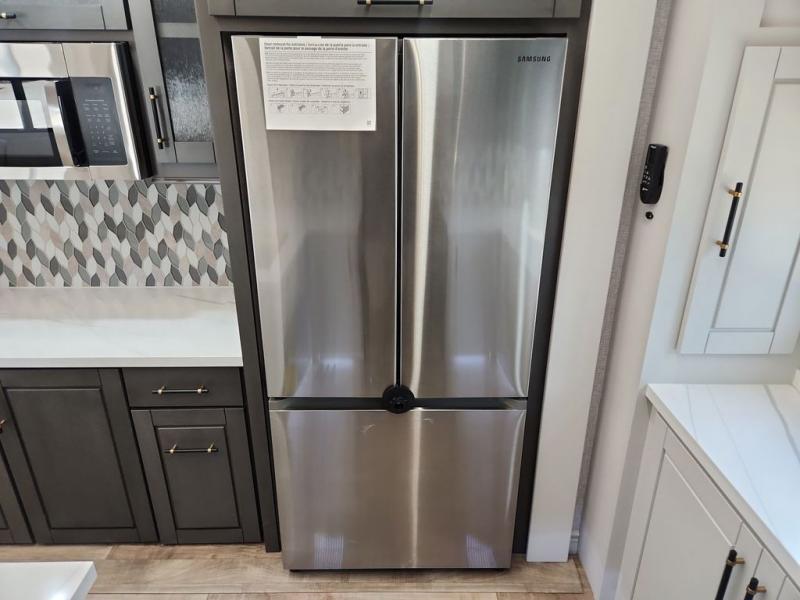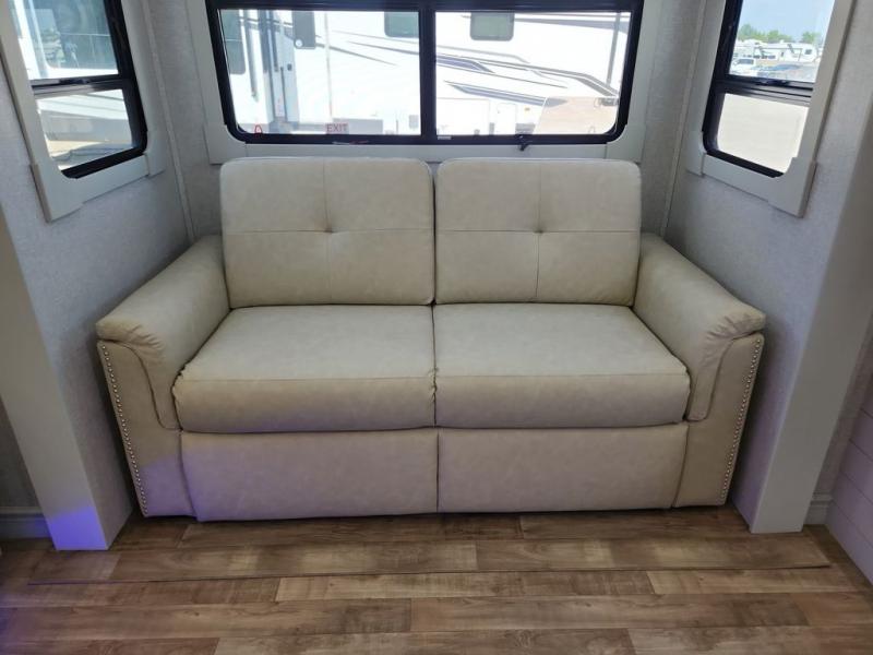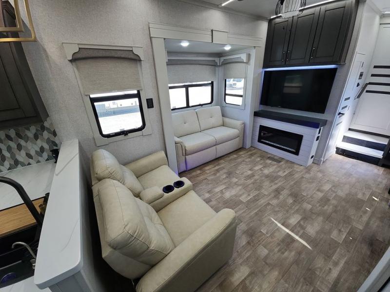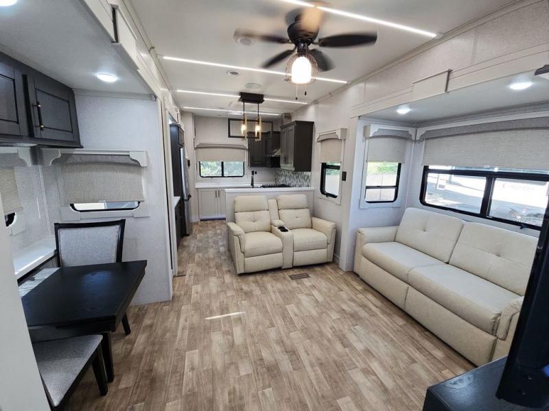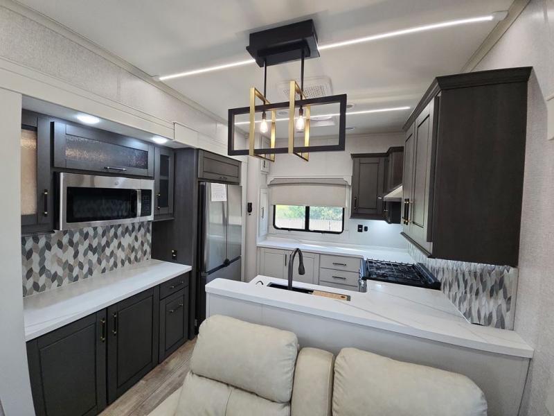 One step inside this fifth wheel and you'll be hooked! You'll love the rear kitchen that includes ample countertop for food prep and a slide including the refrigerator, pantry and microwave for added moving around space. Head to the main living area where you can enjoy some family time on the theater seats, and the dinette with chairs will be the perfect place for a game of cards. The half bath is right off of this room for convenience, and your guests or kids can convert the tri-fold sofa into a bed for sleeping space at night. You will love the master bedroom with a king bed slide out, a dresser with a flip-up lid, plus a 39" TV. The front full bath is super spacious, and it includes a large walk-in wardrobe where you can even add an optional washer and dryer if you choose!
