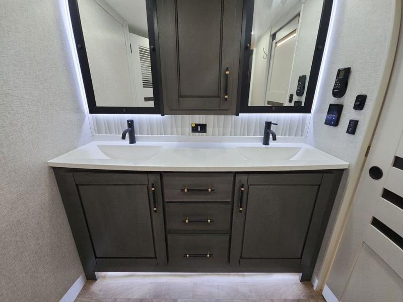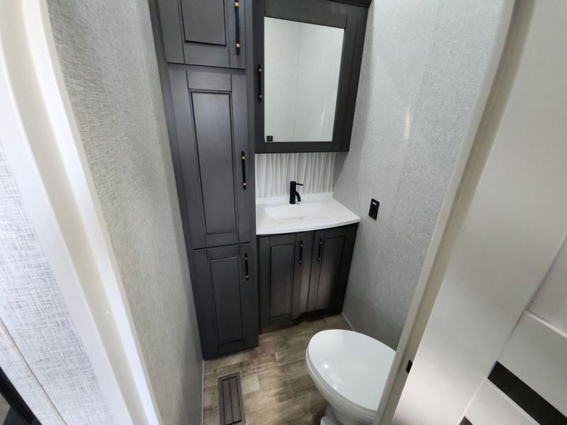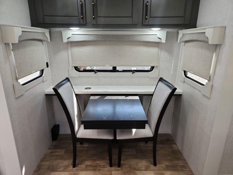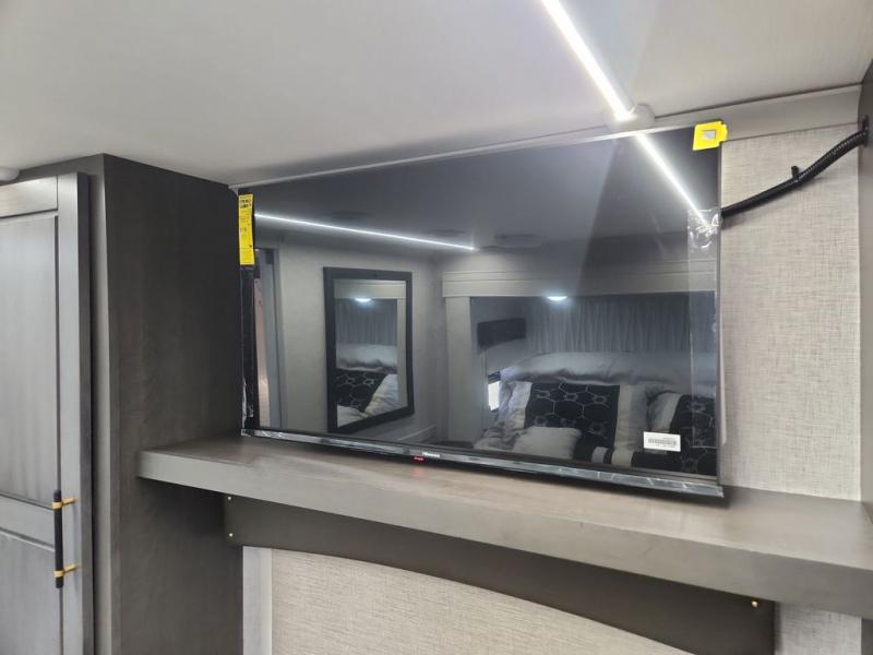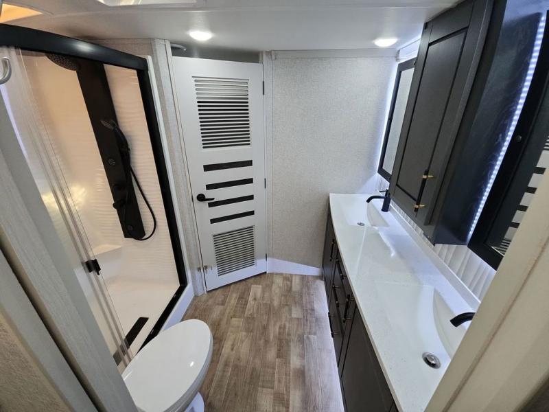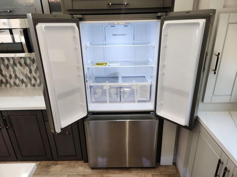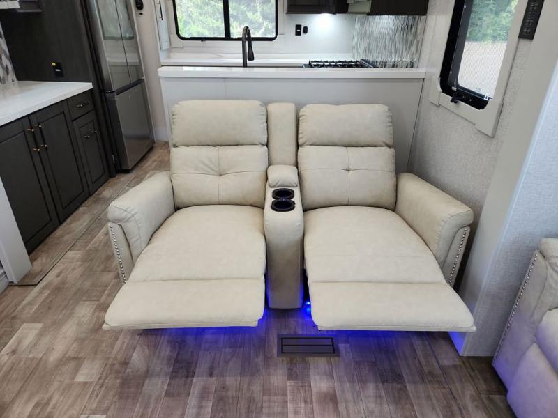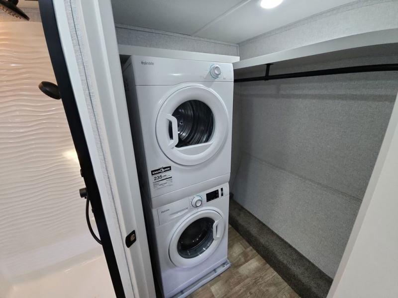 One step inside this fifth wheel and you'll be hooked! You'll love the rear kitchen that includes ample countertop for food prep and a slide including the refrigerator, pantry and microwave for added moving around space. Head to the main living area where you can enjoy some family time on the theater seats, and the dinette with chairs will be the perfect place for a game of cards. The half bath is right off of this room for convenience, and your guests or kids can convert the tri-fold sofa into a bed for sleeping space at night. You will love the master bedroom with a king bed slide out, a dresser with a flip-up lid, plus a 39" TV. The front full bath is super spacious, and it includes a large walk-in wardrobe where you can even add an optional washer and dryer if you choose!