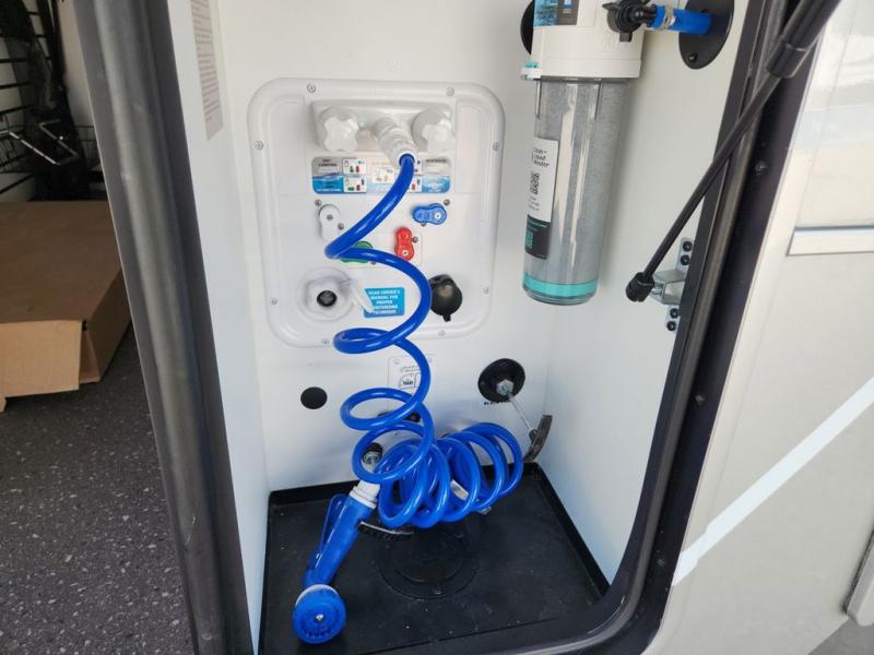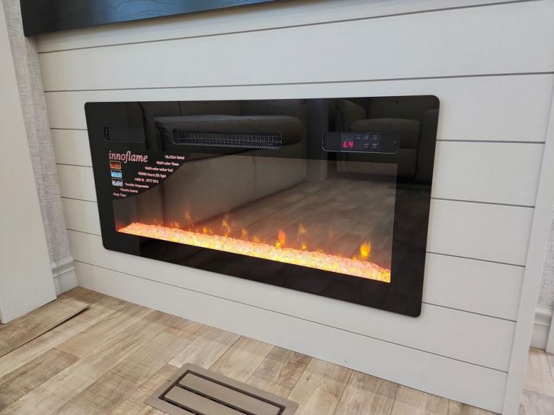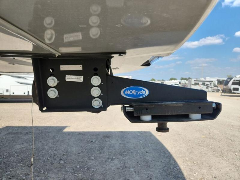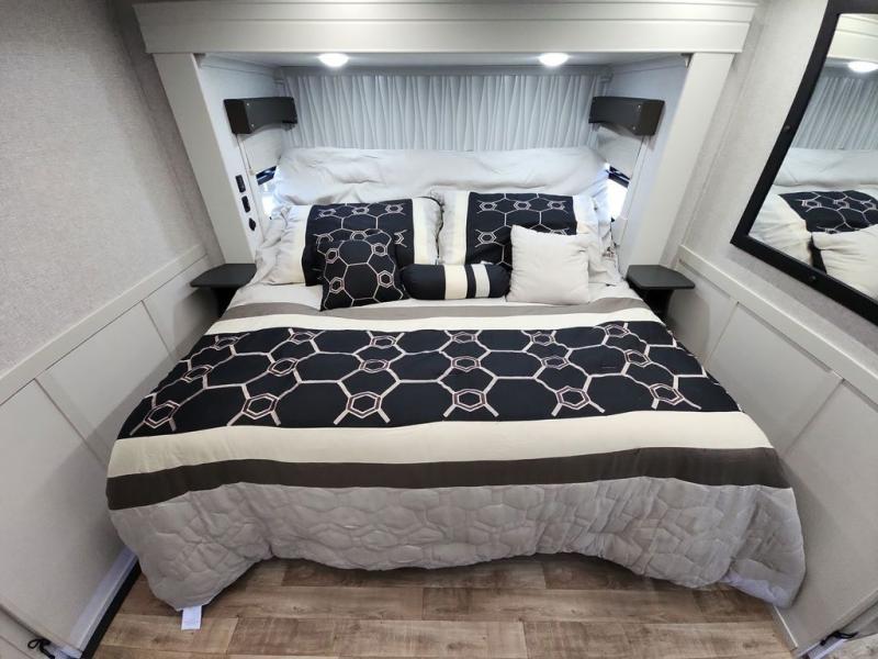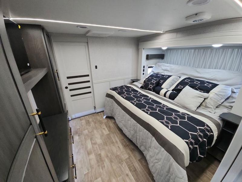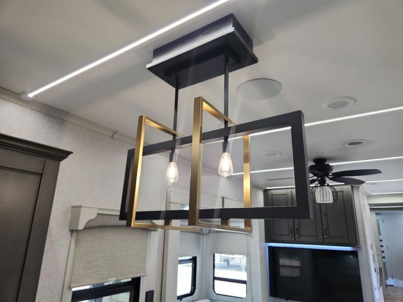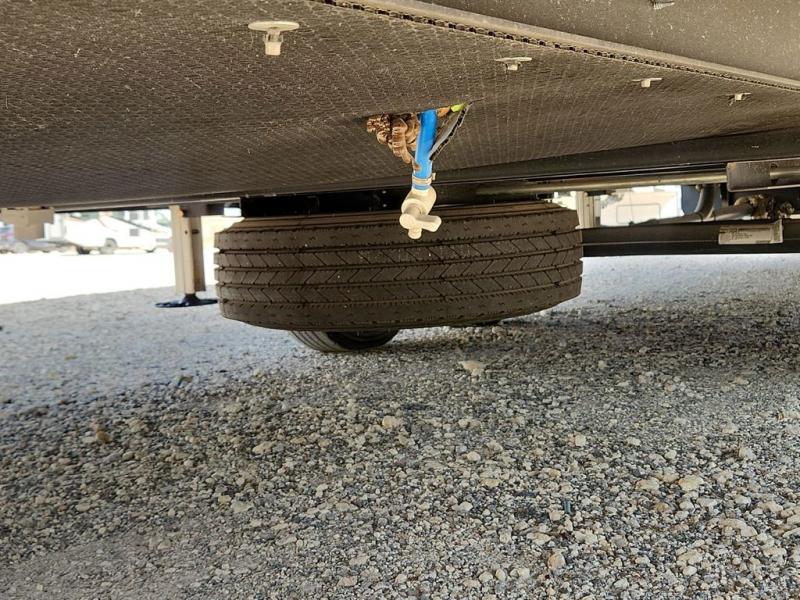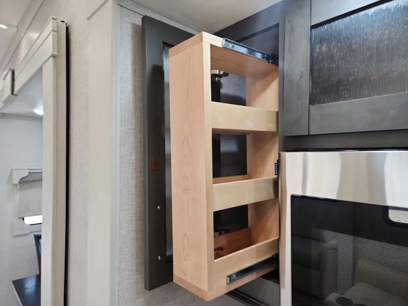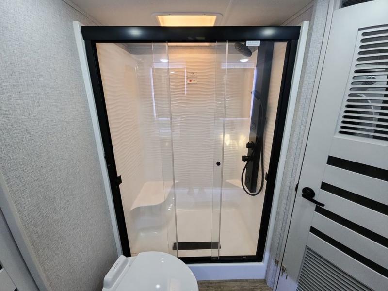 One step inside this fifth wheel and you'll be hooked! You'll love the rear kitchen that includes ample countertop for food prep and a slide including the refrigerator, pantry and microwave for added moving around space. Head to the main living area where you can enjoy some family time on the theater seats, and the dinette with chairs will be the perfect place for a game of cards. The half bath is right off of this room for convenience, and your guests or kids can convert the tri-fold sofa into a bed for sleeping space at night. You will love the master bedroom with a king bed slide out, a dresser with a flip-up lid, plus a 39" TV. The front full bath is super spacious, and it includes a large walk-in wardrobe where you can even add an optional washer and dryer if you choose!