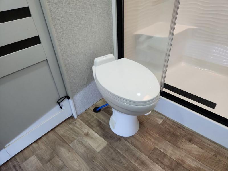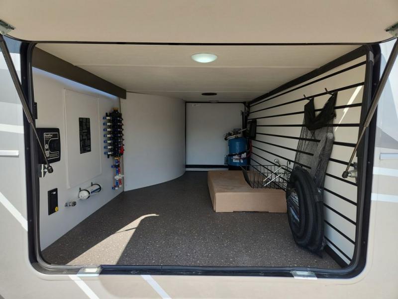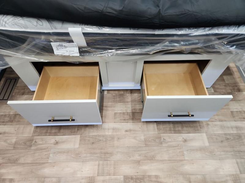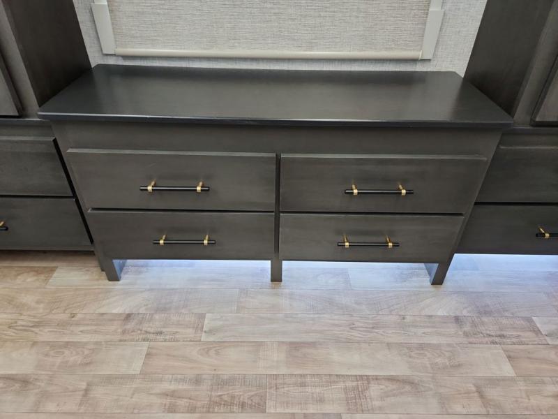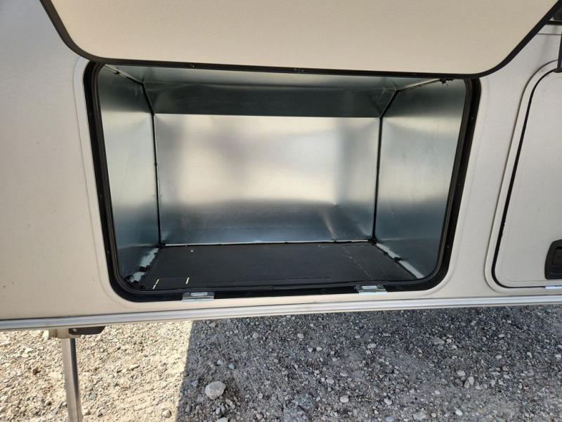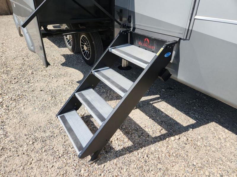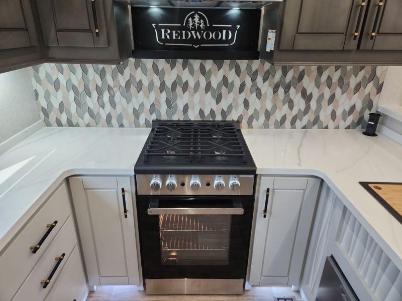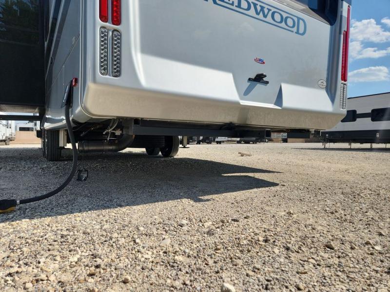 You are going to wish you found the Redwood fifth wheels sooner! With all of the residential comfort and modern luxury, you will be impressed. The Williamsburg Furniture Collection includes two premium dinette chairs, a buffet-style adjustable dinette with leaf extension, a residential-style sofa, and powered theater seating. The luxury further extends to the bedroom where you will find a gel-foam king bed with tilt and C-PAP shelves on both sides of the bed. The straight roof line gives a luxury profile, and there are preparations for a wireless backup camera as well as solar power. The seamless residential insulated heat ducts will efficiently heat your unit, and there is an exterior radio in the fully finished and heated pass-through with slat board storage.